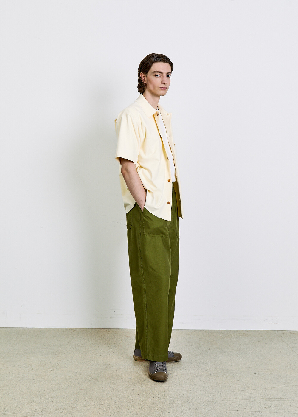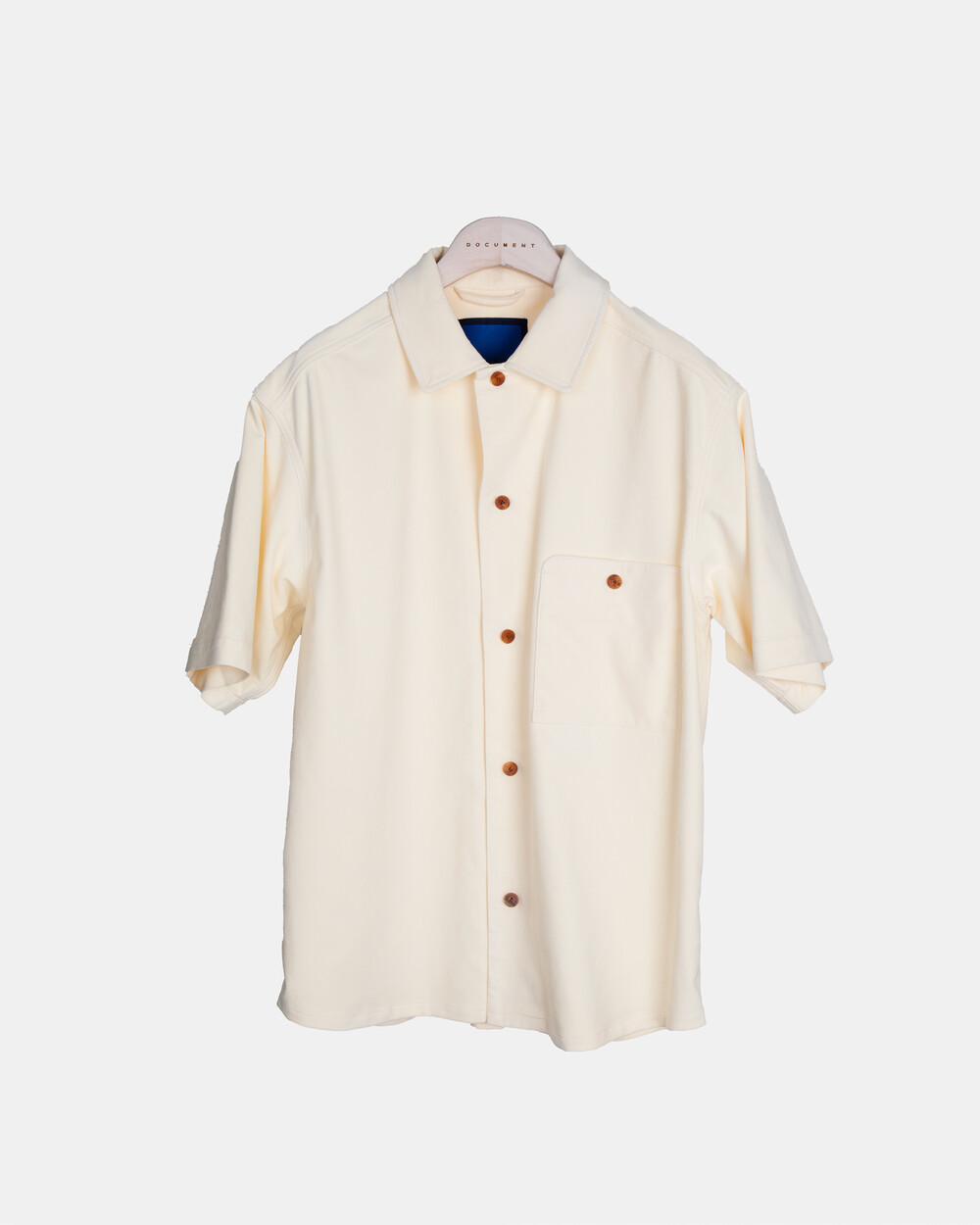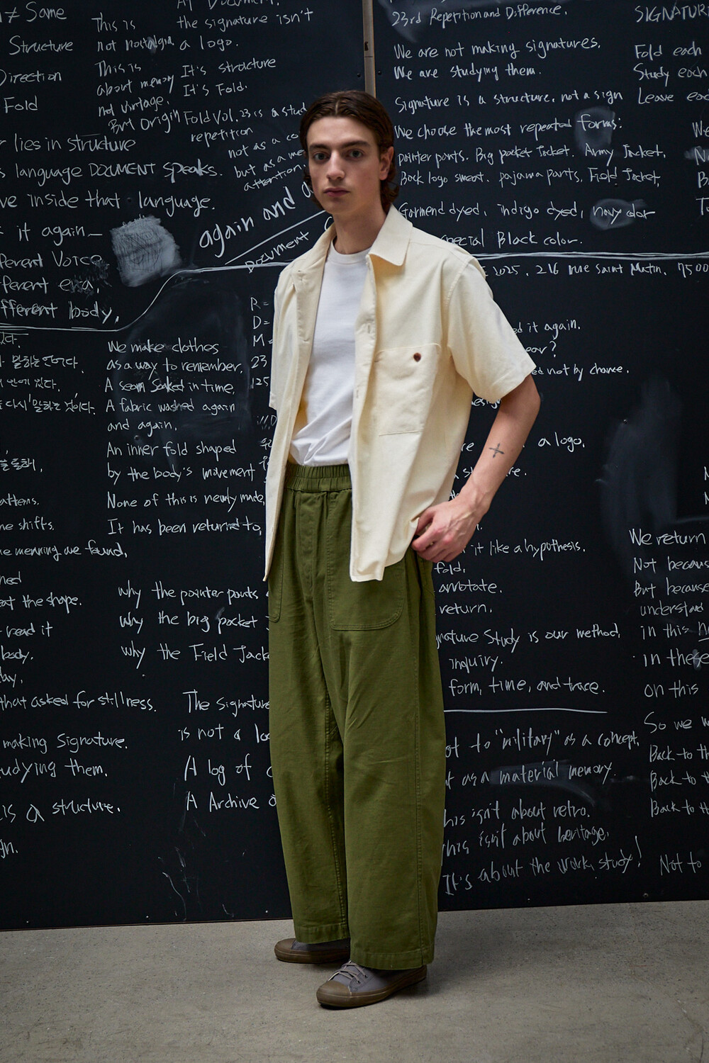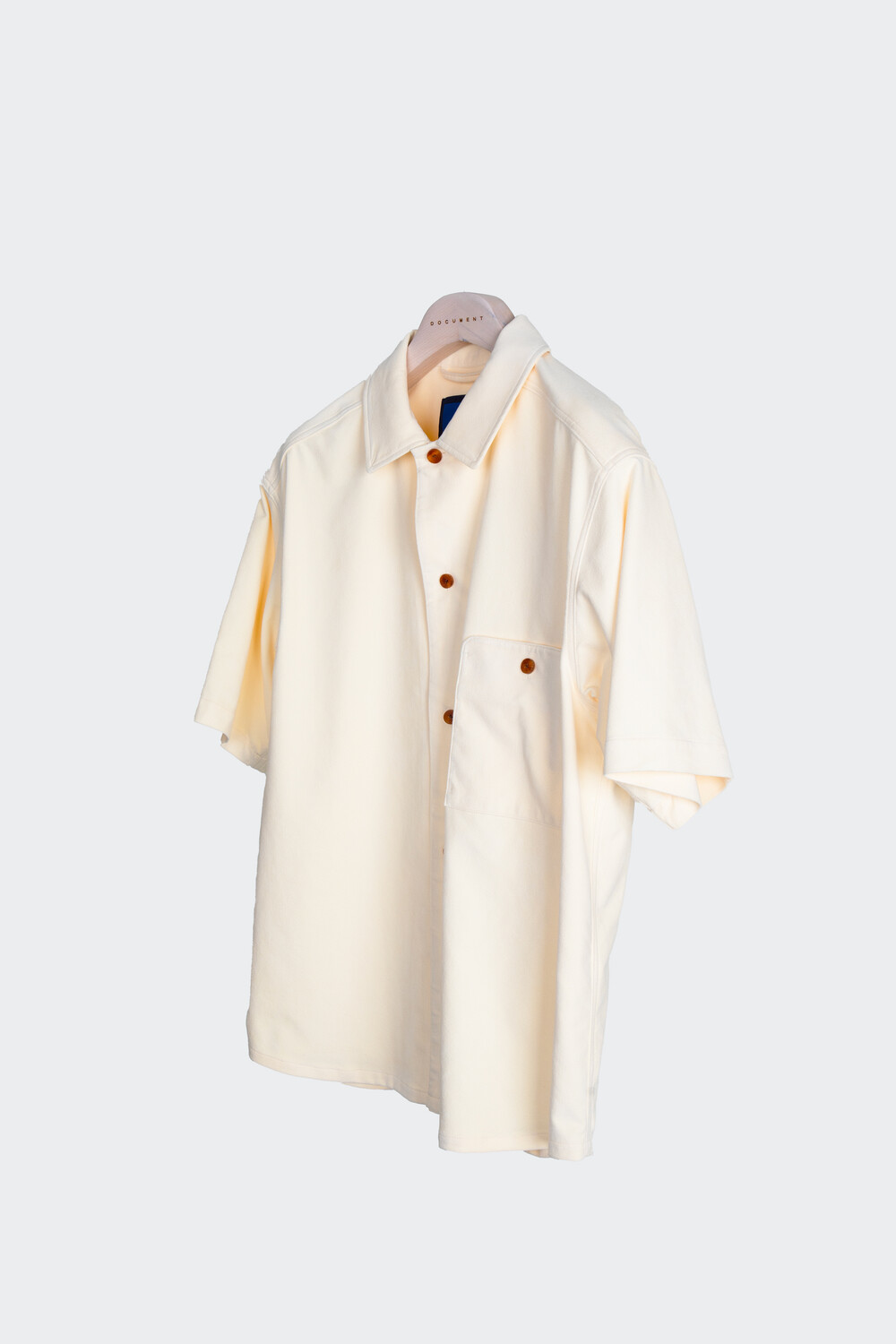 여유 있게 떨어지는 실루엣과 단정한 칼라, 한쪽 가슴 포켓의 균형이 담백한 인상을 만들며, 전체적으로 힘을 뺀 구조 안에서 조용한 디테일이 드러납니다.