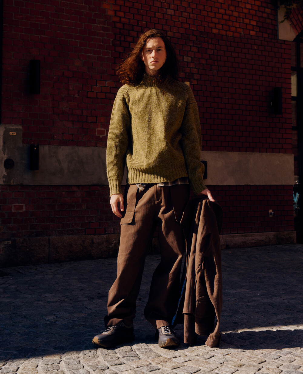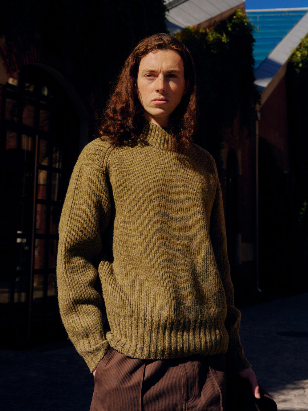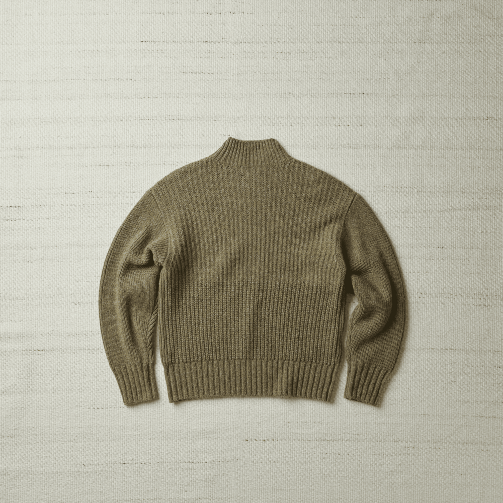 A modern reinterpretation of the traditional Irish fisherman sweater, a fisherman knit reborn with the unique sensibility of Document and FFC. Two-toned Shetland wool yarns are delicately woven to create a natural depth and unique texture, while the separate knitting method for the front and back creates an understated, individual look. The signature panelless detailing, expressed through knitting, and the effortlessly elevated mock neck gently hug the neckline. This sweater, worn alone or as an undergarment, quietly embraces the winter air.