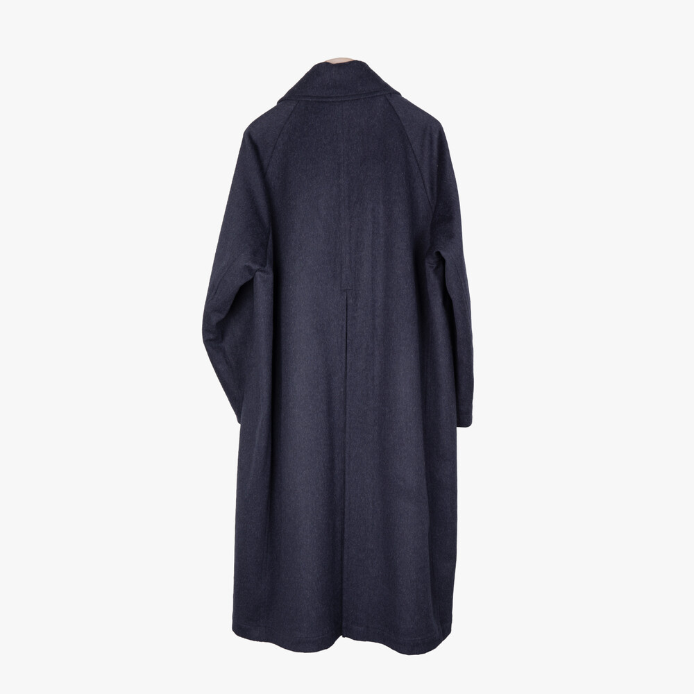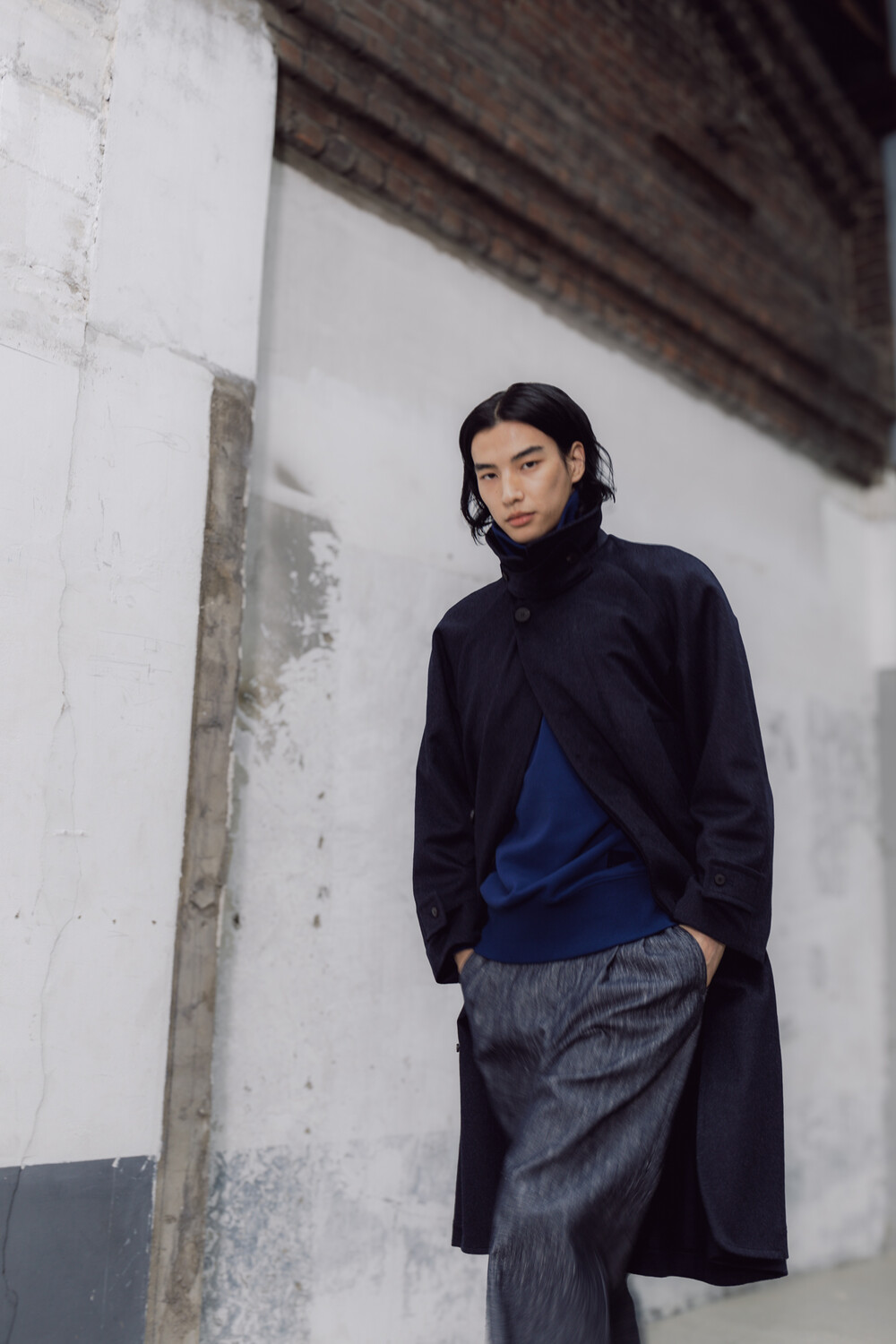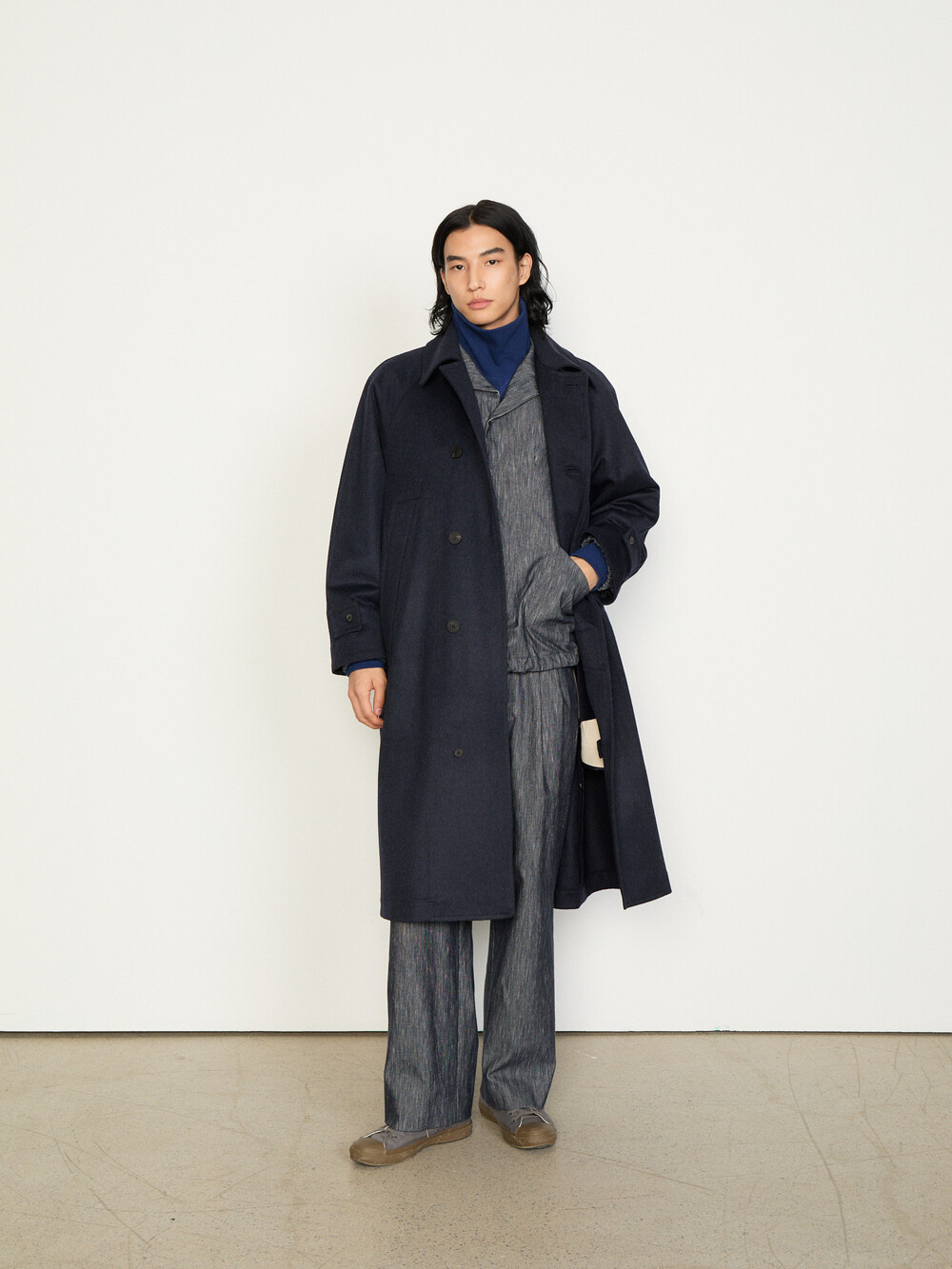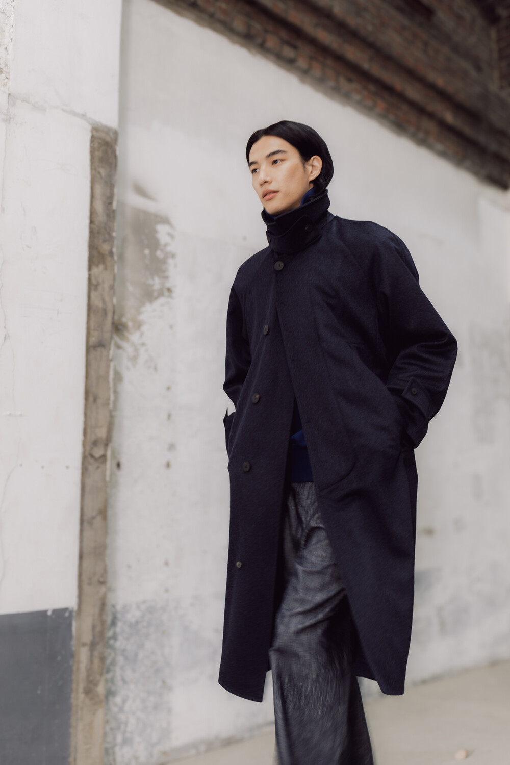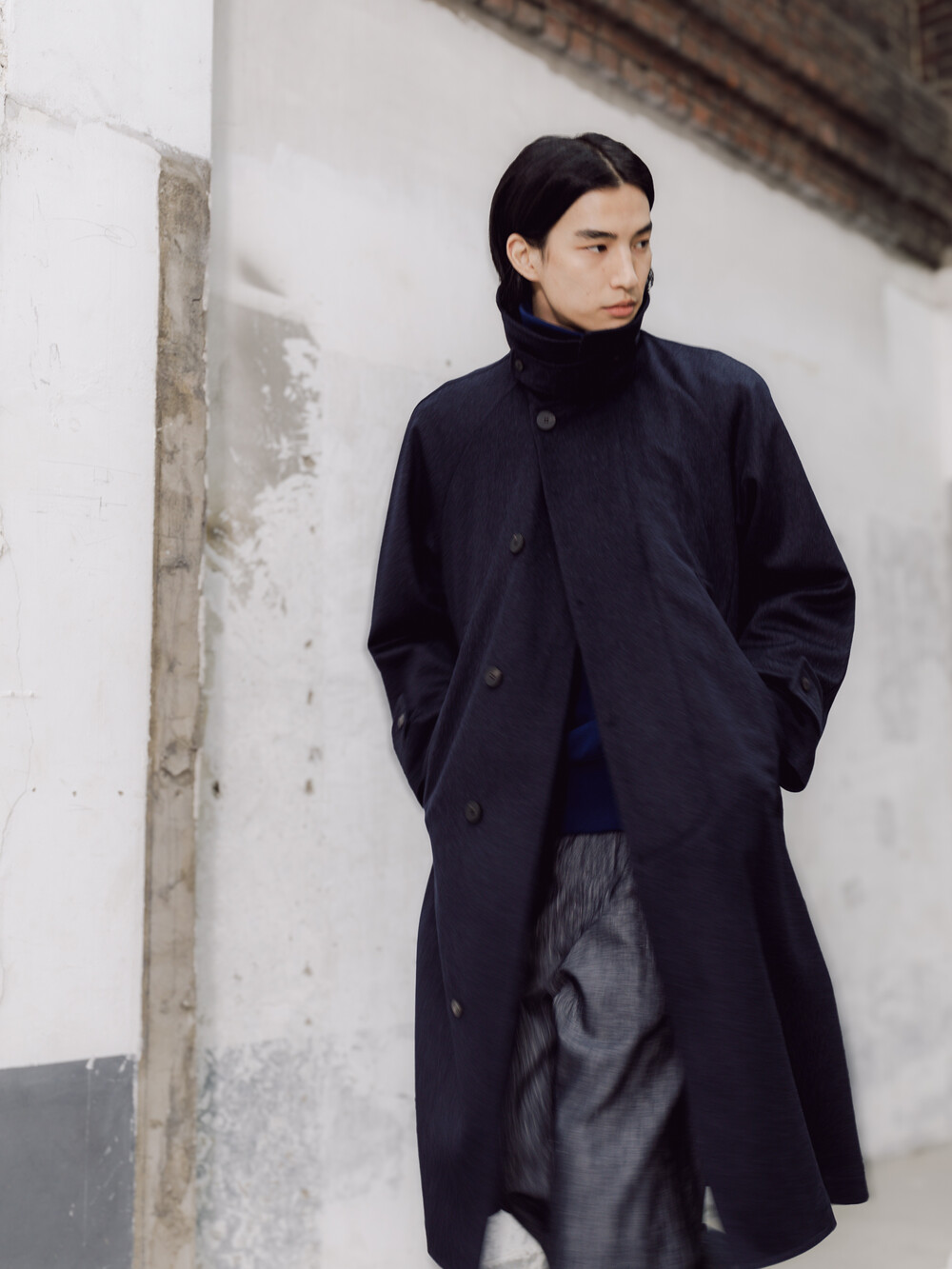 A long coat with a gentle A-line silhouette that drapes gracefully with movement.The back inverted pleat adds fluidity and ease,creating a quiet rhythm between structure and flow.