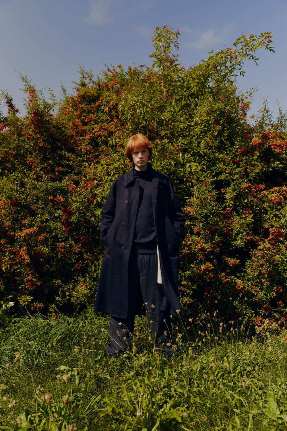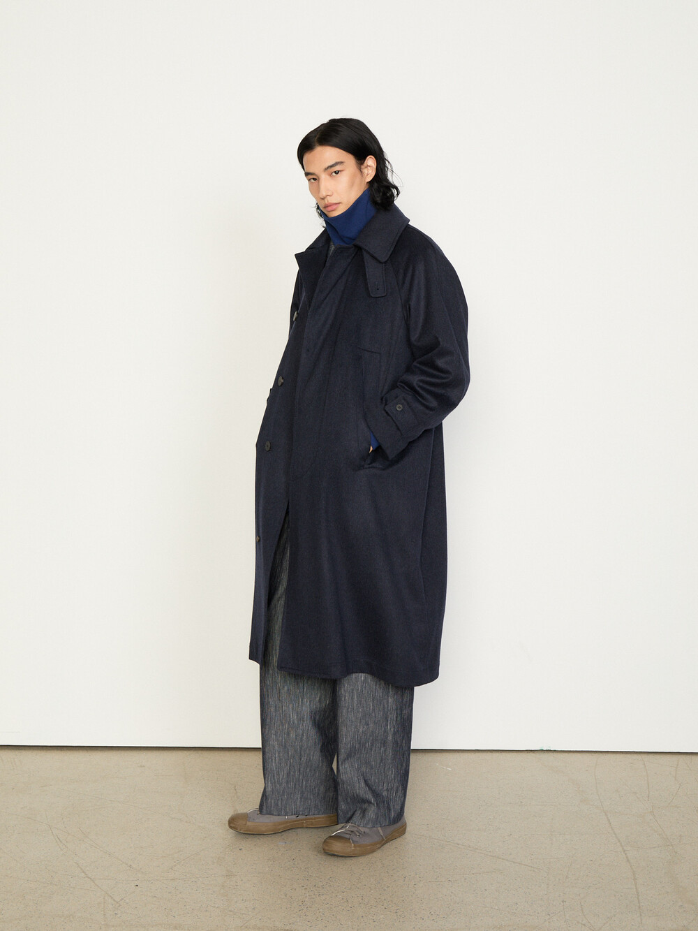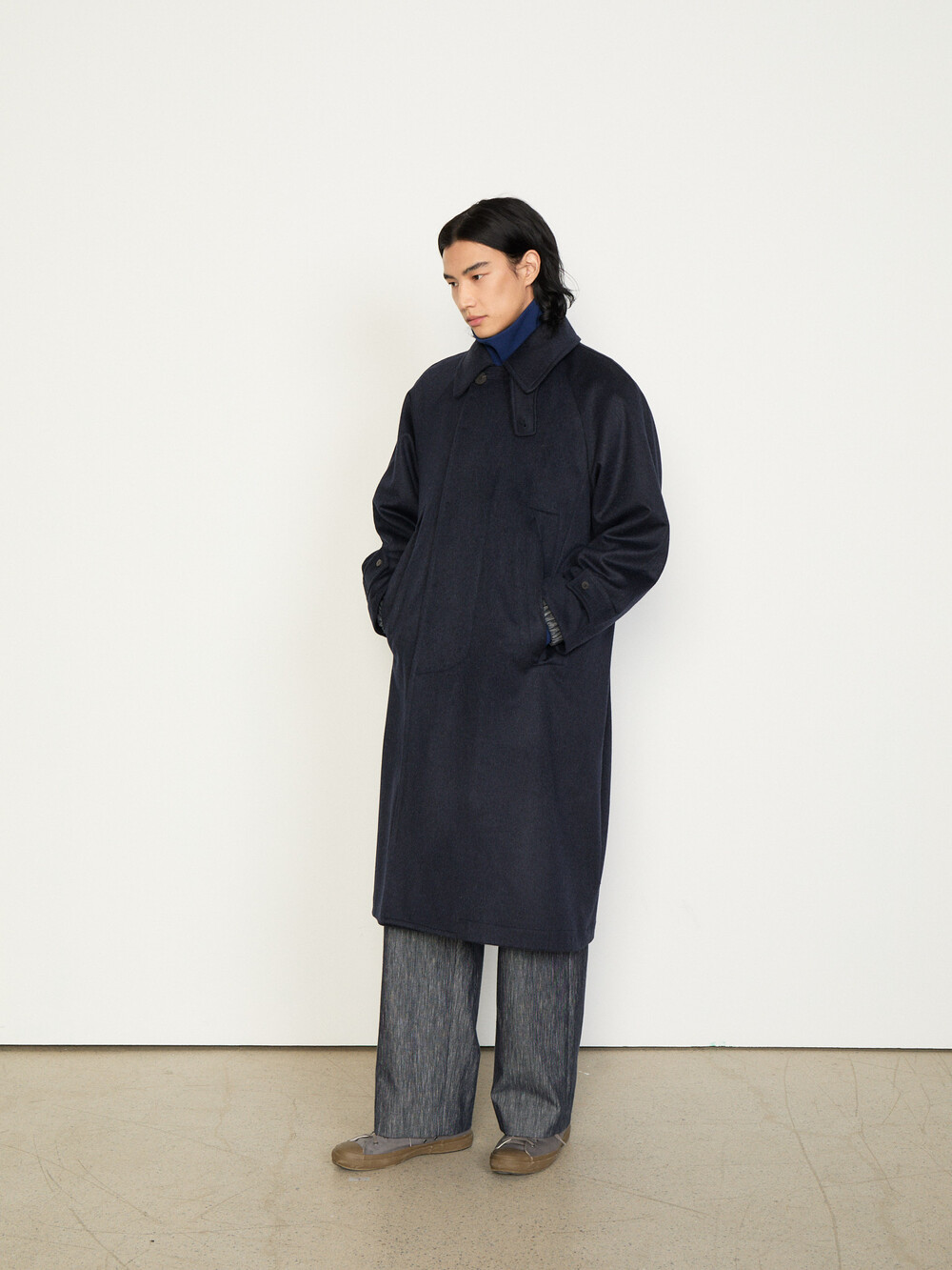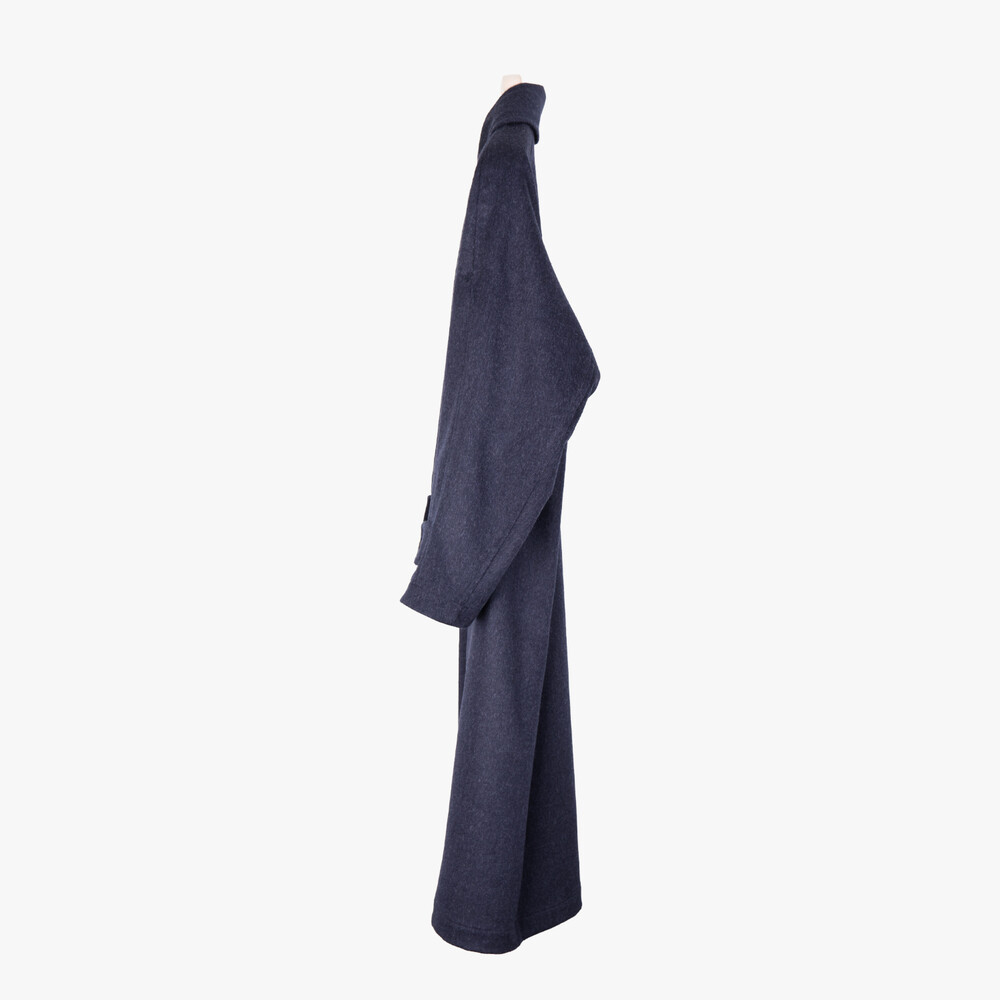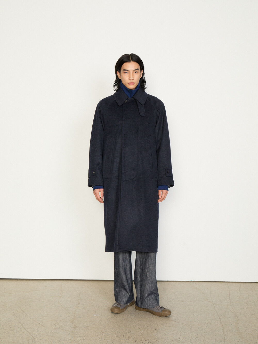 A long coat with a gentle A-line silhouette that drapes gracefully with movement.The back inverted pleat adds fluidity and ease,creating a quiet rhythm between structure and flow.