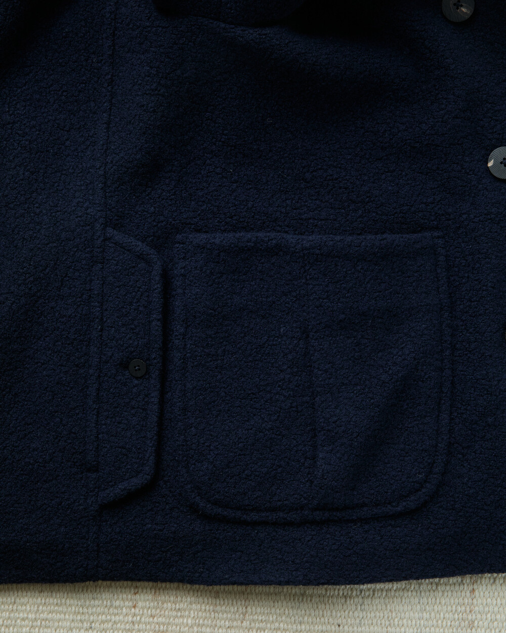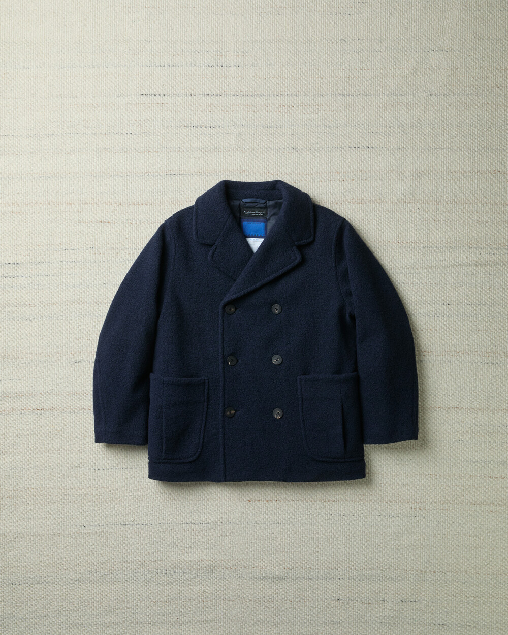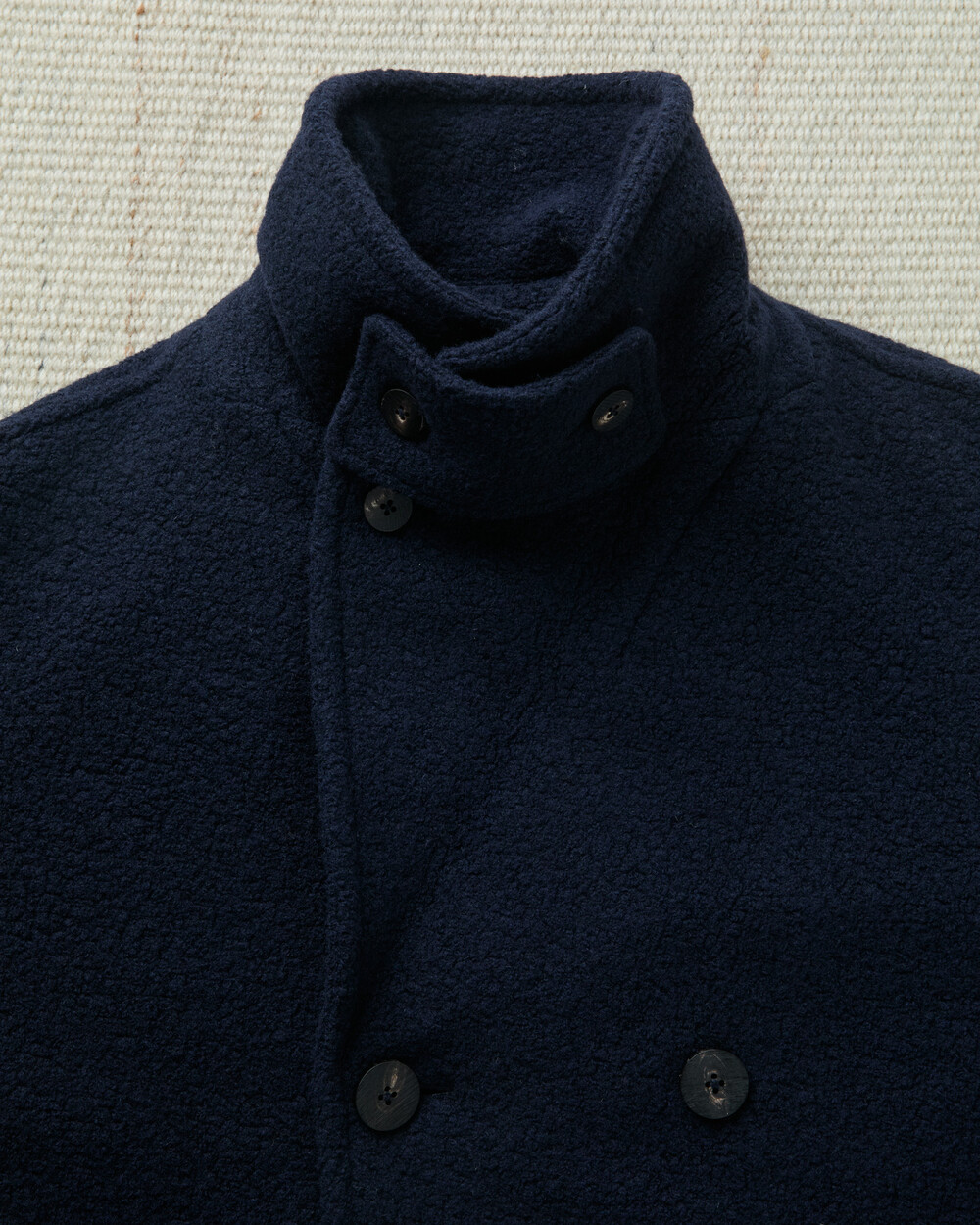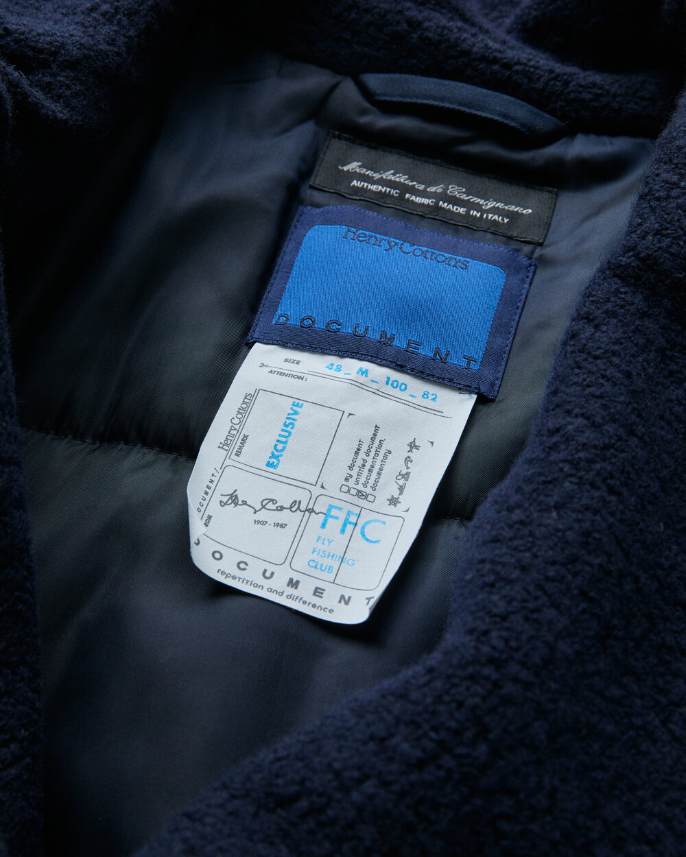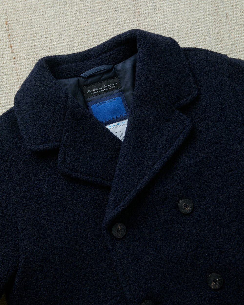도큐먼트와 FFC의 협업으로 완성된 울 패디드 피코트.이탈리아 Manifattura di Carmignano의 울 59%, 나일론 21%, 폴리에스터 16%, 알파카 4% 혼방(480g) 원단으로 제작되었습니다.부클레(Bouclé) 특유의 입체적 질감과 깊이 있는 표면감이 돋보이며, 신축성이 있는 원단과 여유 있는 실루엣으로 편안한 착용감을 제공합니다.