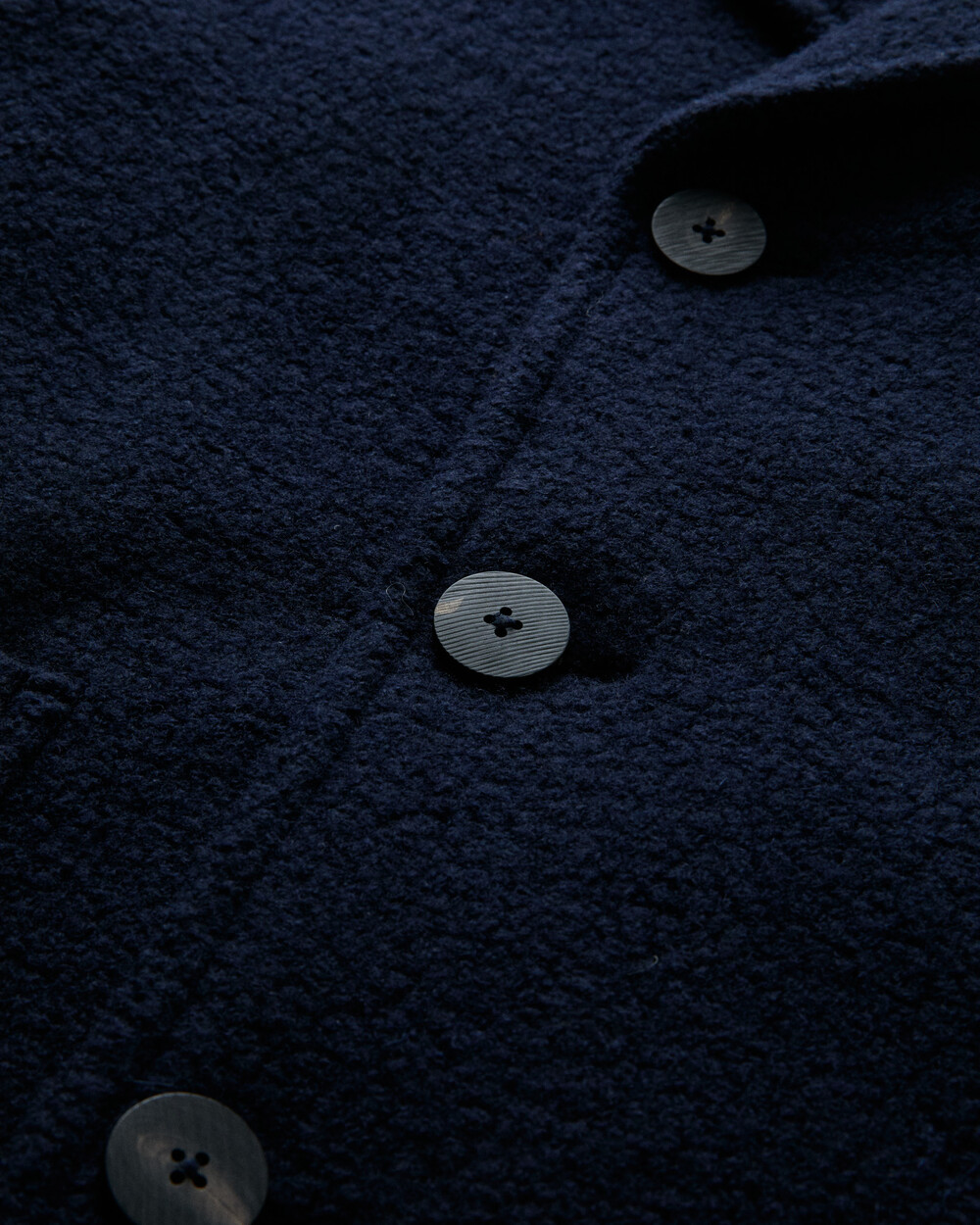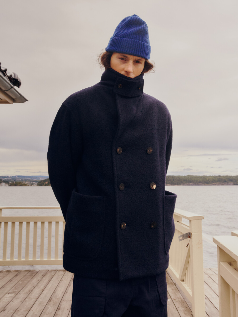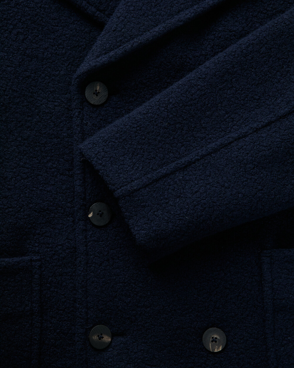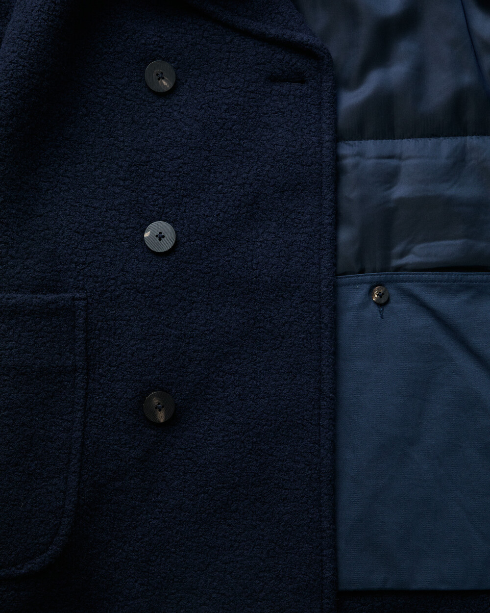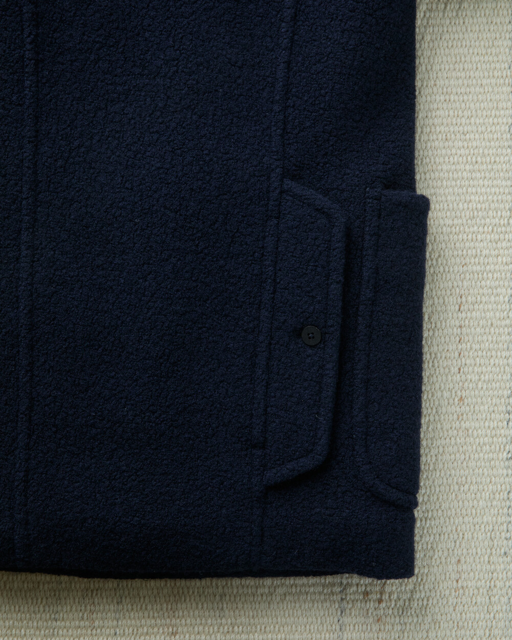 도큐먼트와 FFC의 협업으로 완성된 울 패디드 피코트.이탈리아 Manifattura di Carmignano의 울 59%, 나일론 21%, 폴리에스터 16%, 알파카 4% 혼방(480g) 원단으로 제작되었습니다.부클레(Bouclé) 특유의 입체적 질감과 깊이 있는 표면감이 돋보이며, 신축성이 있는 원단과 여유 있는 실루엣으로 편안한 착용감을 제공합니다.