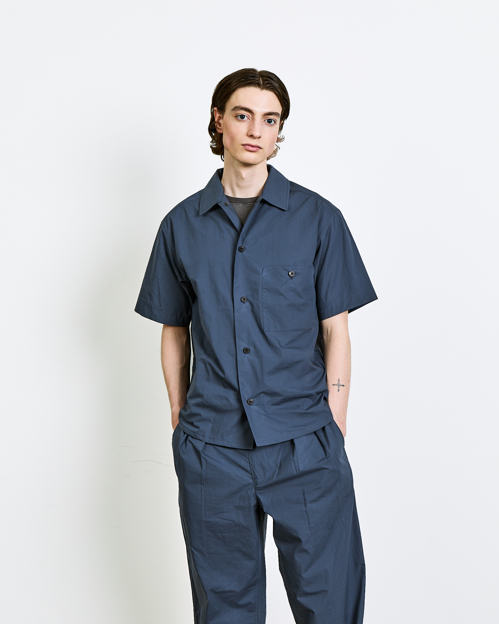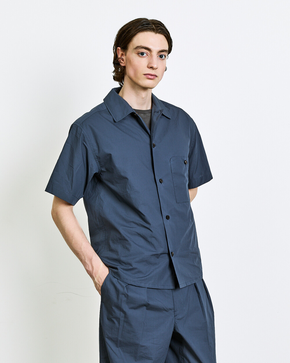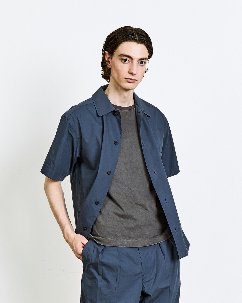A short-sleeve reinterpretation of Document’s signature French shirt.Made from 100% 80-count cotton, the fabric offers a light, refined touch and a clean appearance, while the relaxed silhouette ensures everyday comfort.It can be worn fully buttoned up for a neat look or styled with an open collar for a more relaxed mood.A single chest pocket, real horn buttons, and a curved hem complete the design with understated balance.
