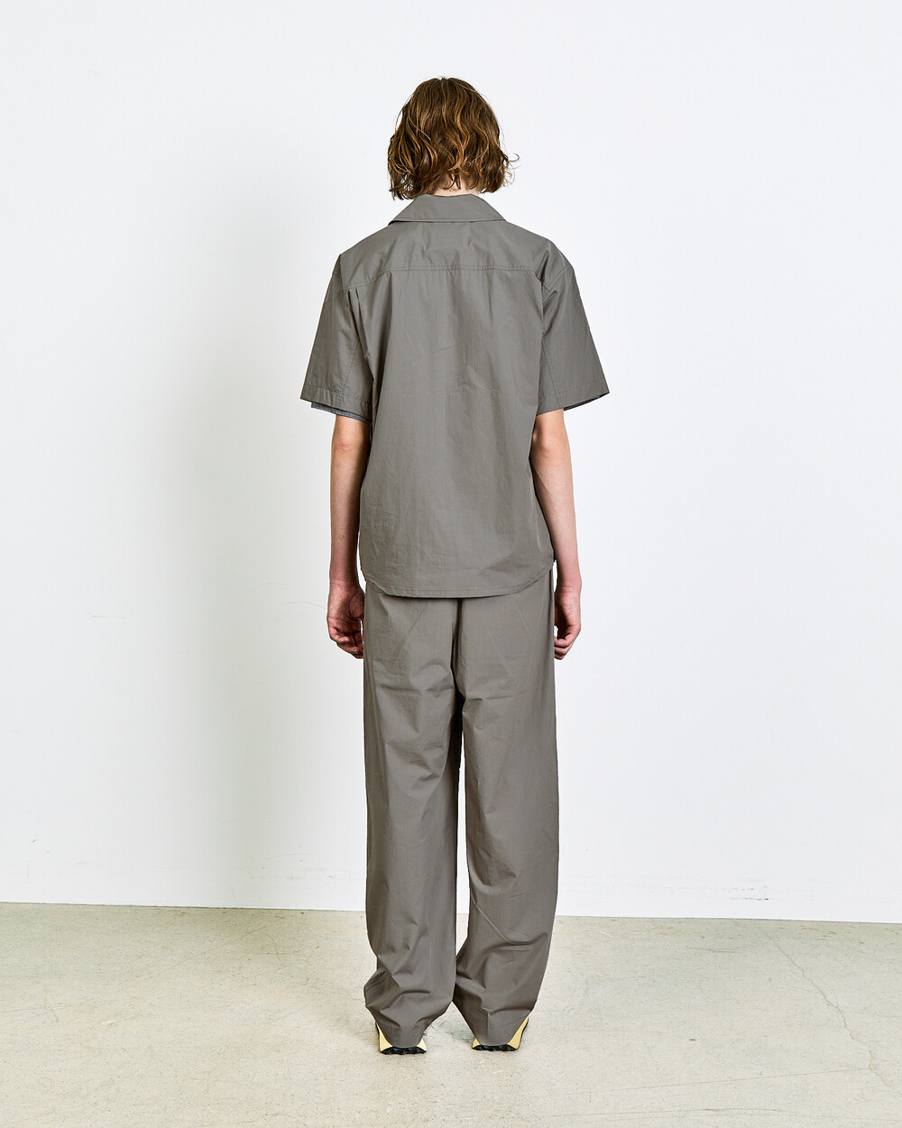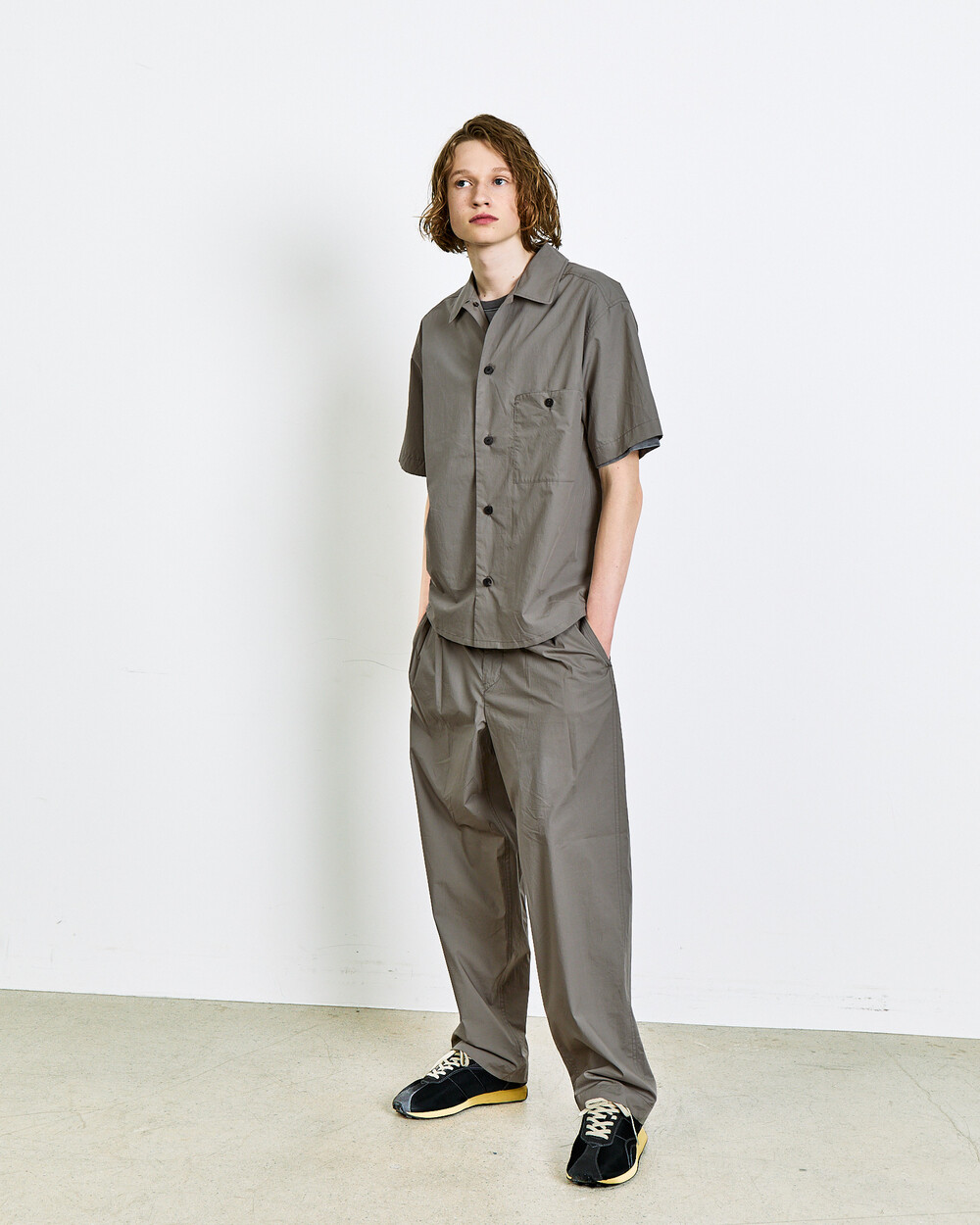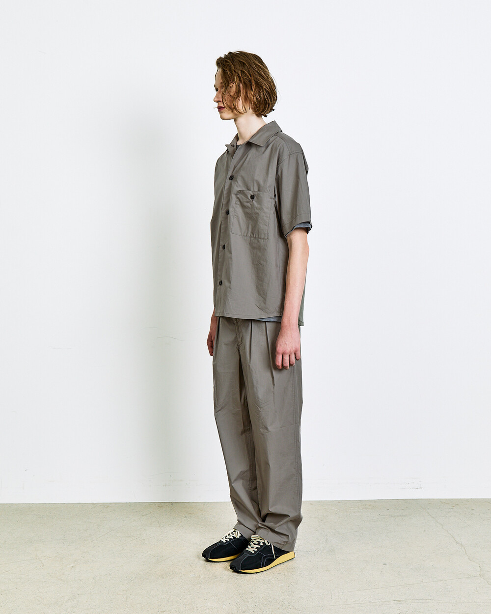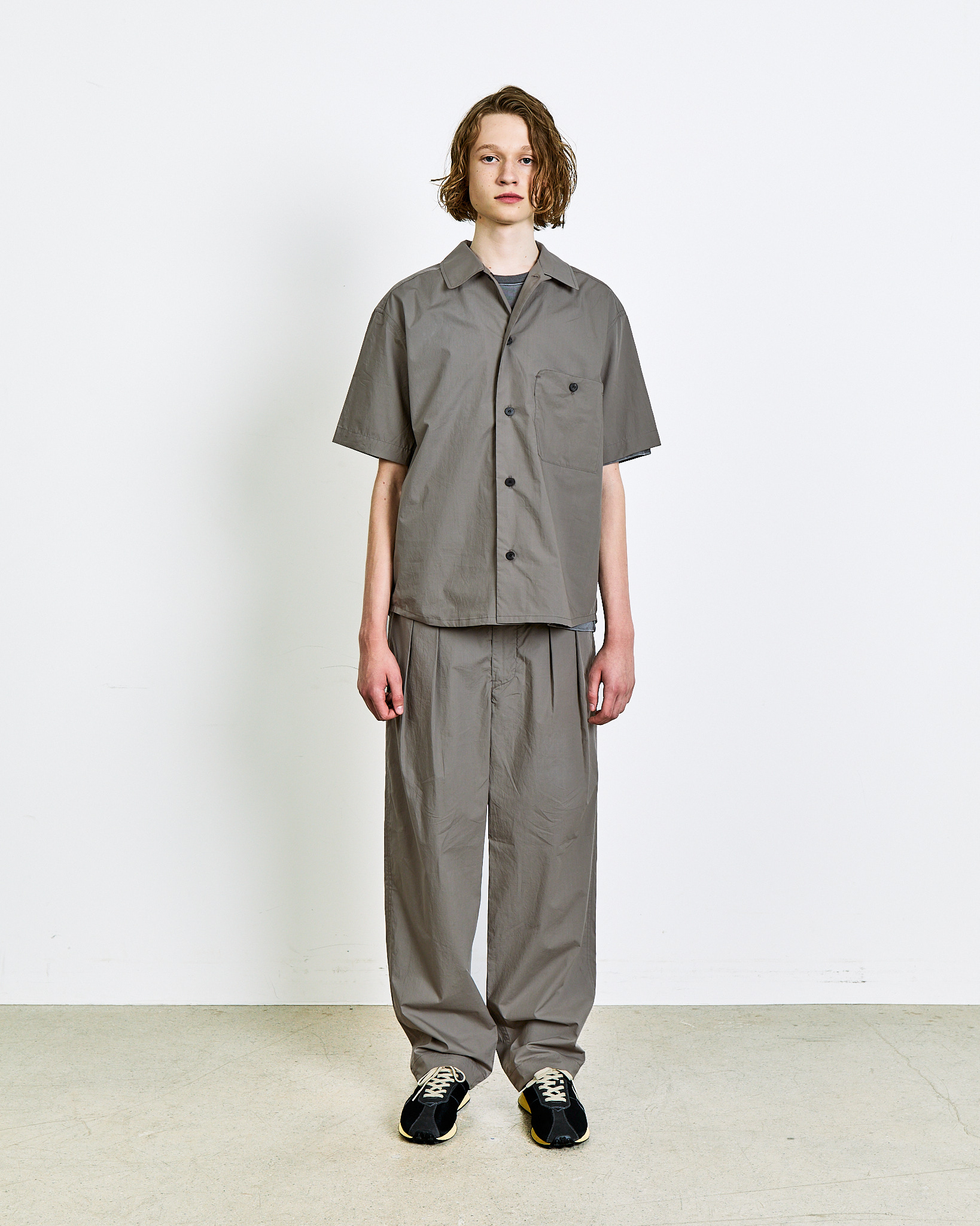 A two-tuck trouser crafted from 100% 80’s cotton.The fabric delivers a lightweight, dry touch and a crisp texture, while the double pleats and semi-wide fit create natural volume and a balanced silhouette.Finished with real horn buttons and a YKK zipper, it can be paired with the matching top in the same fabric for a refined set-up look.