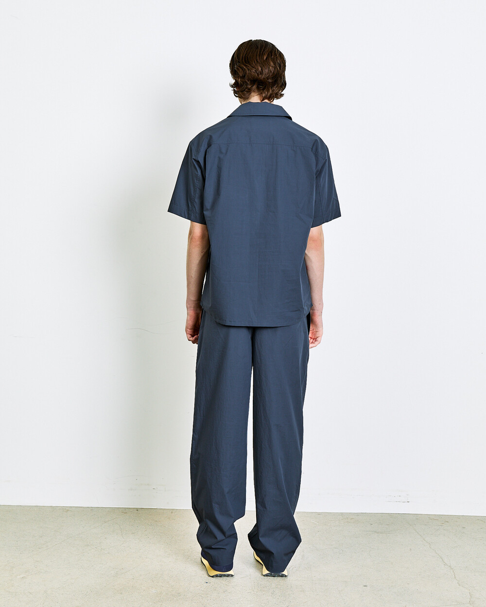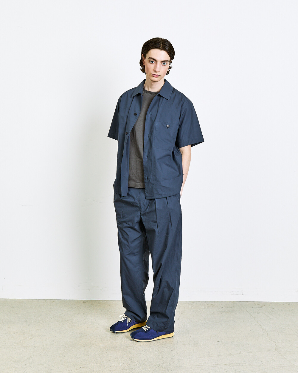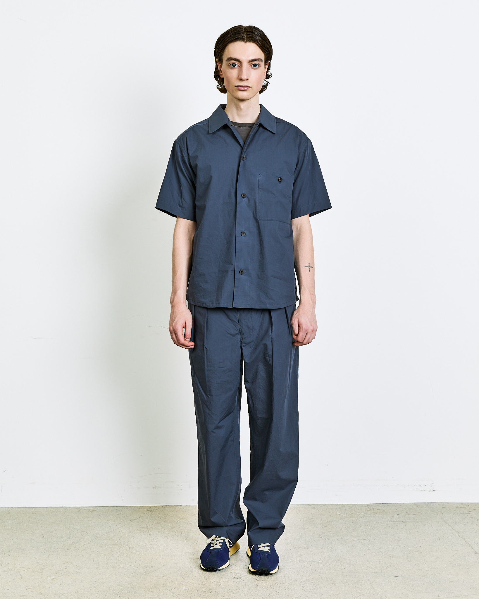 A two-tuck trouser crafted from 100% 80’s cotton.The fabric delivers a lightweight, dry touch and a crisp texture, while the double pleats and semi-wide fit create natural volume and a balanced silhouette.Finished with real horn buttons and a YKK zipper, it can be paired with the matching top in the same fabric for a refined set-up look.