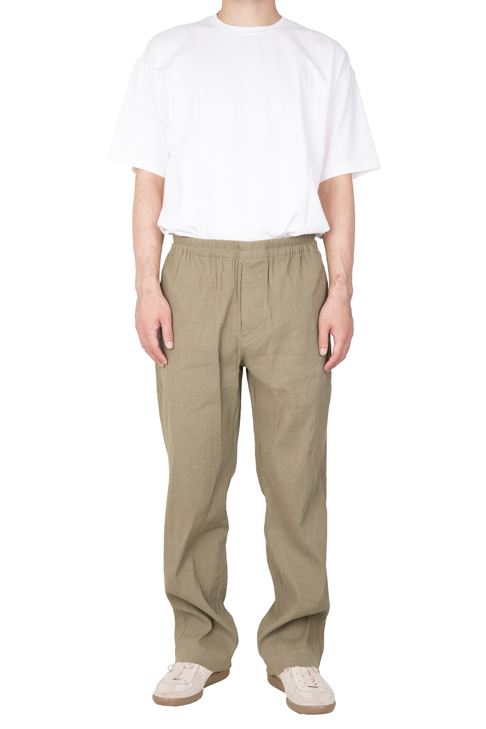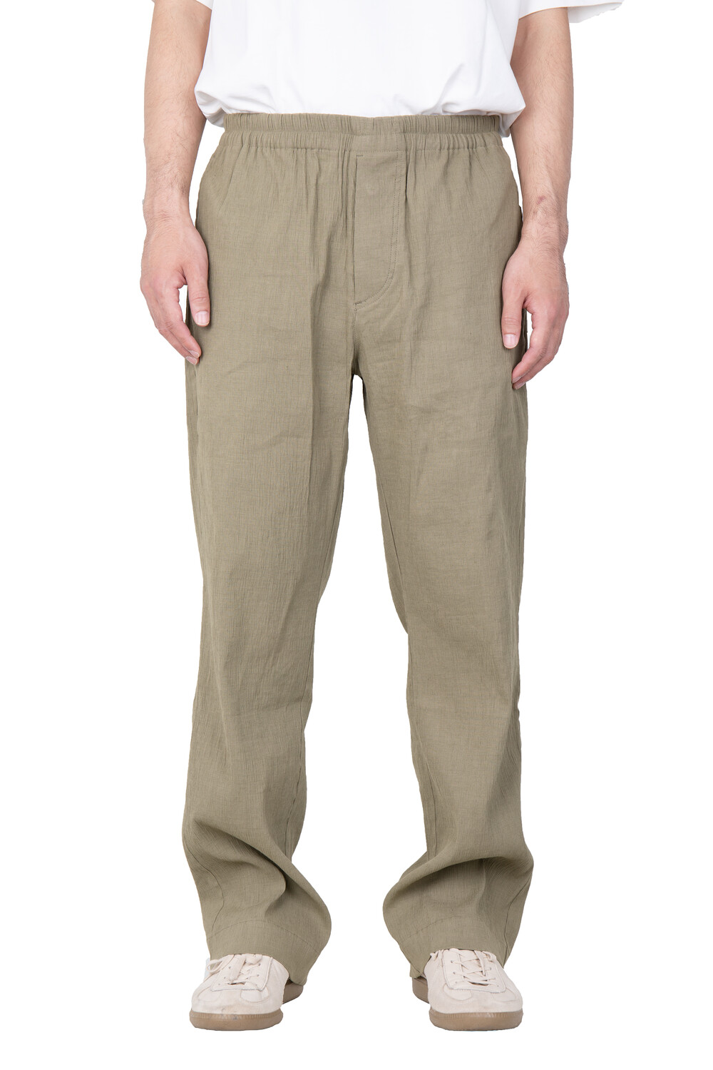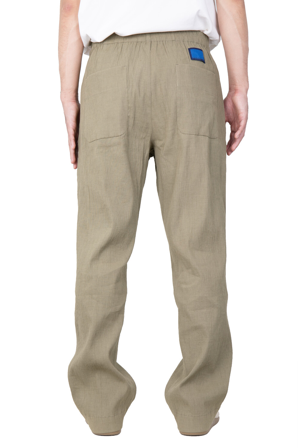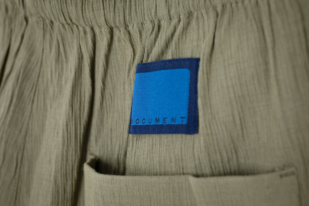 도큐먼트의 파자마 팬츠를 근본으로 스트레치 원단과 올리브 컬러의 색감으로는 파자마 팬츠가 나온다면 좋겠다고 생각한 결과입니다. 스트레치의 특성에 맞는 실루엣으로 기존 파자마 팬츠에 실루엣이 잘 맞지만, 적당히 여유있도록 제작되었습니다. 엉덩이 포켓이 몸판에 부착되는 봉제 방법이 스티치가 밖으로 드러니지 않도록 해서 고급스러움을 표현하며, 착용자가 입었을 때 편안함을 목적으로 BAMBOO SHIRT 와 세트로 착용했을 때 스타일이 드러나도록 합니다.