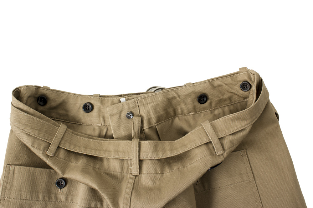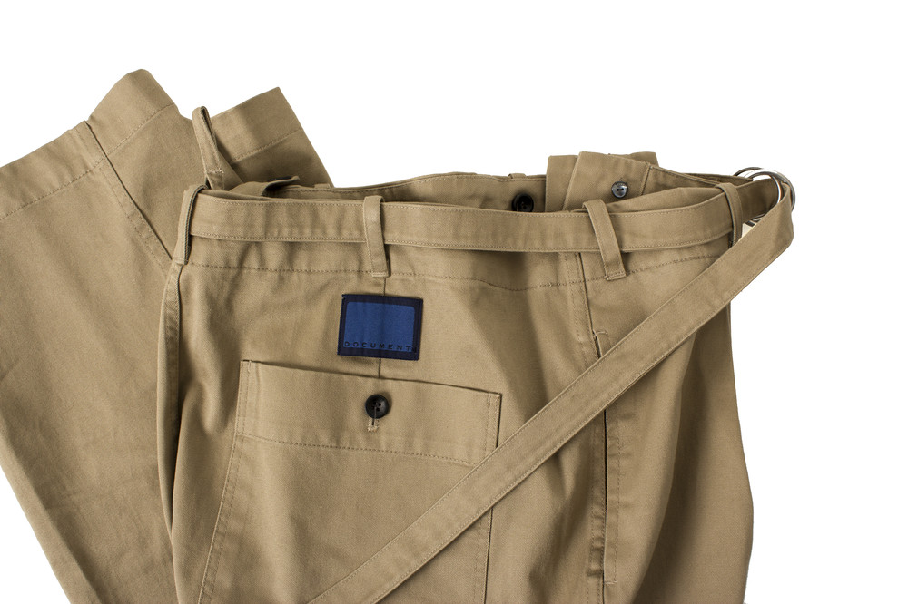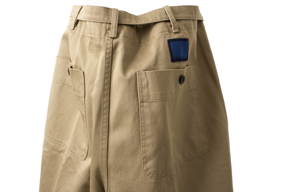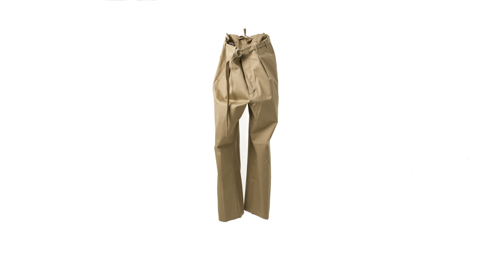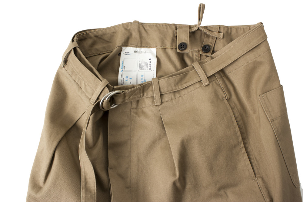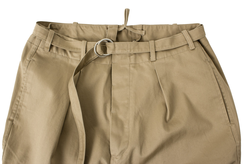 일본에서 생산된 치노 원단으로 만들어진 벨트와 주름이 있는 팬츠입니다.
