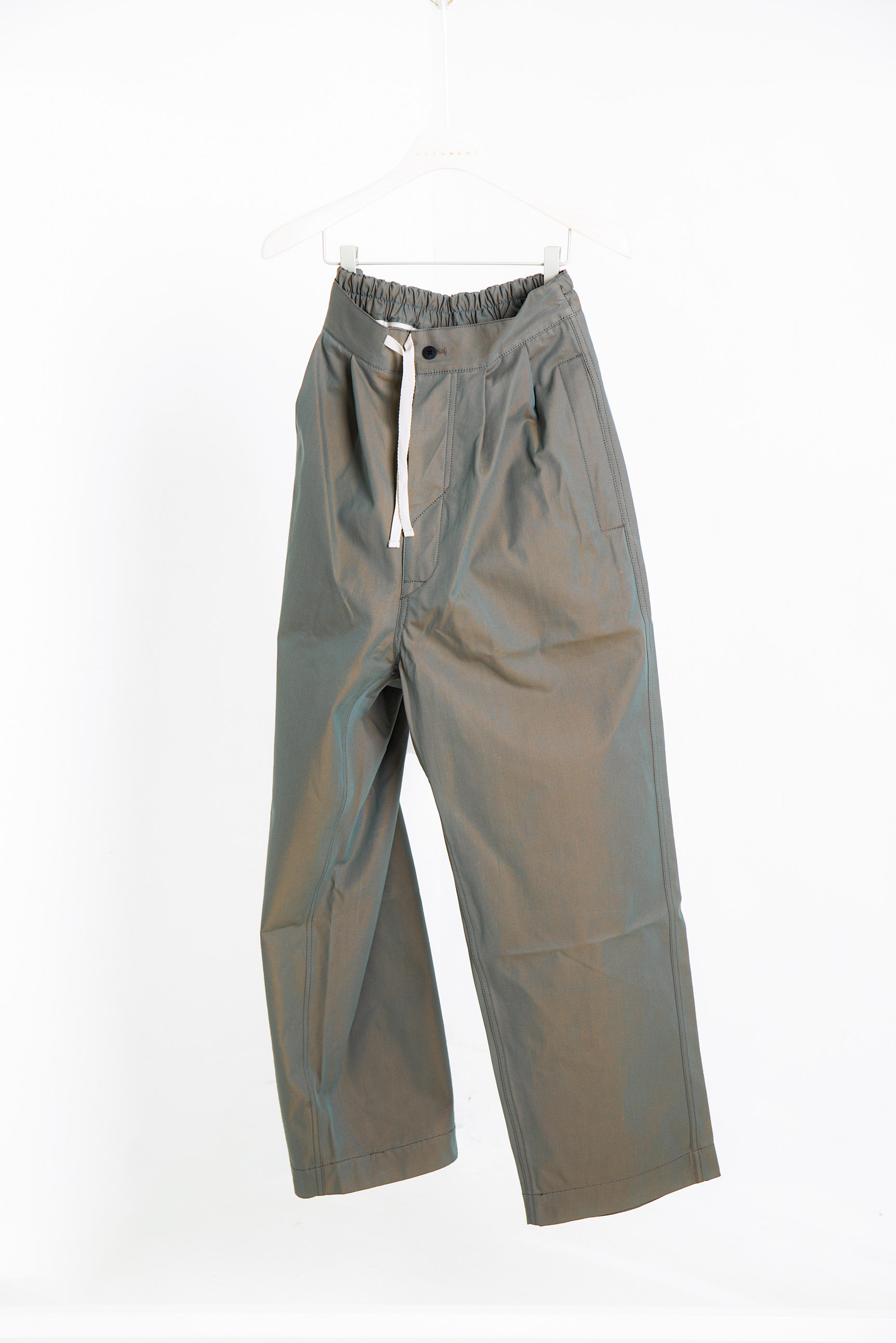 두 가지 톤의 오묘한 색 조합과 은은한 광택감이 매력적인 CHAMBRAY COTTON TUCKED PANTS 입니다.