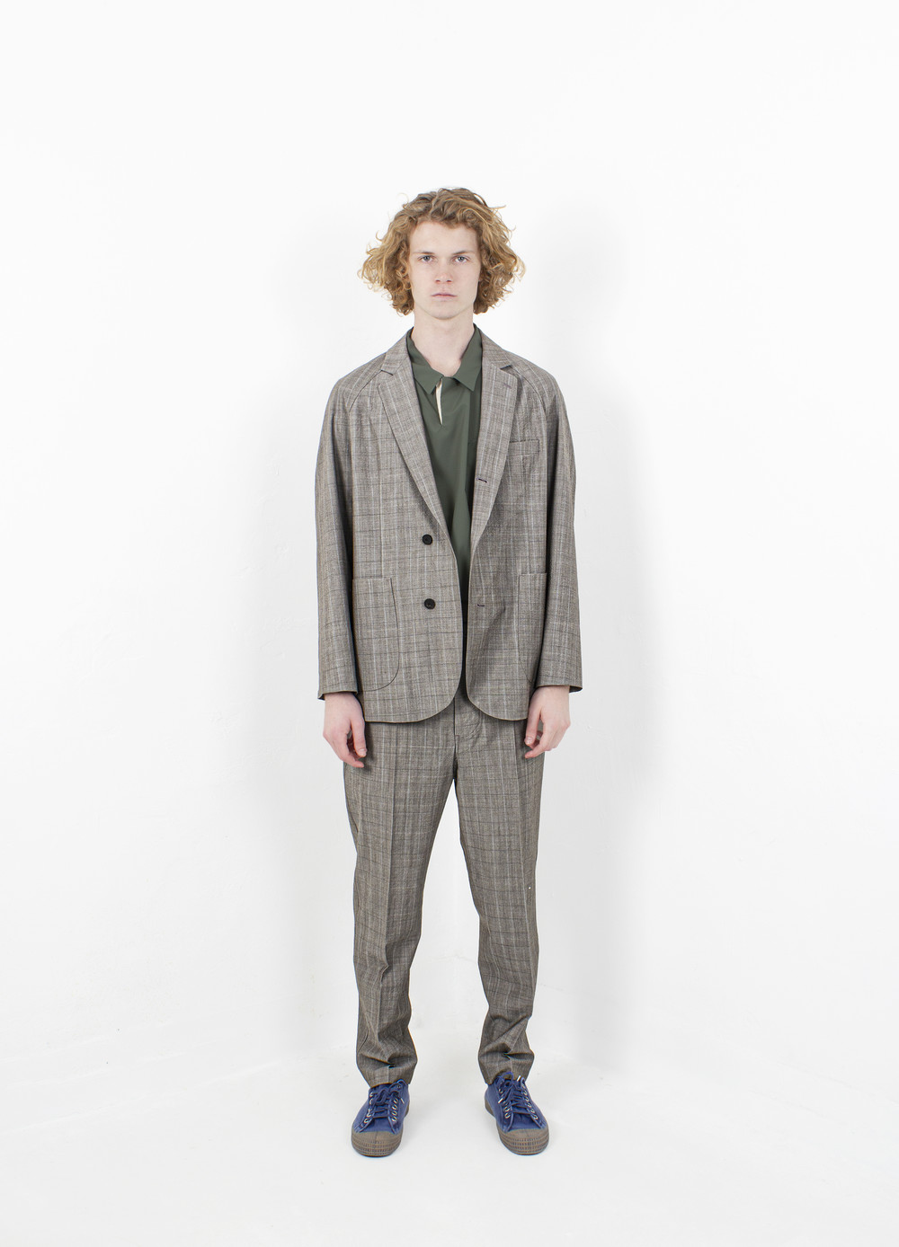 바스락 거리는 질감과 시원한 착용감을 함께 주는 원단으로, 카키쉬한 그레이 컬러 바닥에 은은한 블루 핀이 들어가 있는 원단으로 실물이 훨씬 매력적입니다.