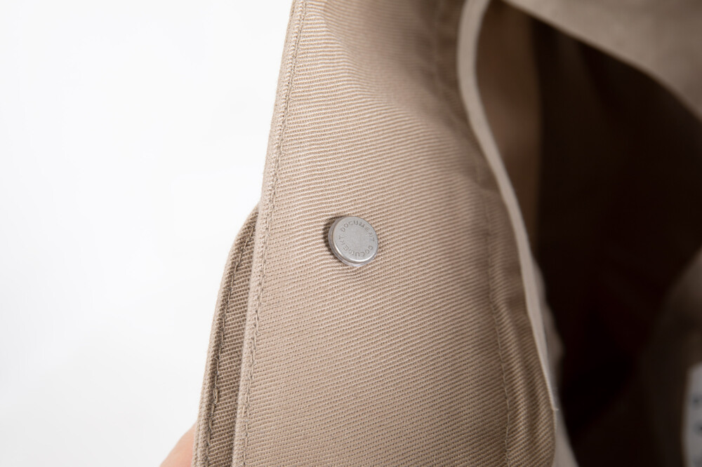 도큐먼트 음각이 새겨진 캔톤 스냅버튼으로 마감되어 유니크한 외관이 드러납니다.