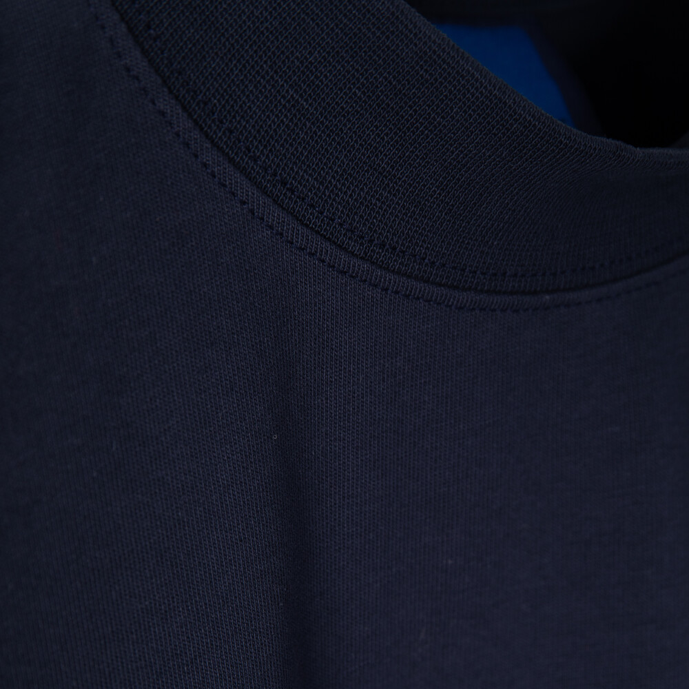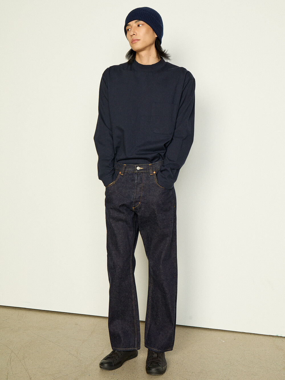 Crafted from dense 13’s cotton fabric, it offers a firm hand feel and a stable silhouette with a slightly heavier weight, making it versatile across all seasons. The mock neck is reinforced with a thicker rib, providing a secure yet comfortable fit. Its shorter length ensures ease of wear without feeling restrictive.