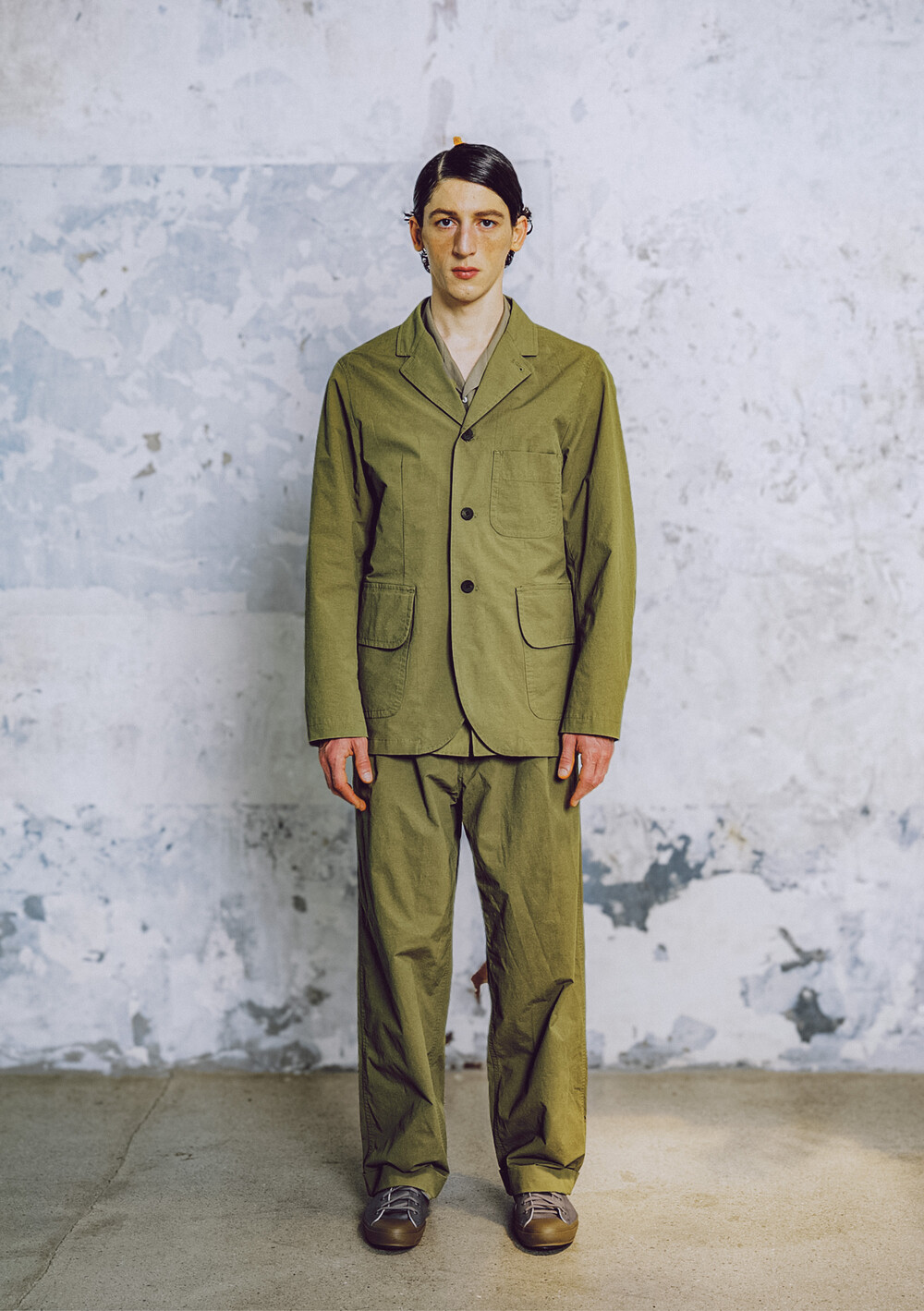 넉넉한 기장감, 여유롭게 테일러드 된 소매라인, 부드럽게 이어지는 어깨라인 그리고 두 번째 단추부터 닫게 되어있는 롤링 라펠 등이 착장 포인트입니다.