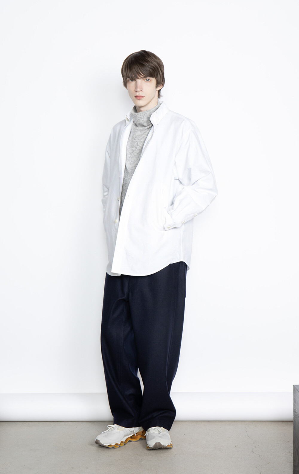 여유로운 실루엣과 카라 라인을 잡아주는 버튼 다운 형태로 되어 있으며, 원단 느낌과 더불어 드레시한 외관을 띄고 있습니다.