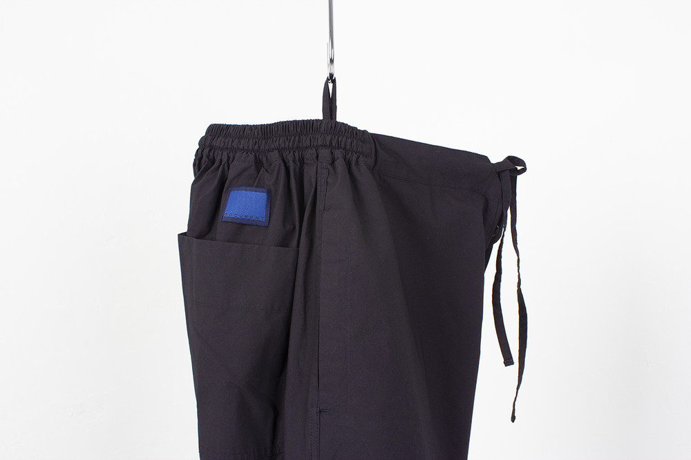 허리에 같은 원단으로 제작된 스트링이 있어 허리를 당겨 조일 수 있도록 되어 있으며, 뒷 허리에 고무 밴드가 되어 있어 편하게 입고 벗을 수 있습니다.