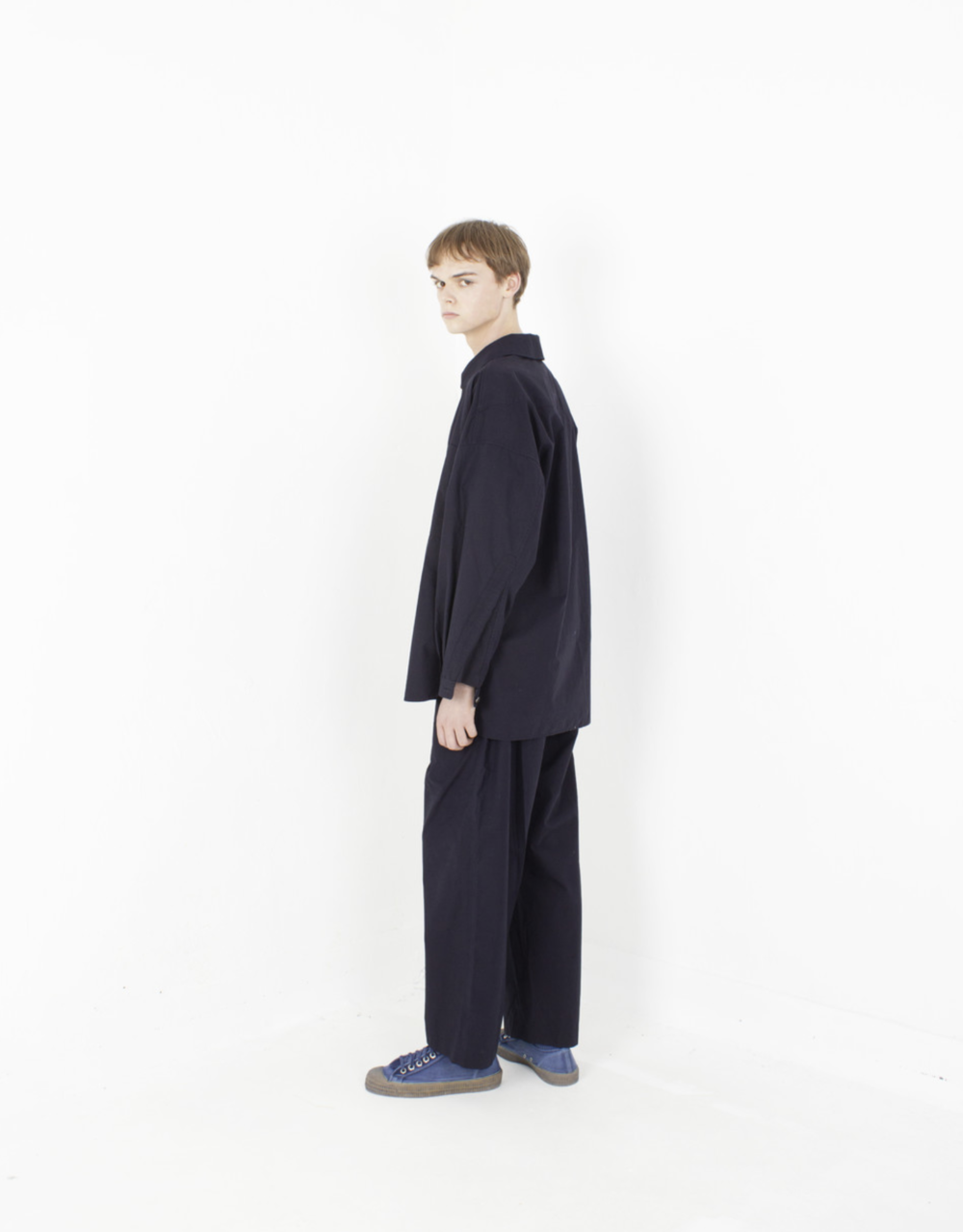 TYPEWRITER COTTON 으로 만들어진 바삭거리는 터치감과 고밀도의 외관이 워싱된 가공을 통해 자연스러운 질감과 바삭거리는 착용감이 시원함을 줍니다. 와이드한 실루엣으로 크롭되는 핏으로 이루어져 있습니다.