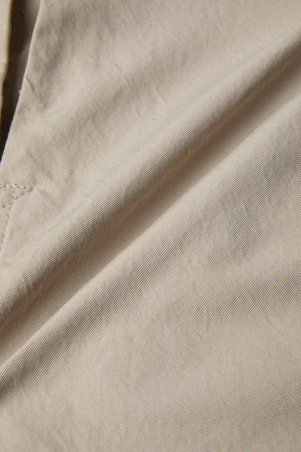 원단은 **P/C 60/40 혼방의 390g 이탈리안 코튼 블렌드 원단(Fabrica 61730/1 col.401920)**을 사용했습니다. 밀도 높은 조직감이 만들어내는 견고한 형태감과 은은한 광택, 그리고 깊이 있는 컬러가 특징입니다. 단독 아우터로도 충분한 존재감을 가지면서, 계절이 바뀌는 시기에는 레이어링의 중심이 되는 균형 잡힌 두께감으로 제안됩니다.