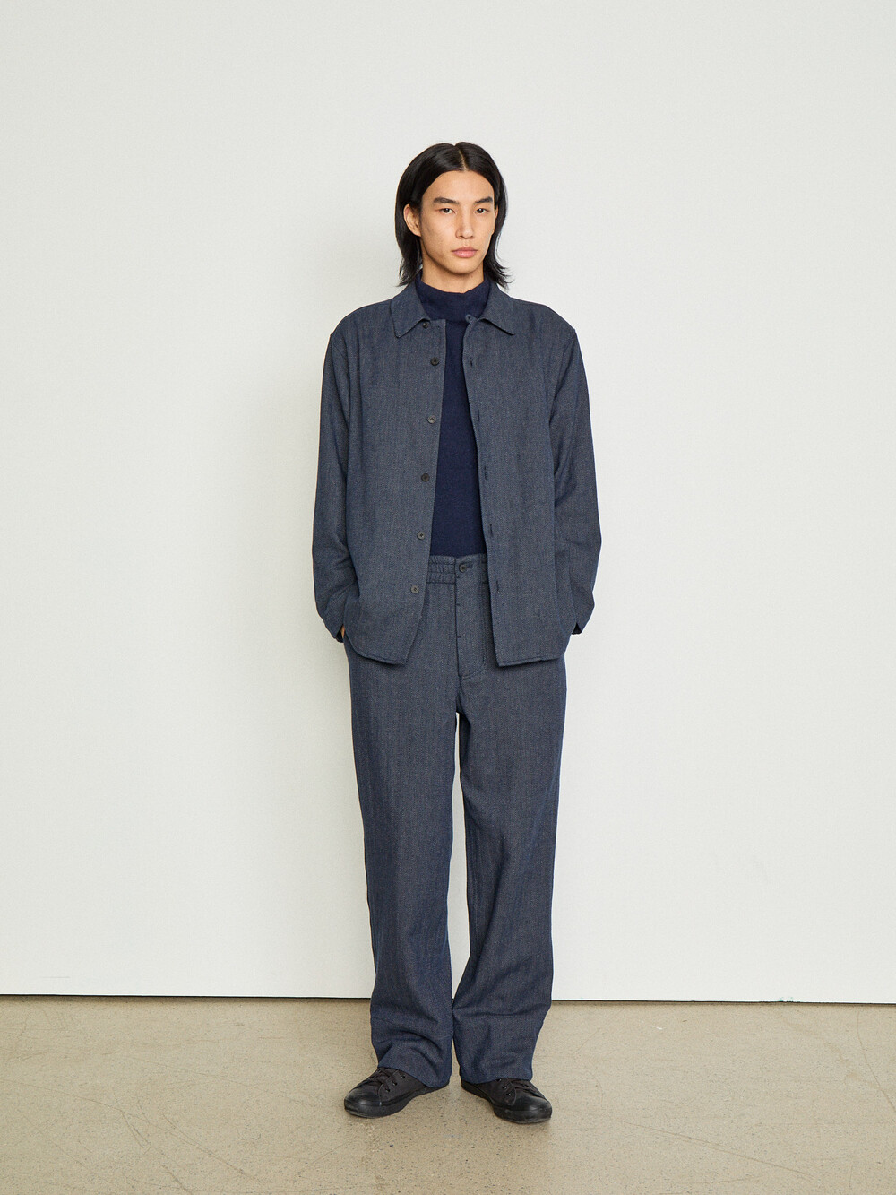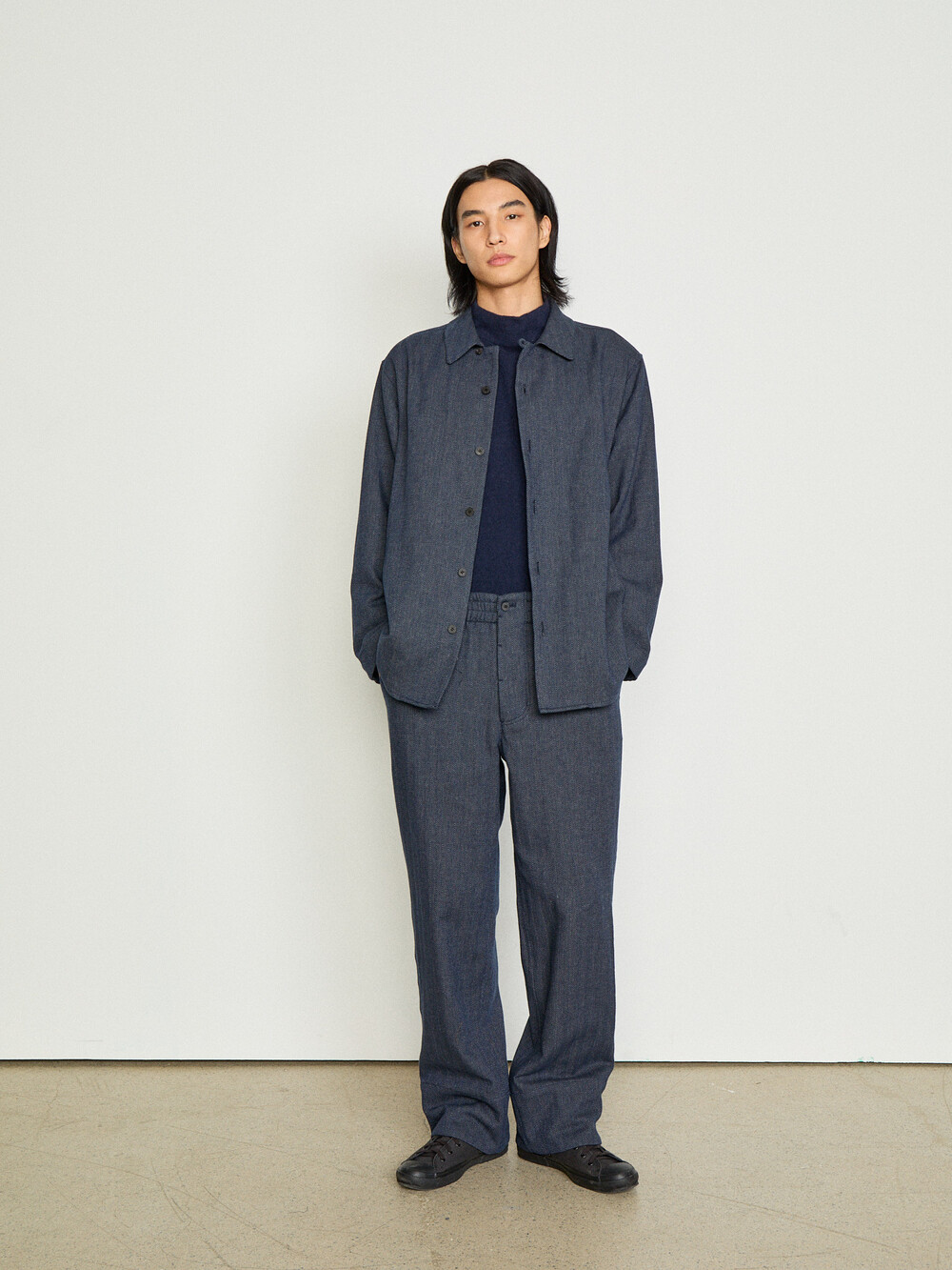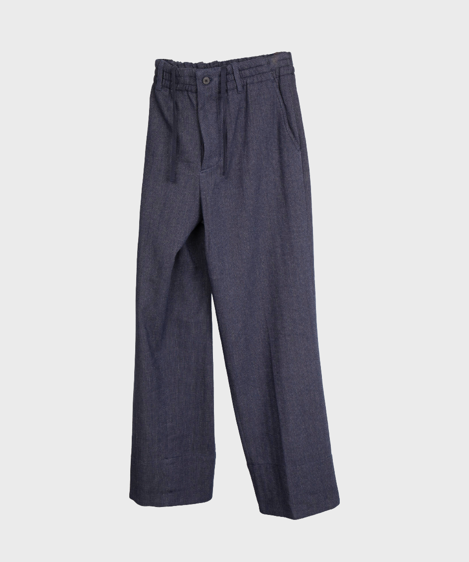 기존의 출시되었던 DENIM COTTON TUCKED TROUSERS의 원단과는 다른 헤링본 조직이 돋보이는 외관을 갖고있습니다.