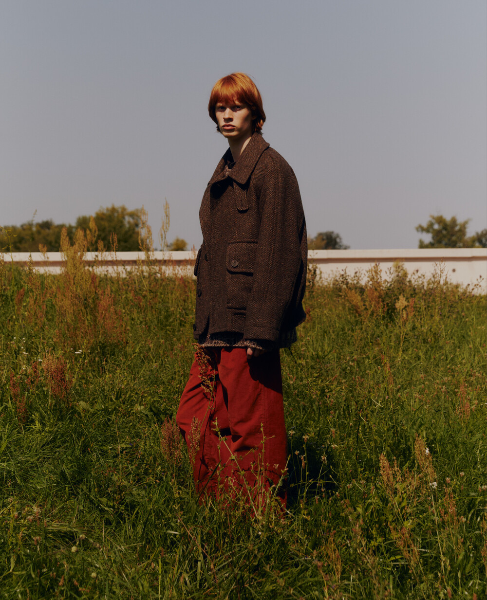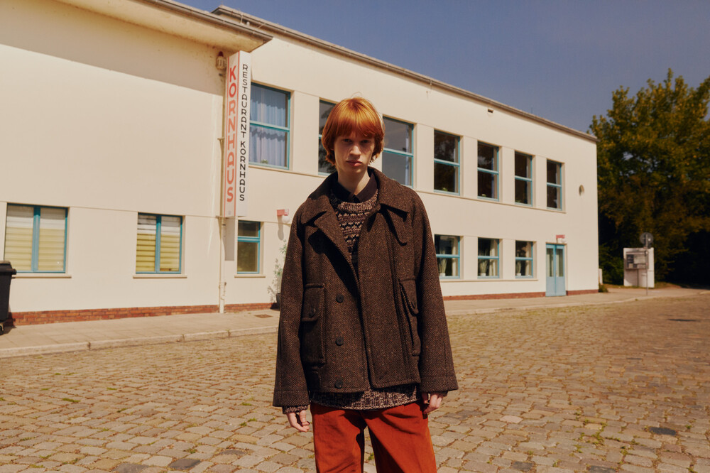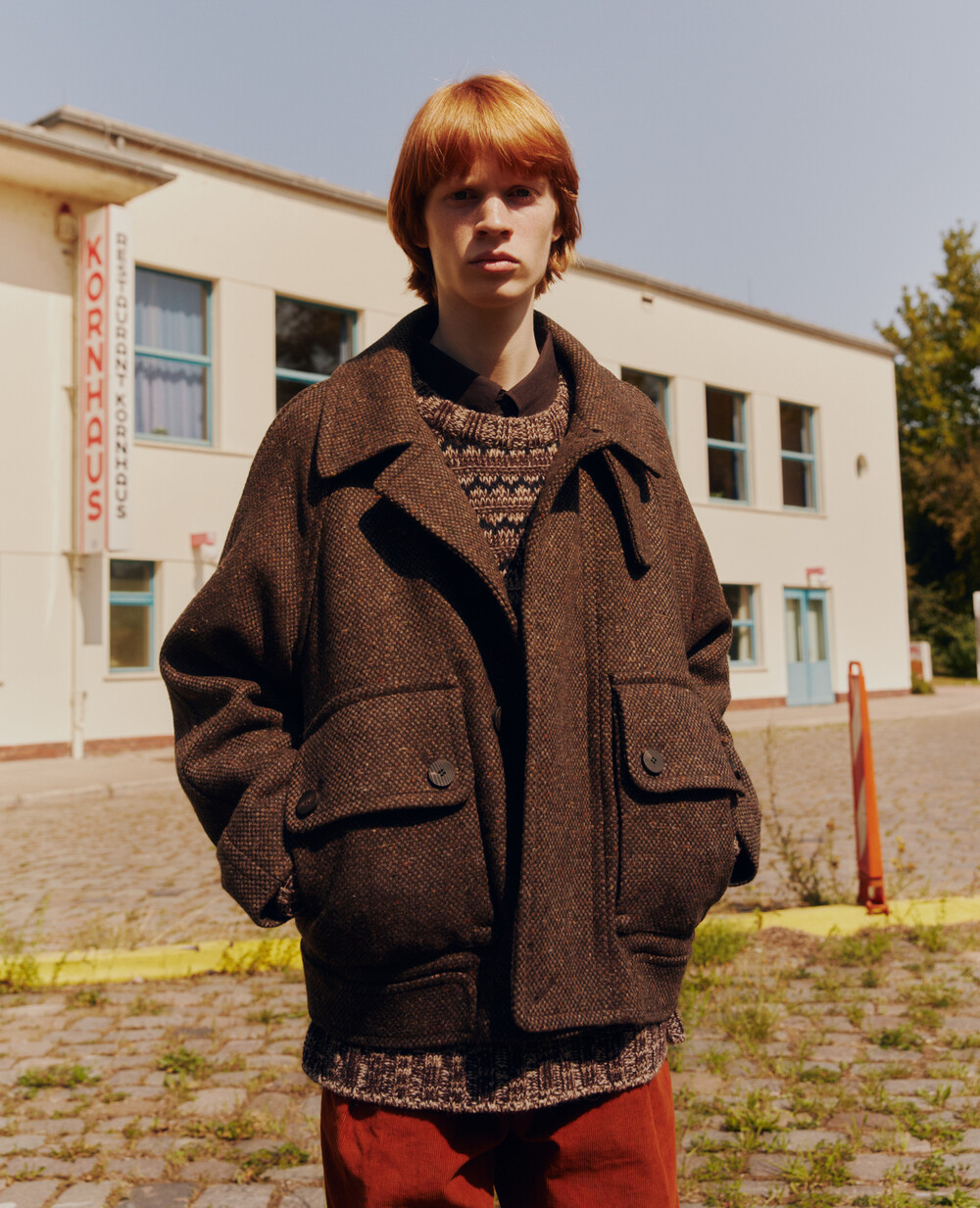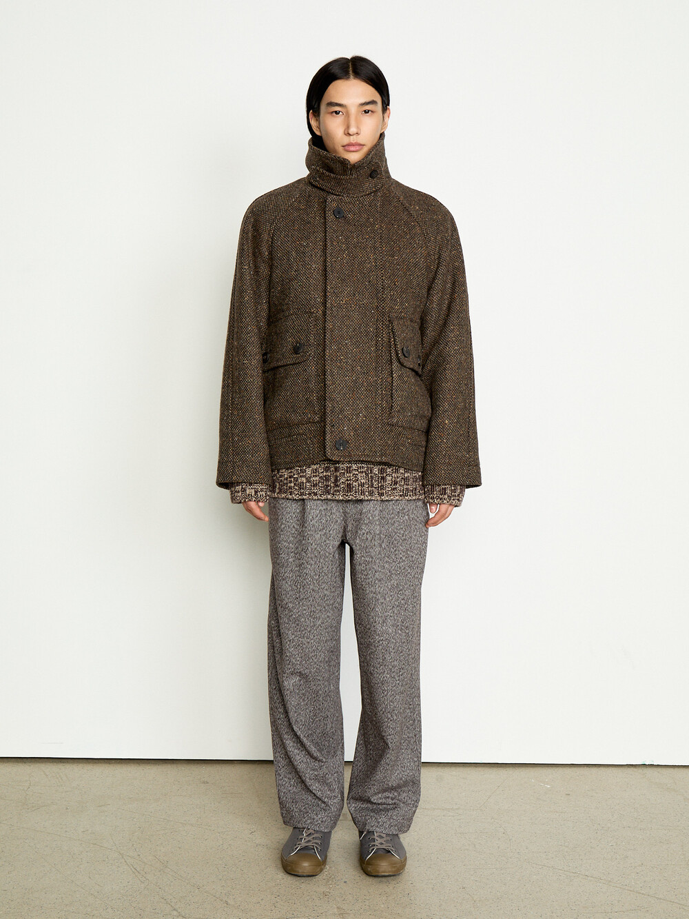 Document’s signature Big Pocket Half Coat is crafted in collaboration with MOLLY & SONS of Donegal, Ireland,using an exclusive brown tweed developed by Document.This season’s edition enhances the classic bird’s-eye weave, woven into a dense 900 g/m heavyweight fabric that carries both presence and precision.
