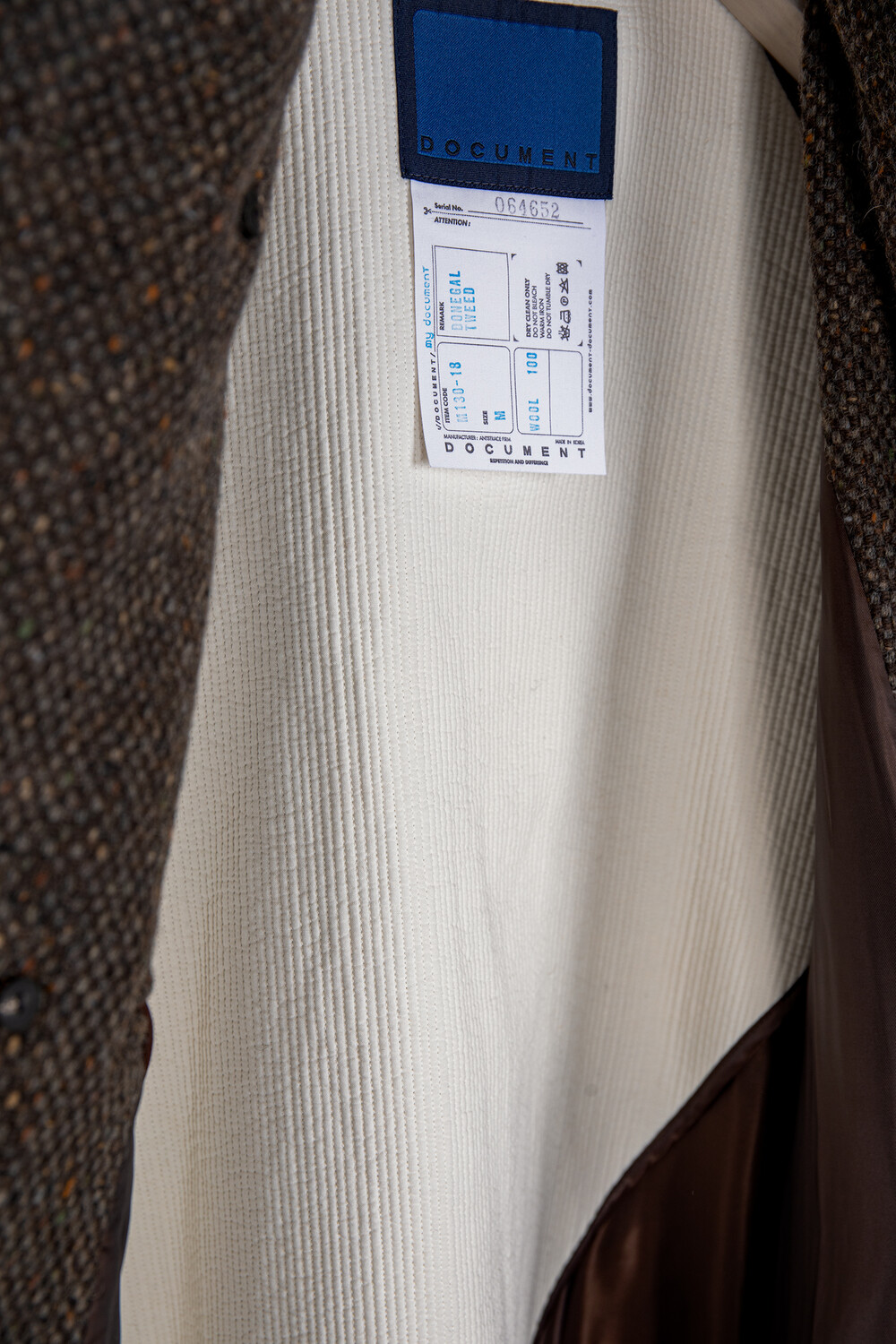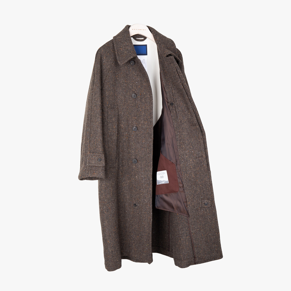 이 코트는 아일랜드 북부 도네갈(Donegal) 지역에서 유래한그 고유한 특성이 원단의 이름이 된 도네갈 트위드(Donegal Tweed) 로 제작되었습니다.현재 도네갈 지역에서 오랜 전통을 이어오고 있는 MOLLY & SONS 사와의 협업을 통해,도큐먼트가 직접 개발한 원단으로 완성되었습니다.
