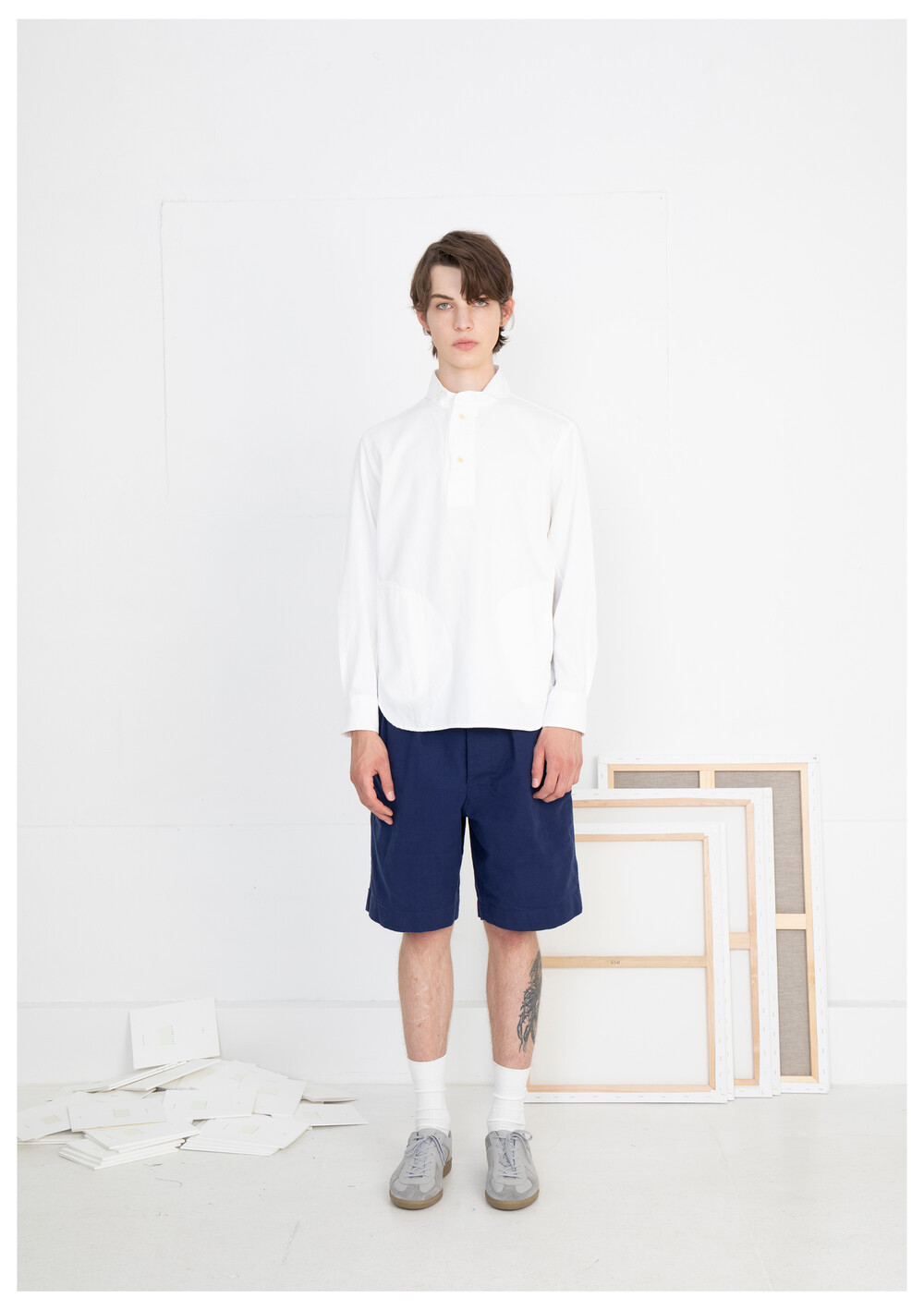 입었을때 착용감과 운동감을 고려한 뒷품의 턱이 들어간 패턴으로 설계되었으며, 제품의 자연스런 외관과 안정된 축률을 위해 완성 제작 후 워싱 가공이 되어 있습니다. 주머니에 손을 넣기 쉽도록 옆선이 아닌 몸판 앞쪽에 라인을 통해 주머니가 설계된 패턴과 둥근 카라의 조합이 매력적인 셔츠입니다. 천연 너트 버튼이 사용되었으며, 소매 쉽게 걷어 올릴 수 있도록 커프스 소매로 되어 있습니다. 프랑스 해군의 둥근 카라를 모티브로 하여 제작된 카라는 유려한 라인을 드러내며, 취향에 따라 세워 입을 수 있도록 제작 되었습니다.
