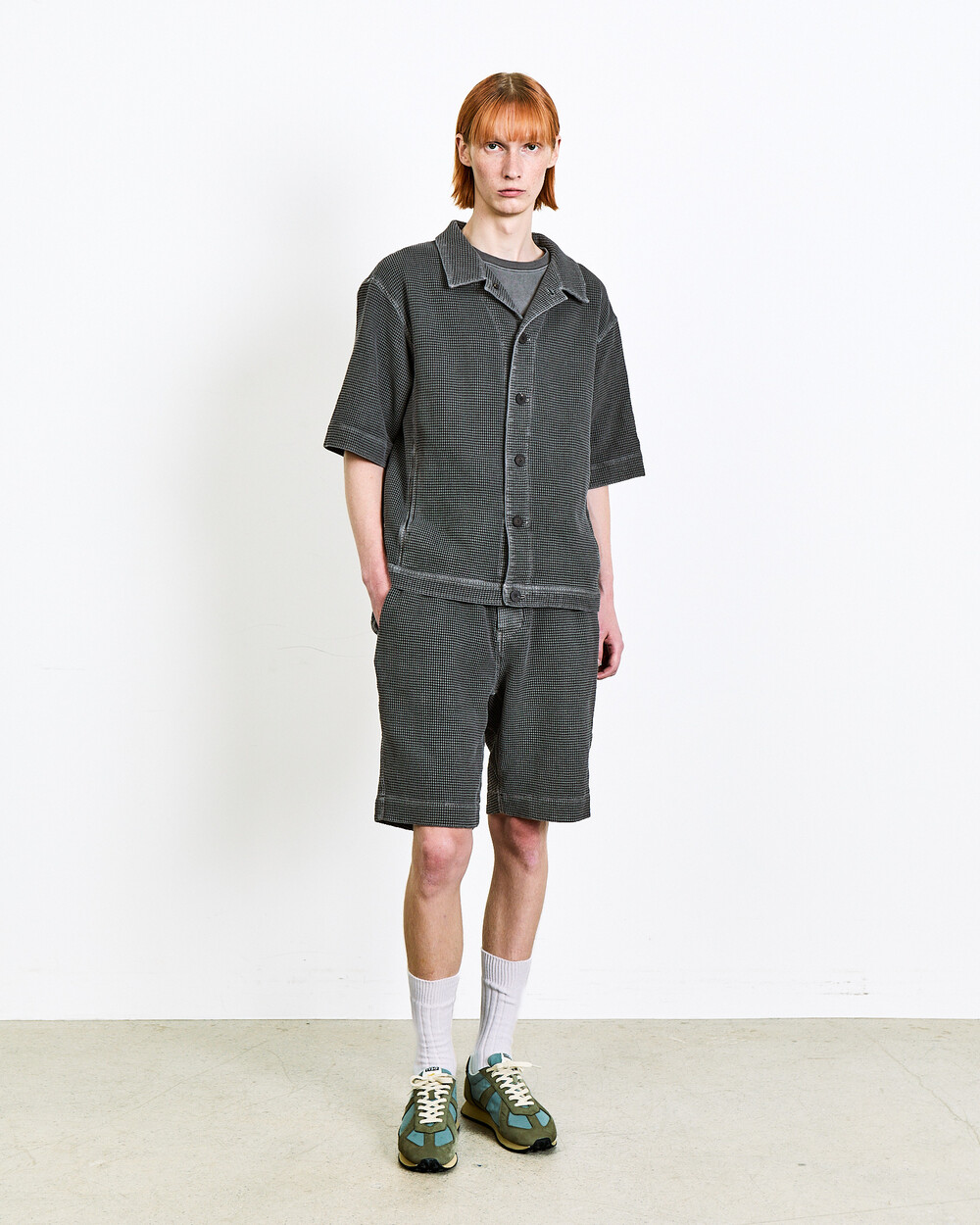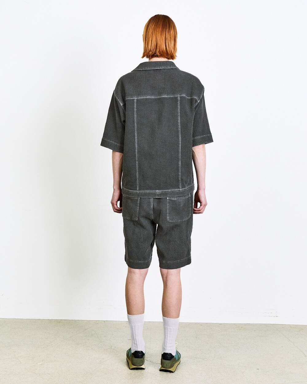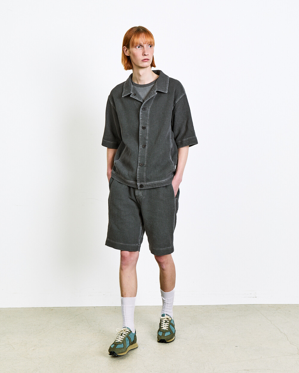 Shorts made from Japanese waffle cotton fabric.The garment-dyed finish highlights a unique color and distinctive appearance, while the textured surface keeps the piece light and comfortable.An elasticated waistband adds ease to everyday wear, and the actual garment is designed with a slightly more relaxed fit than shown in the model images.The shorts can also be styled as a set-up with the matching top in the same fabric.