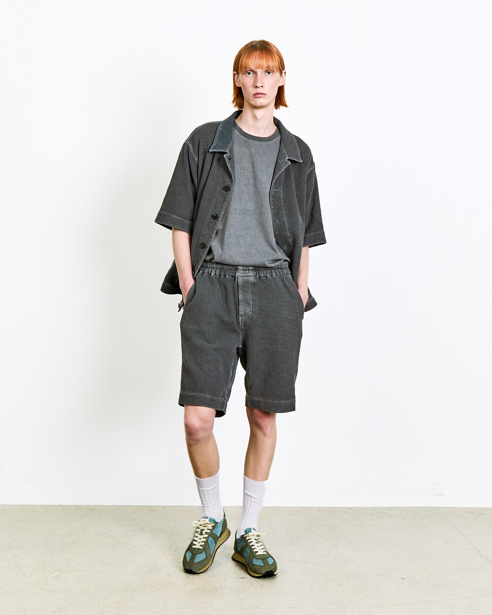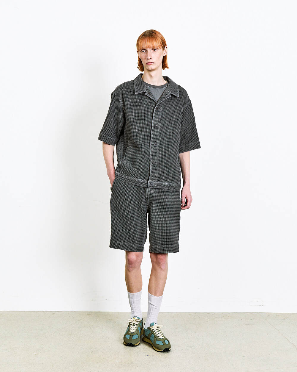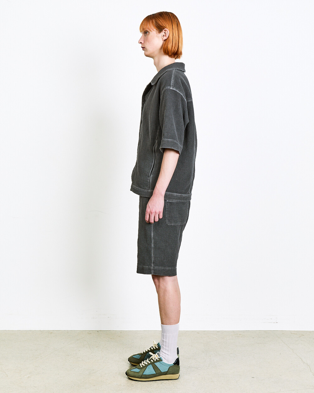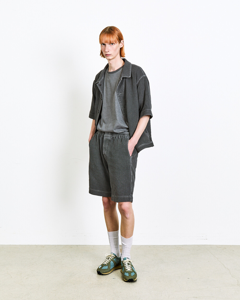 Shorts made from Japanese waffle cotton fabric.The garment-dyed finish highlights a unique color and distinctive appearance, while the textured surface keeps the piece light and comfortable.An elasticated waistband adds ease to everyday wear, and the actual garment is designed with a slightly more relaxed fit than shown in the model images.The shorts can also be styled as a set-up with the matching top in the same fabric.