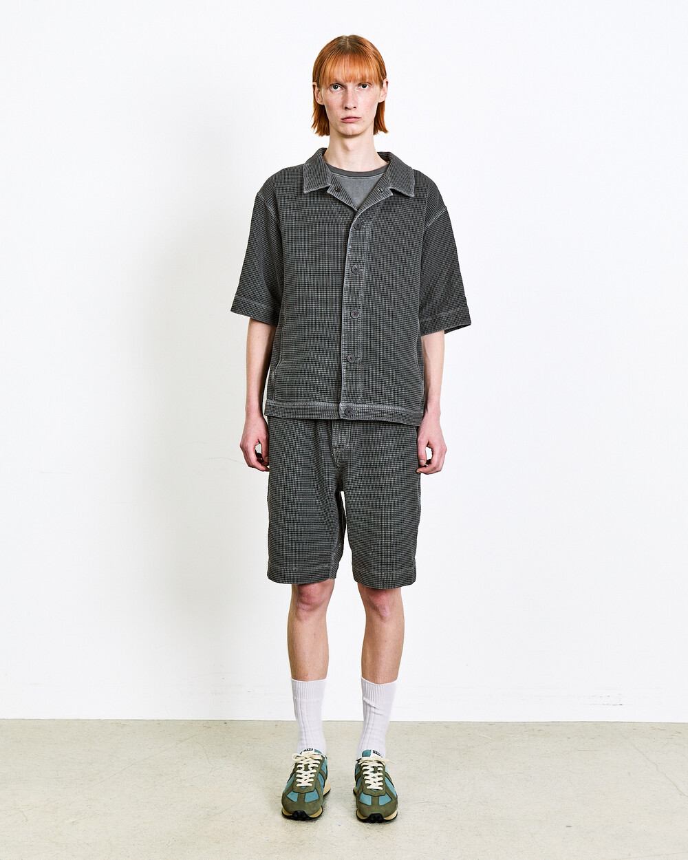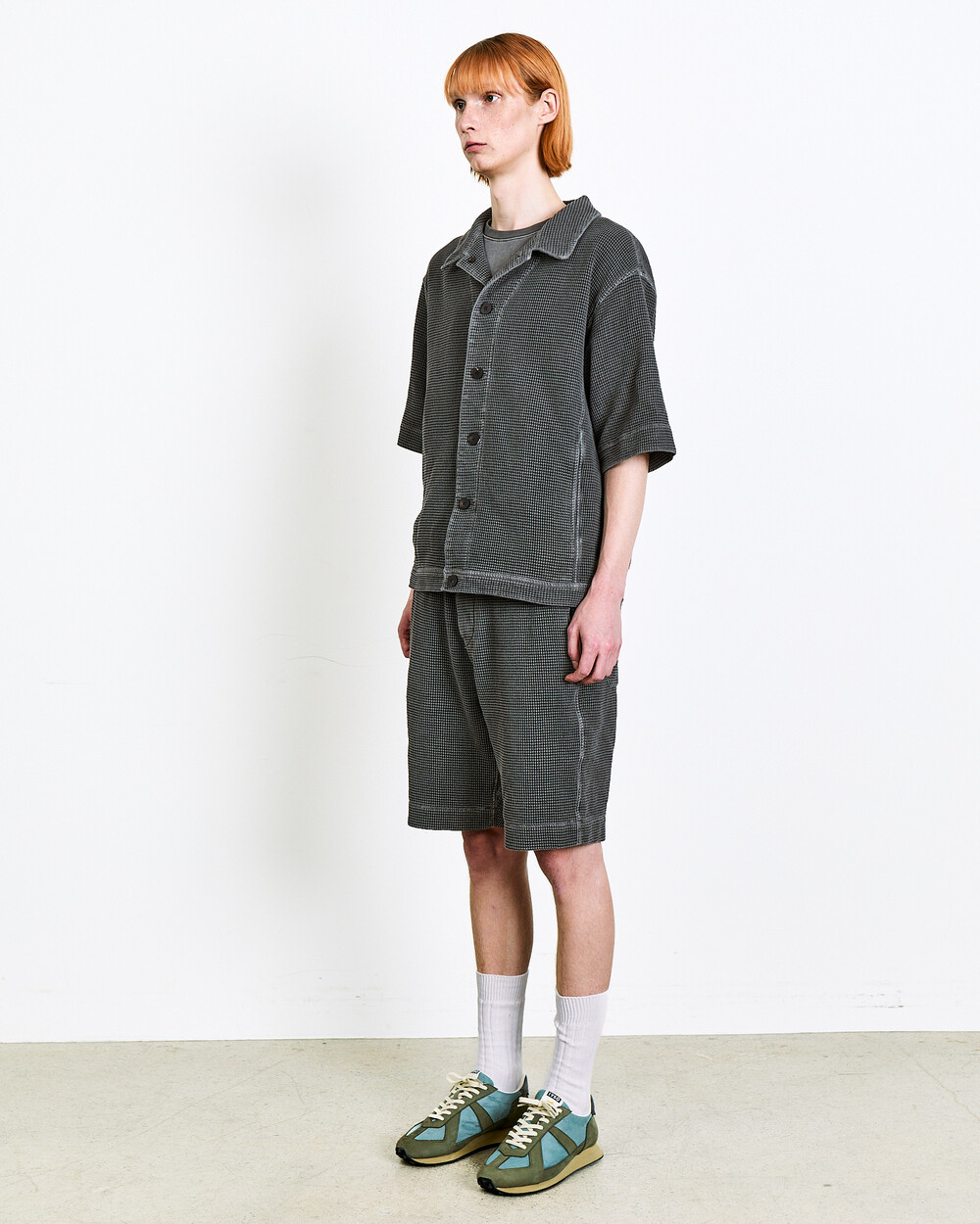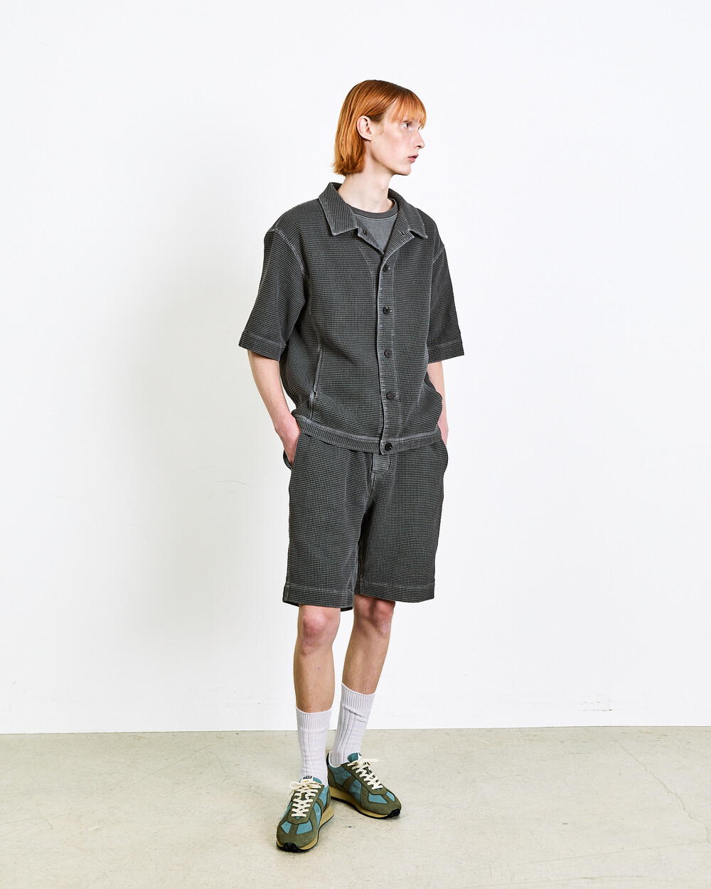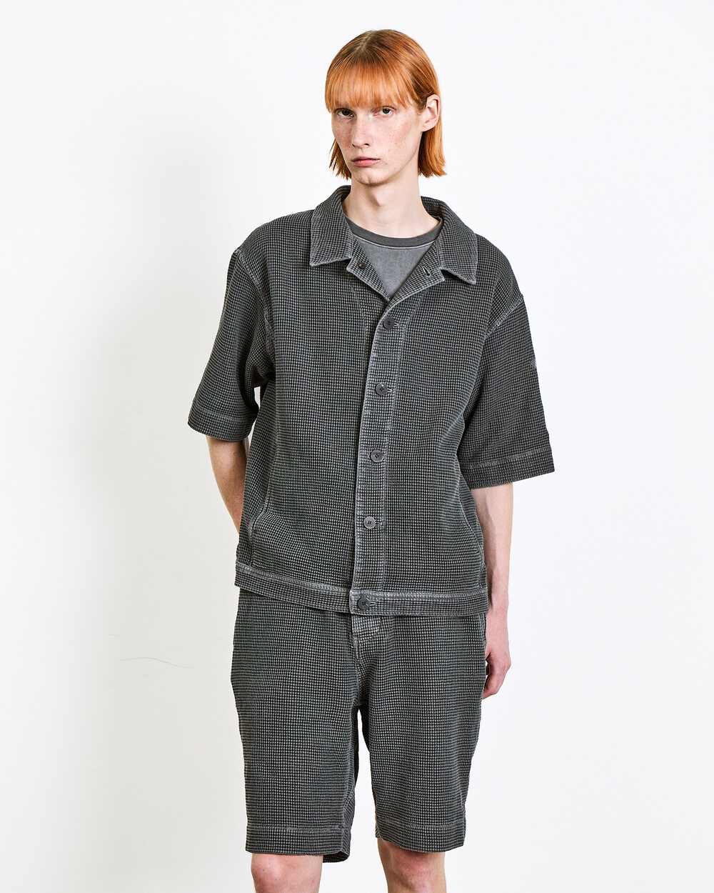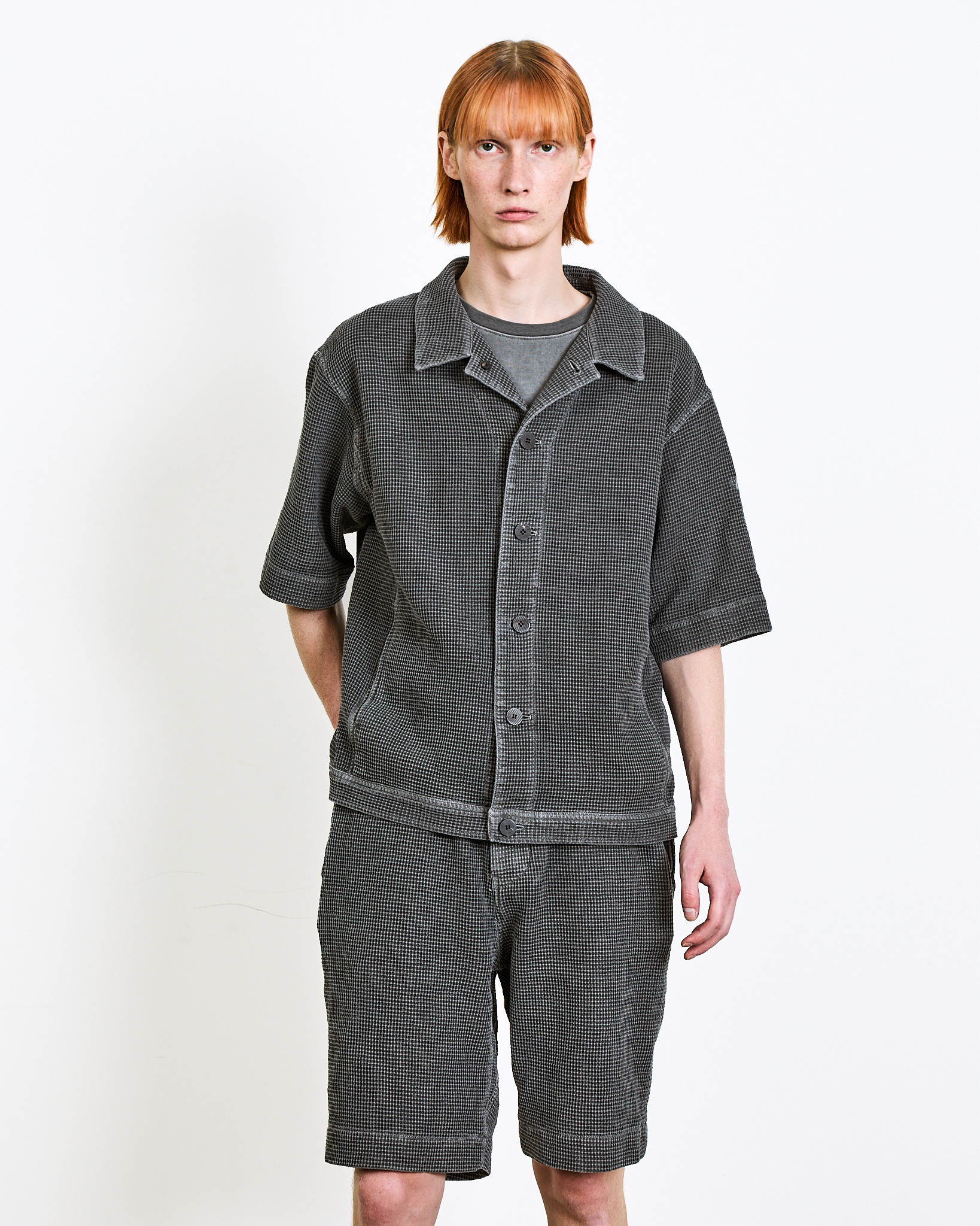 A summer jacket made from Japanese waffle cotton fabric.The garment-dyed finish highlights its unique color and distinctive appearance, while the textured surface keeps the piece light and comfortable.Cut in a relaxed silhouette, it can be worn lightly like a shirt and styled as a set-up with the matching shorts in the same fabric.