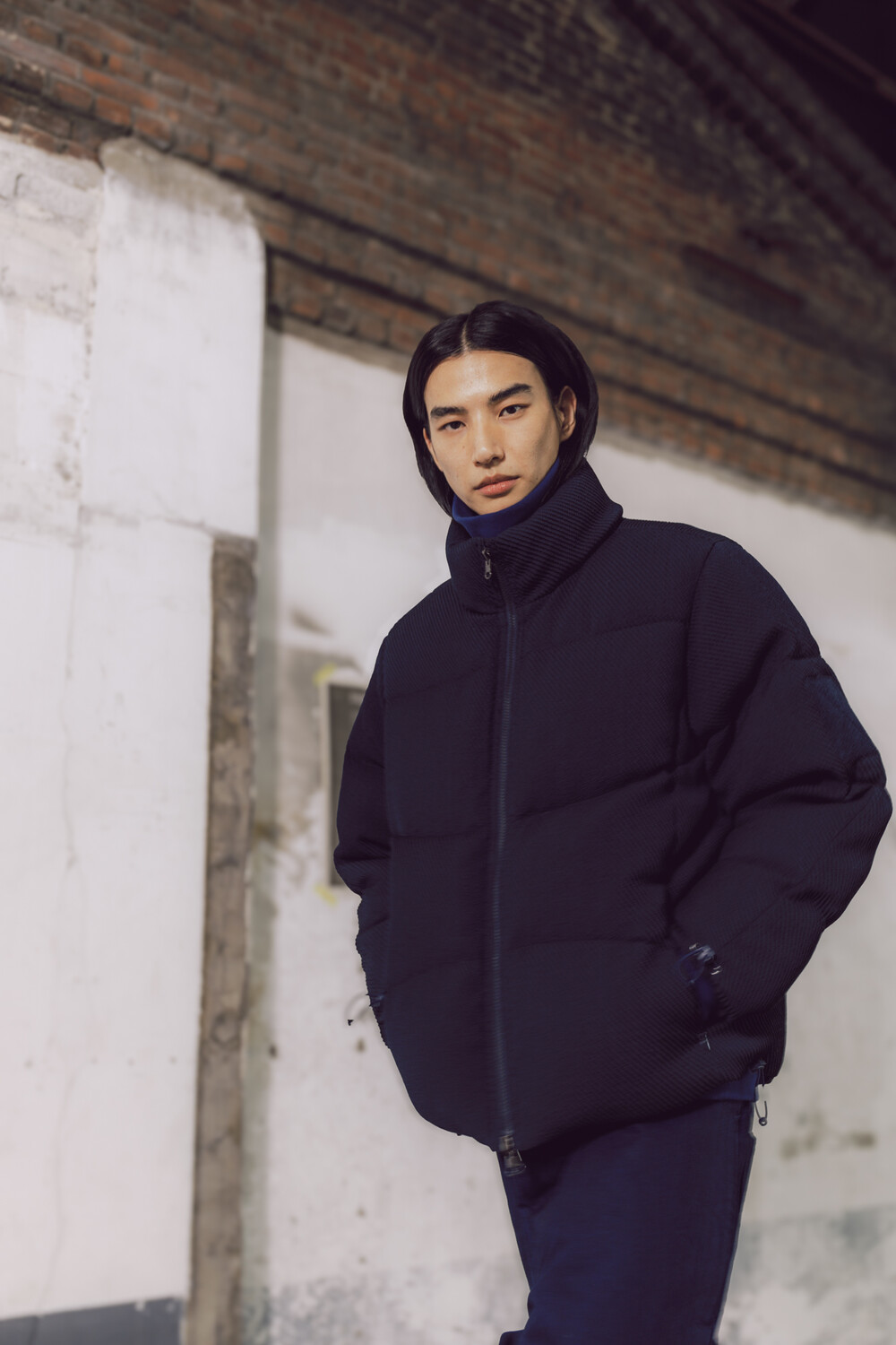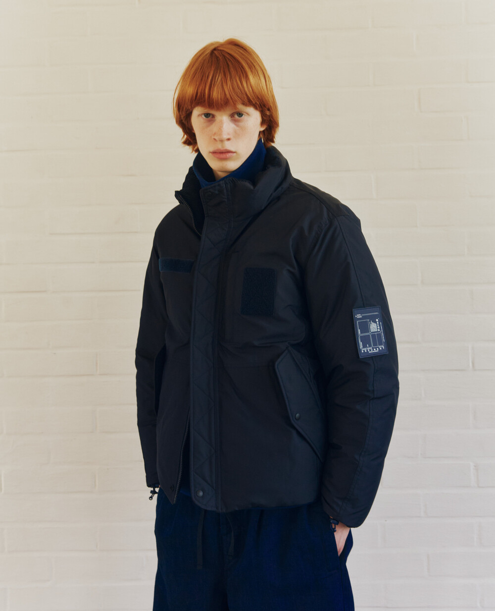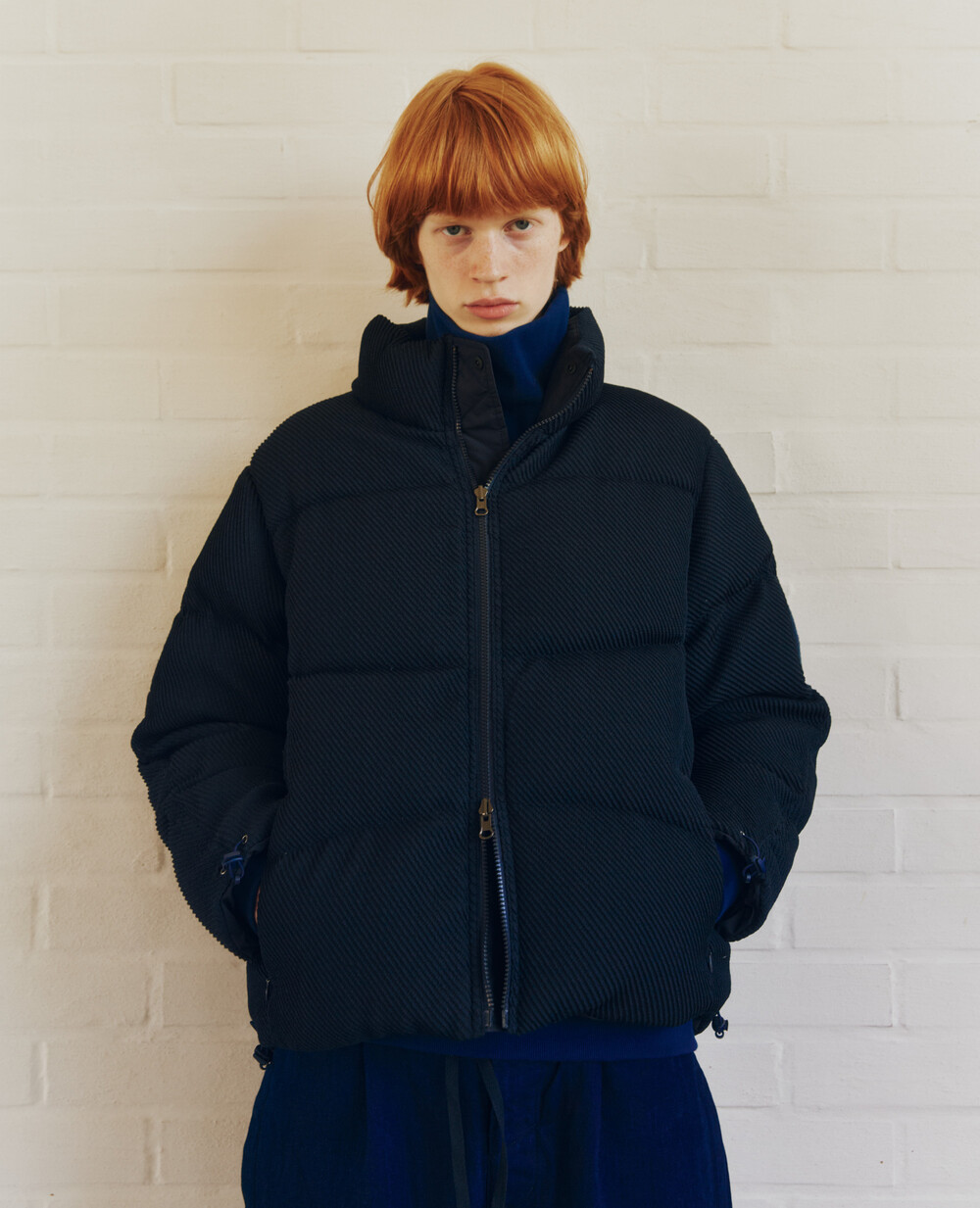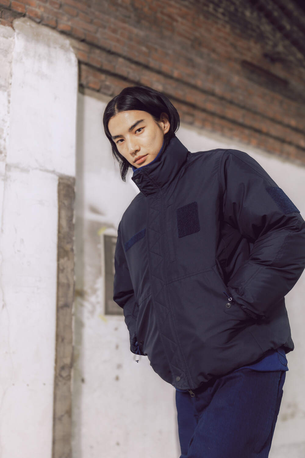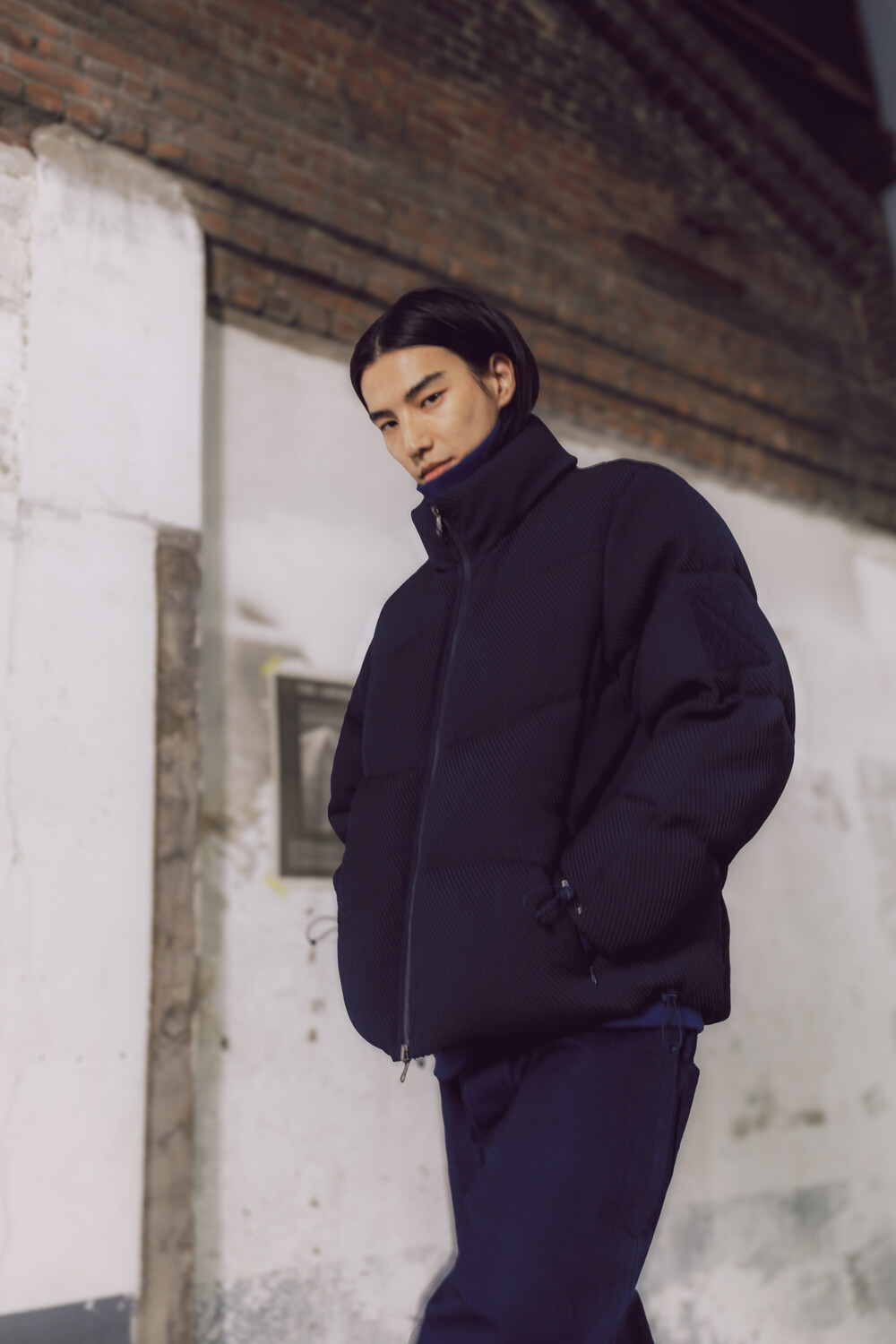 The outer side features a soft, dense wool surface with an asymmetric down-quilted design,creating a sculptural yet understated silhouette.The reverse side takes inspiration from the MA-1 flight jacket, combining functionality with a utilitarian mood.