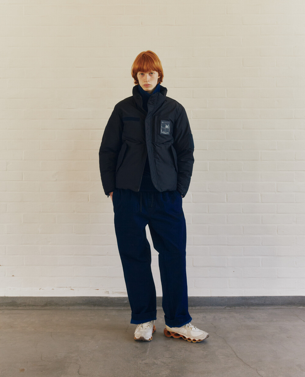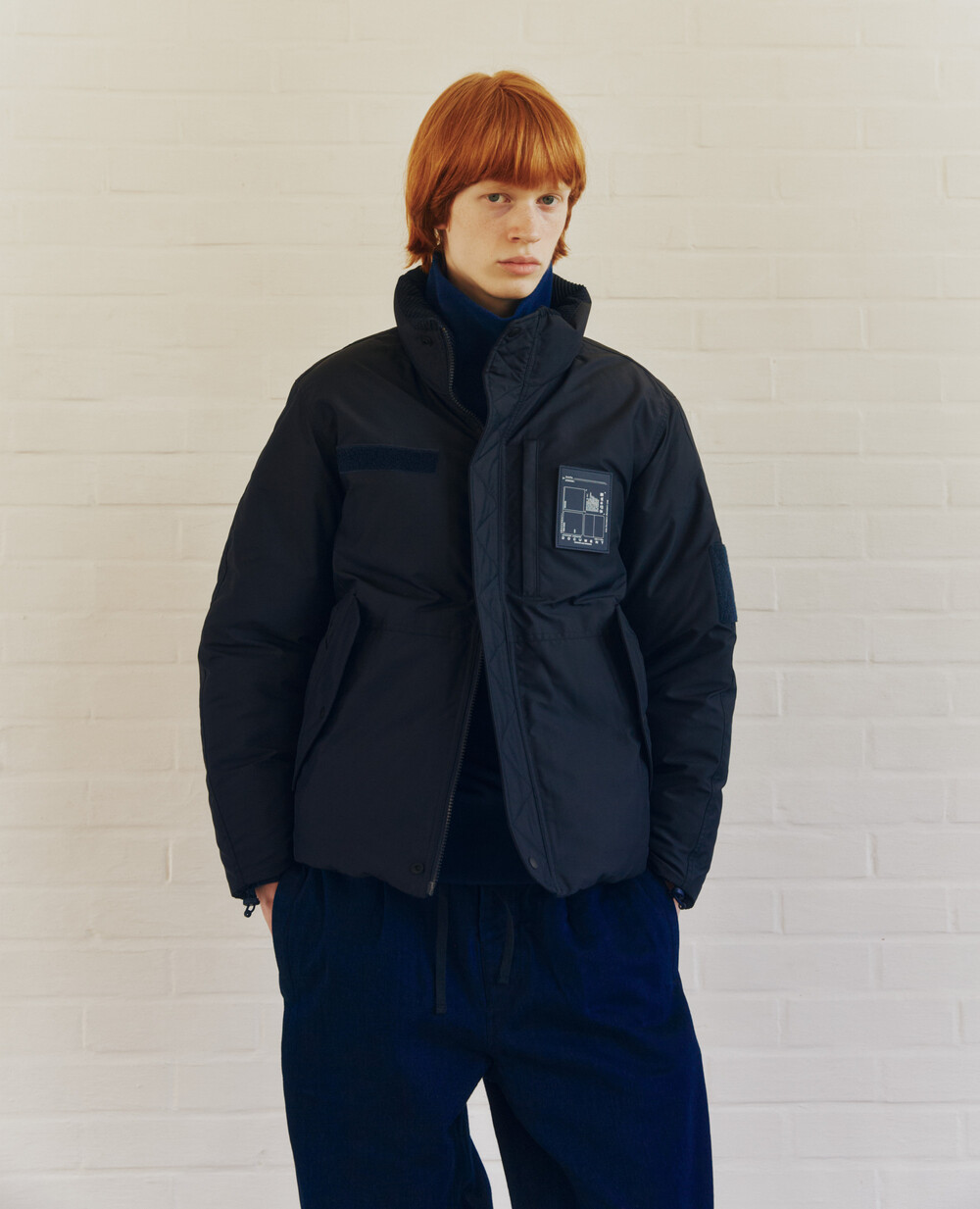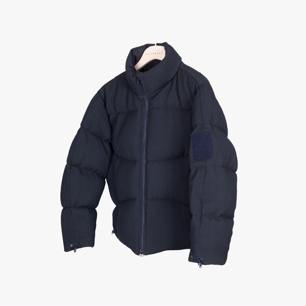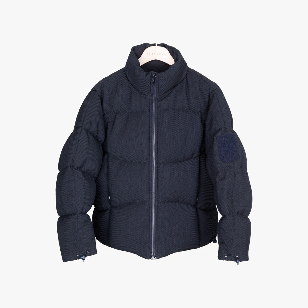 The outer side features a soft, dense wool surface with an asymmetric down-quilted design,creating a sculptural yet understated silhouette.The reverse side takes inspiration from the MA-1 flight jacket, combining functionality with a utilitarian mood.