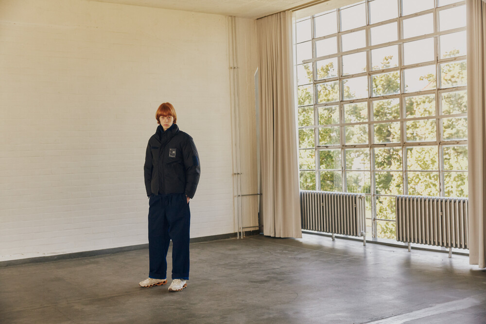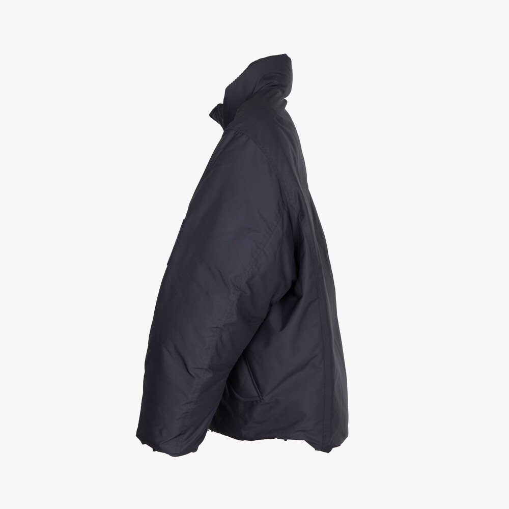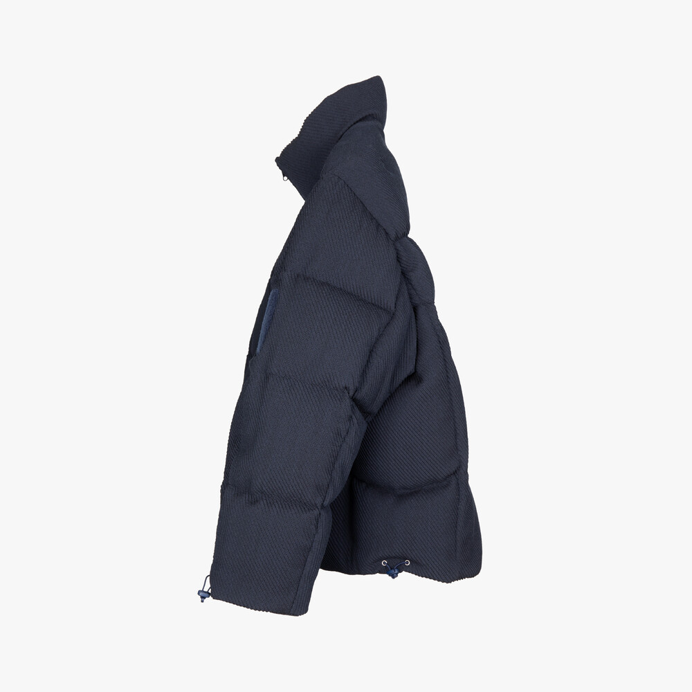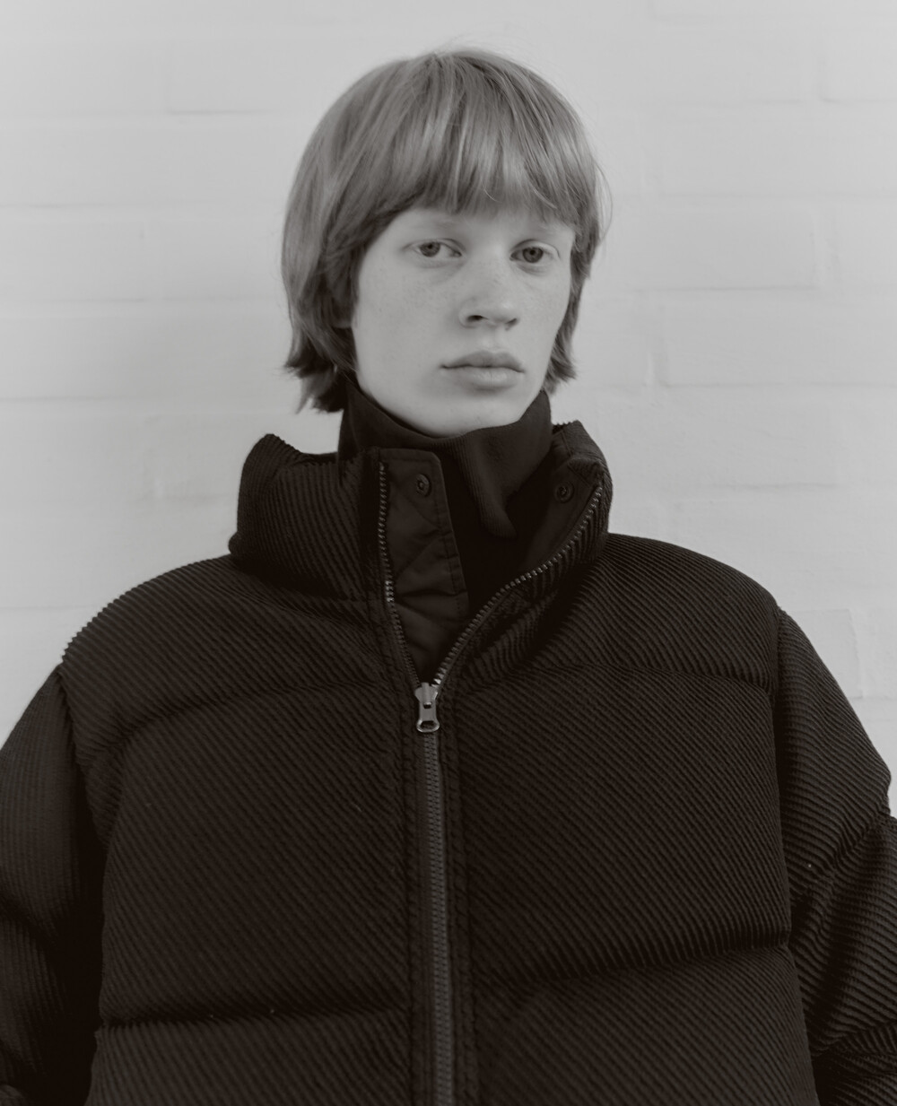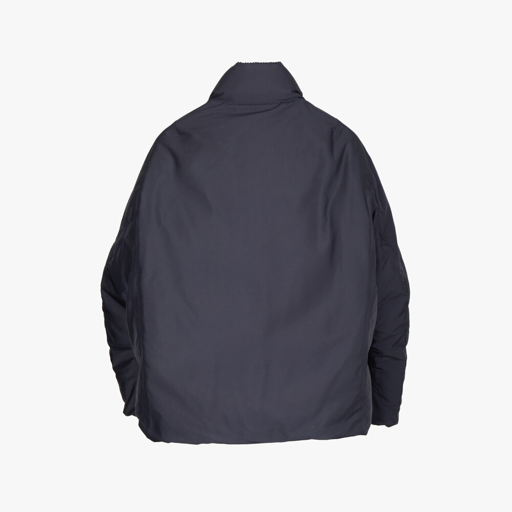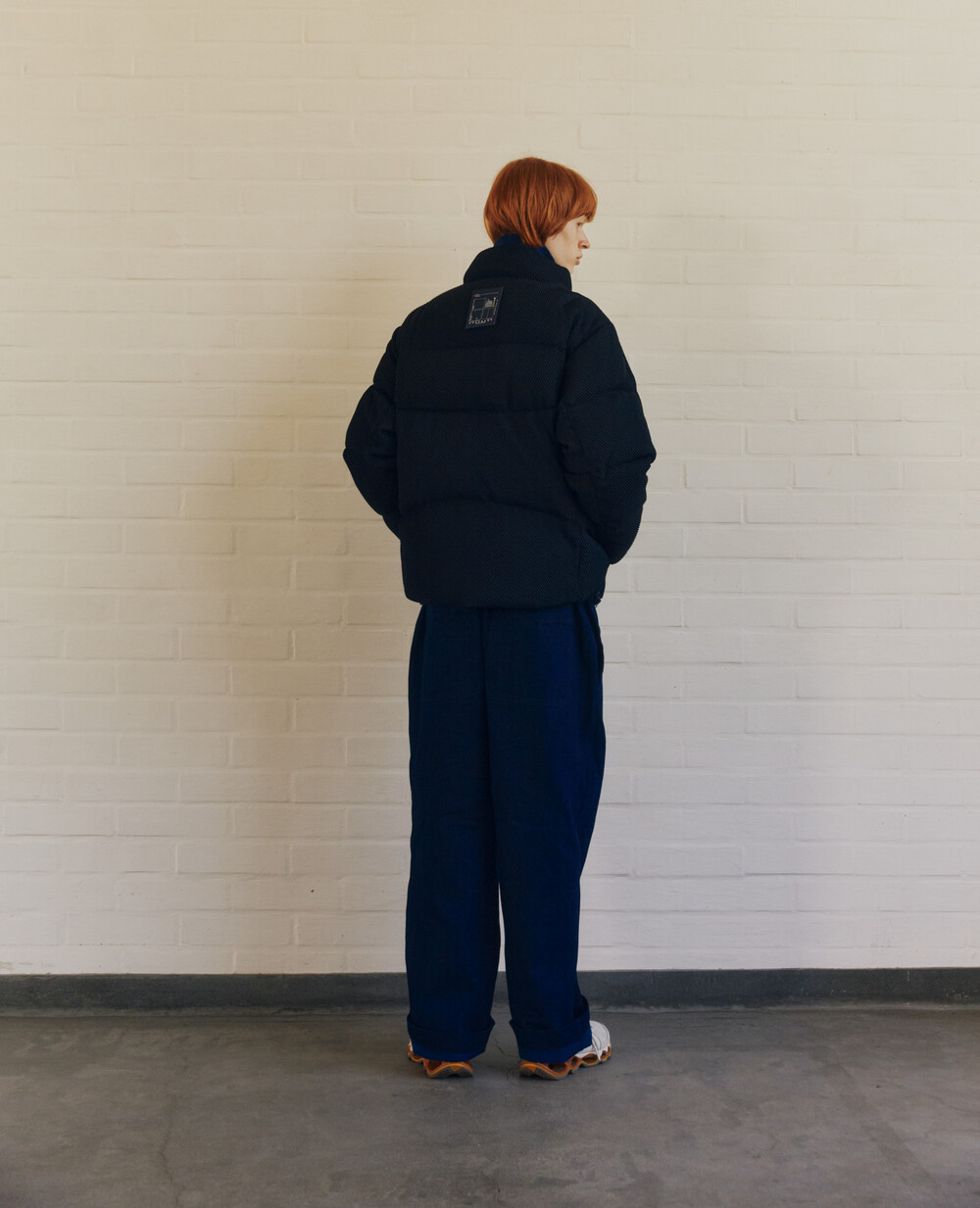 The outer side features a soft, dense wool surface with an asymmetric down-quilted design,creating a sculptural yet understated silhouette.The reverse side takes inspiration from the MA-1 flight jacket, combining functionality with a utilitarian mood.