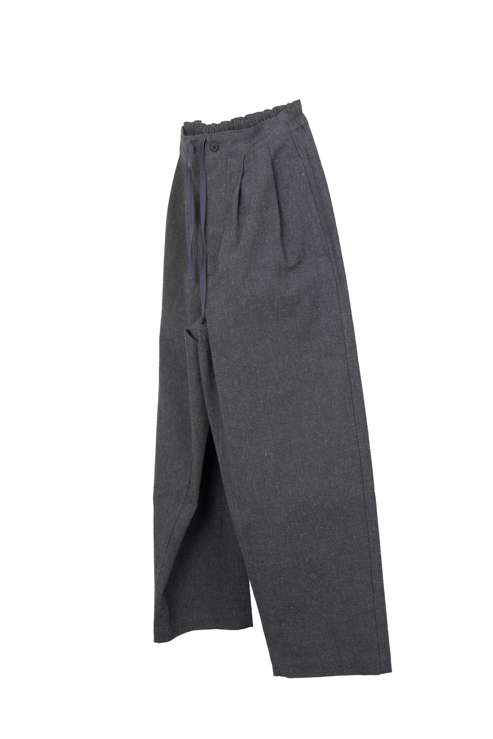 웨이스트 라인에서 내려오는 턱은 입체적이고 테일러드한 분위기를 보여주며, 여유로운 밑단과 함께 직선으로 떨어지는 풍성한 실루엣을 보입니다.