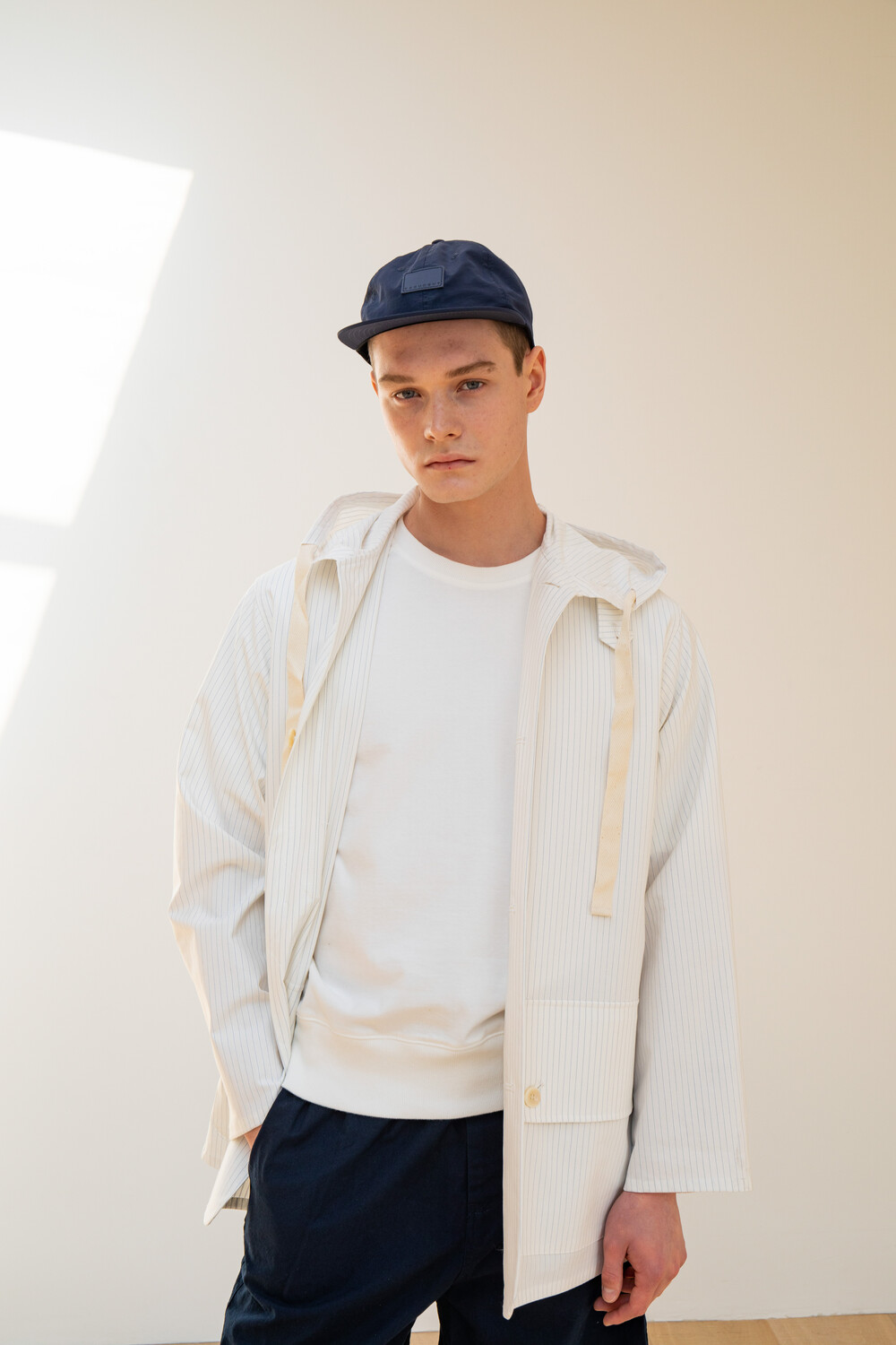 Snow parka의 23ss 버전으로 밀리터리 웨어를 모티브로 한 디자인과 고급스러운 흰 바탕에 네이비색 스트라이프가 돋보이는