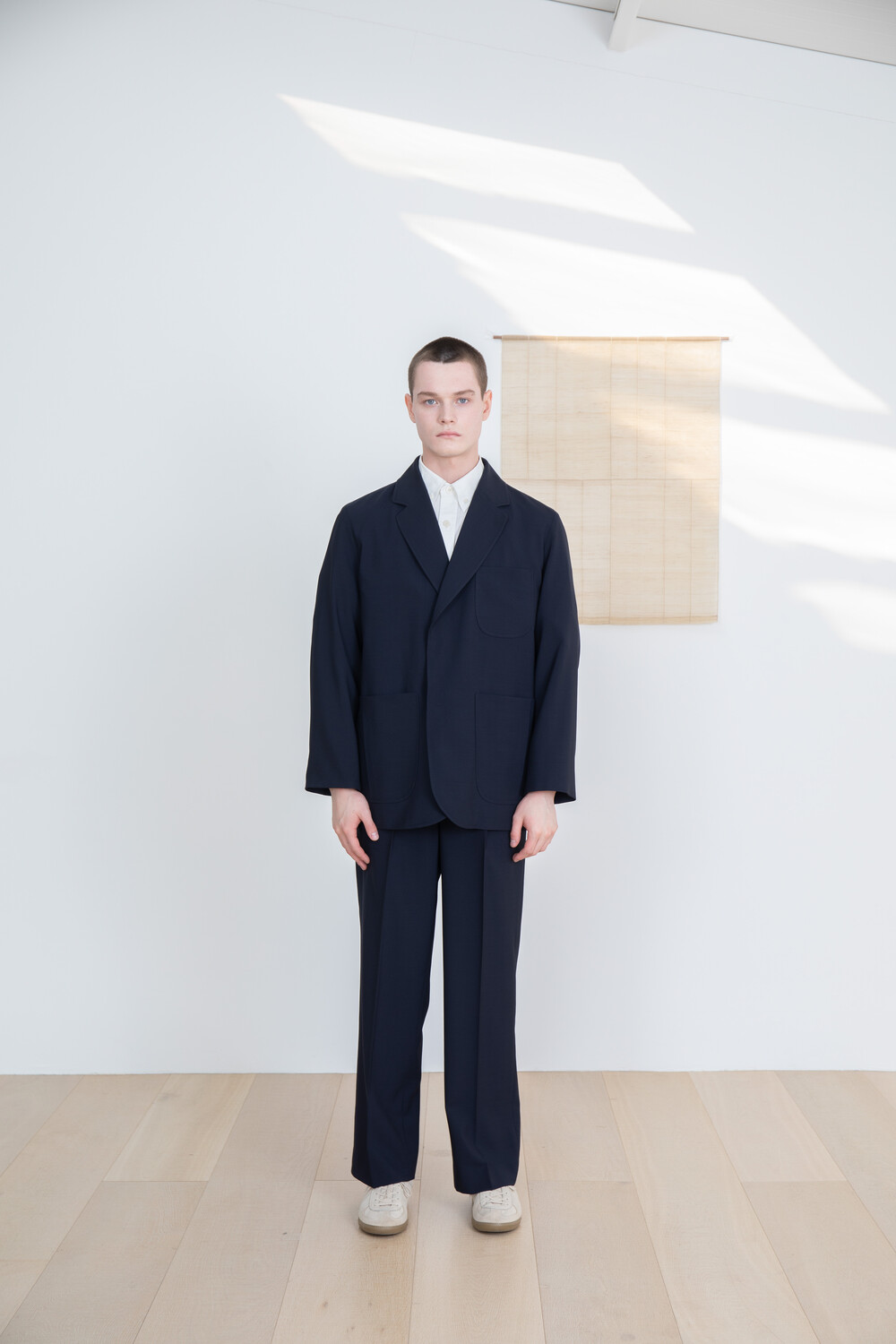 NAVY HOPSACK FABRIC 이 돋보이는 WIDE&EASY TROUSERS입니다.