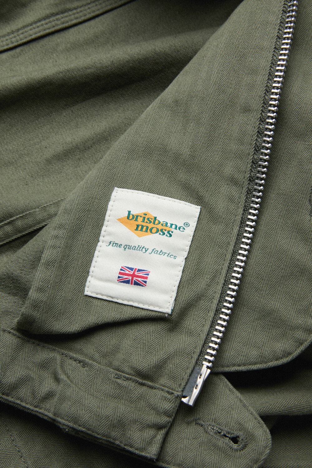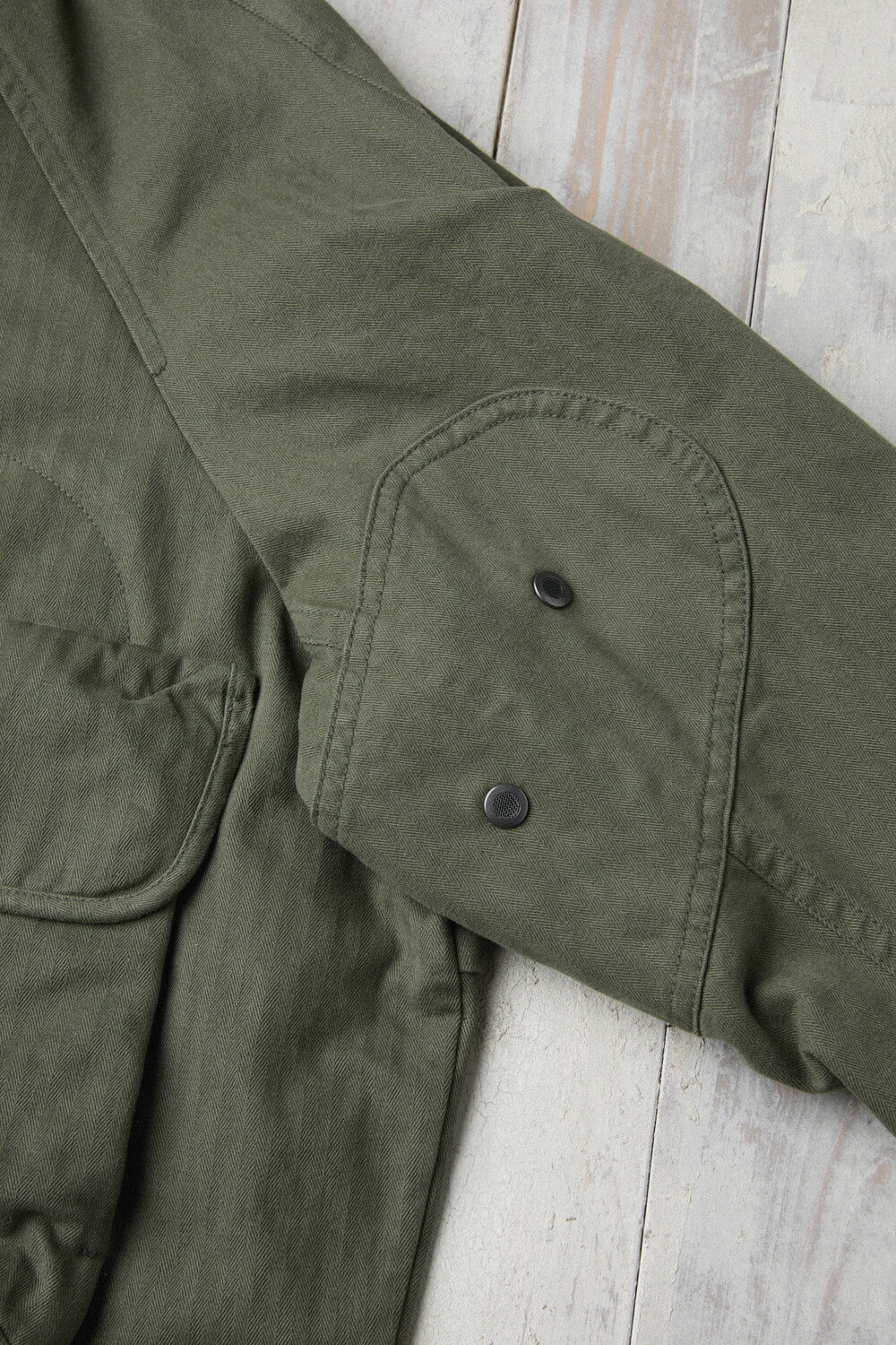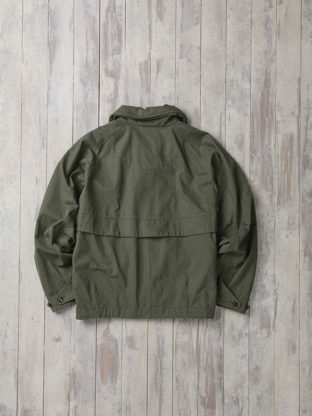 The jacket is made from Brisbane Moss’ UK herringbone cotton, finished with a garment-wash process to bring out a vintage tone and a rich, dimensional texture. As it’s worn, the fabric naturally evolves in tone and hand feel, developing an even more distinctive character over time.