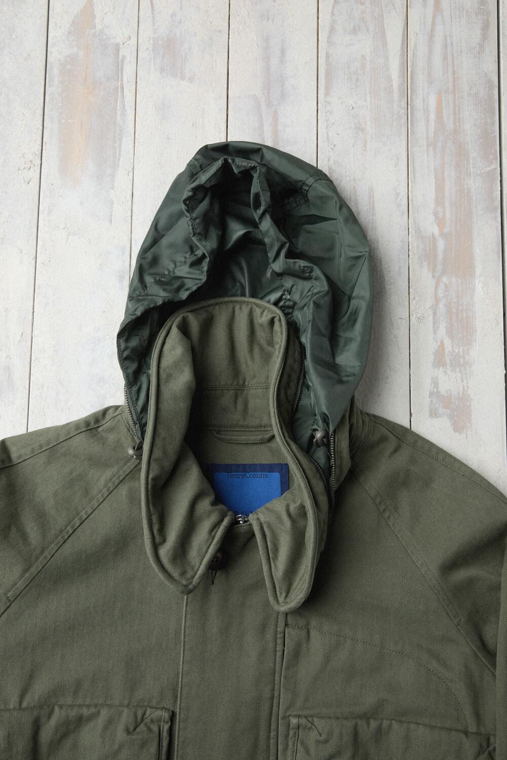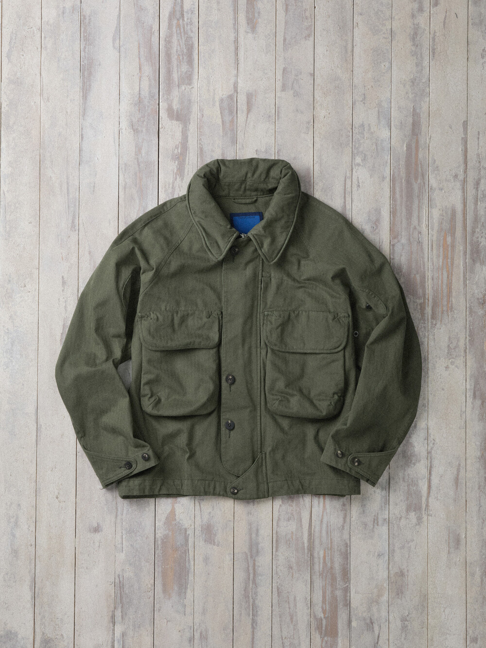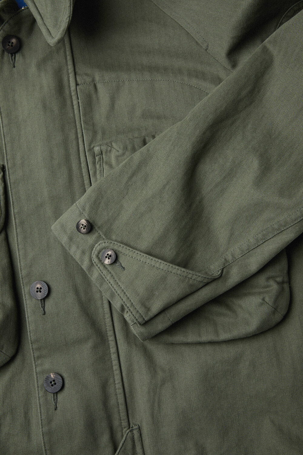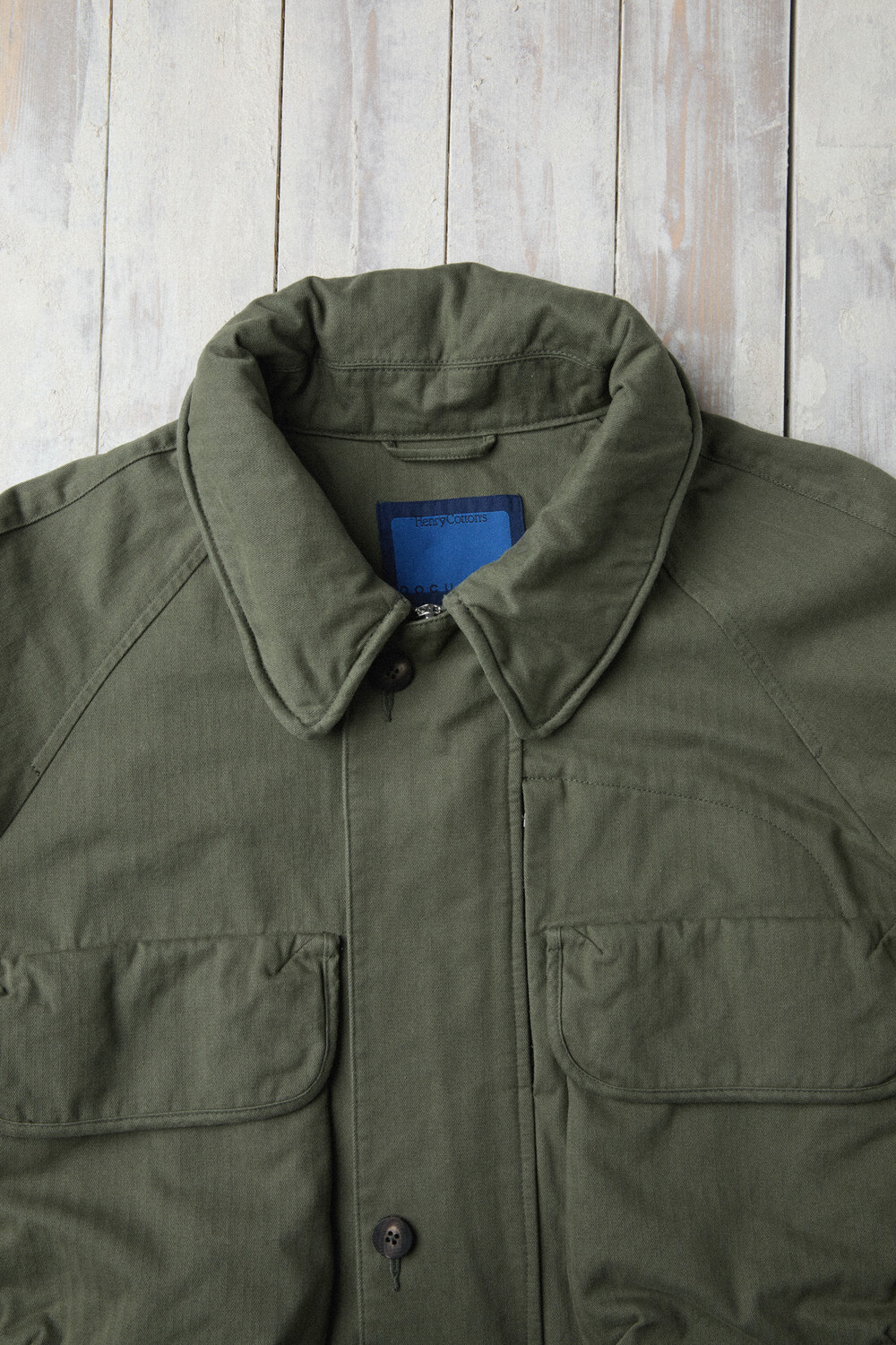 The jacket is made from Brisbane Moss’ UK herringbone cotton, finished with a garment-wash process to bring out a vintage tone and a rich, dimensional texture. As it’s worn, the fabric naturally evolves in tone and hand feel, developing an even more distinctive character over time.
