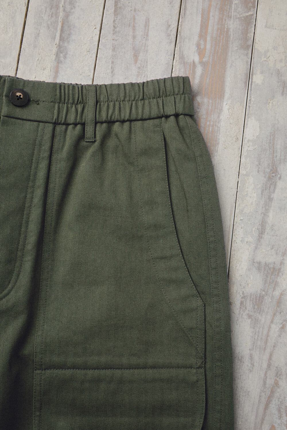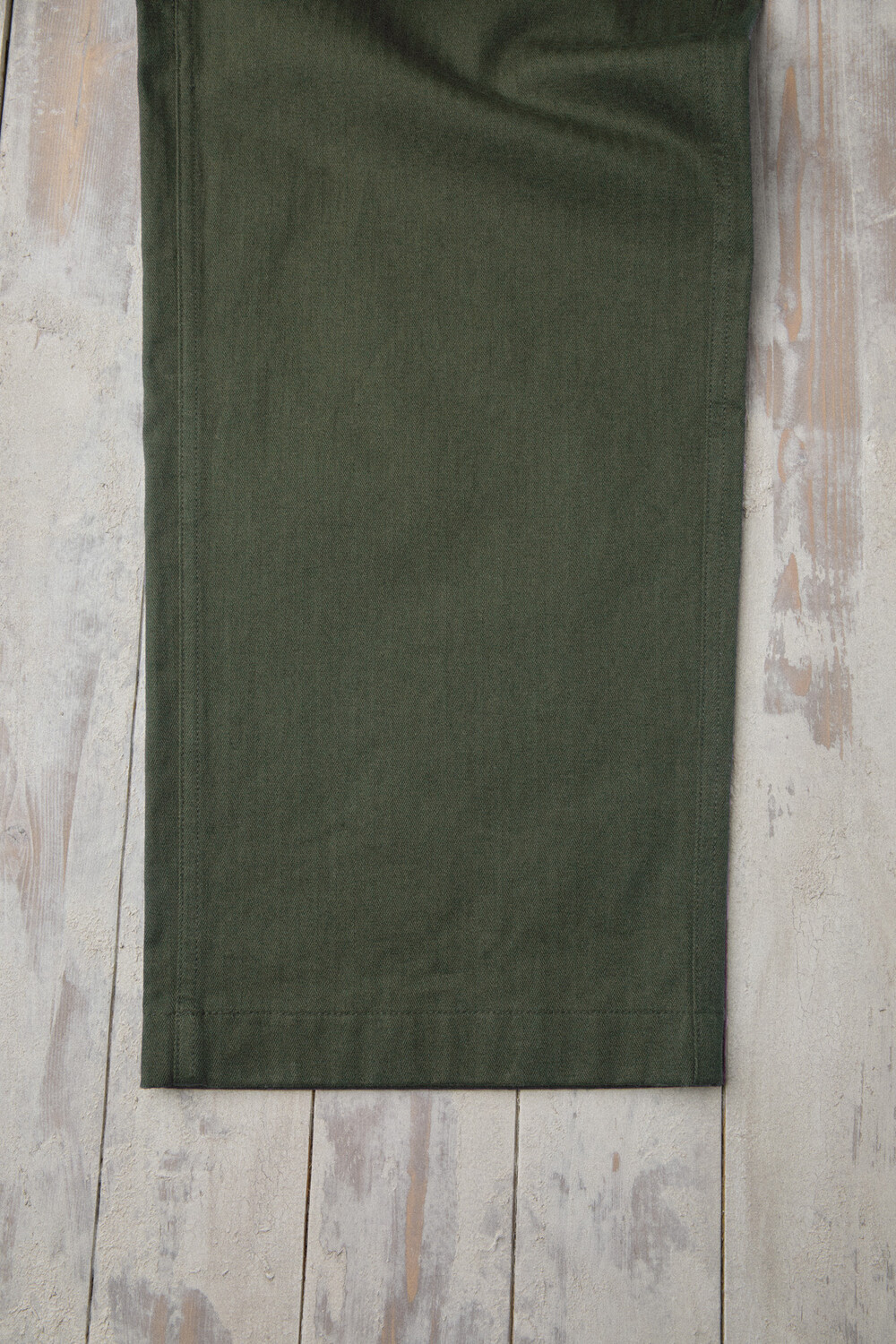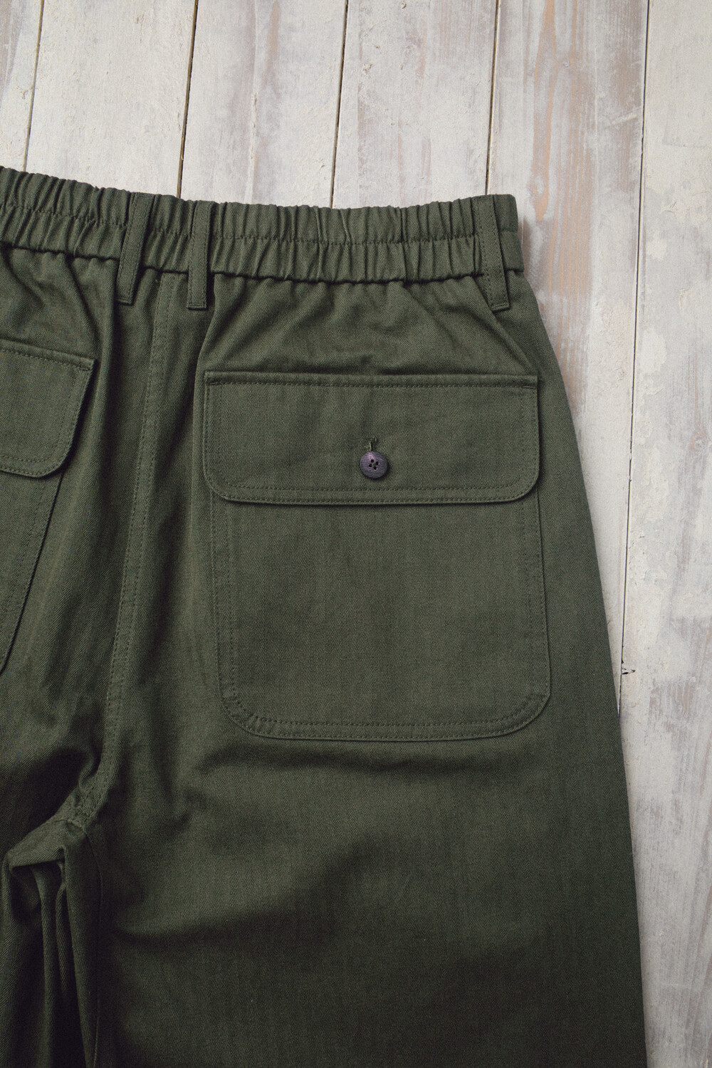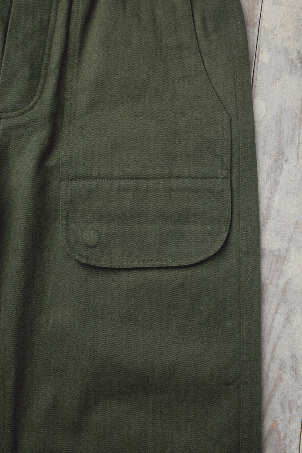 A pair of Brisbane Moss herringbone cotton pants that only gets better with time. Made from 100% herringbone cotton by Brisbane Moss (UK), the fabric shows a fine, tight grain—crisp and defined up close, yet deep and rich in tone from a distance. Finished with a garment-wash process, it feels broken-in from the start: not overly stiff, but still structured with a dense, substantial texture. With wear, the surface tone softens and creases settle naturally, creating a beautiful patina over time. It’s a fabric made to feel less “brand new” and more like something that becomes truly yours.