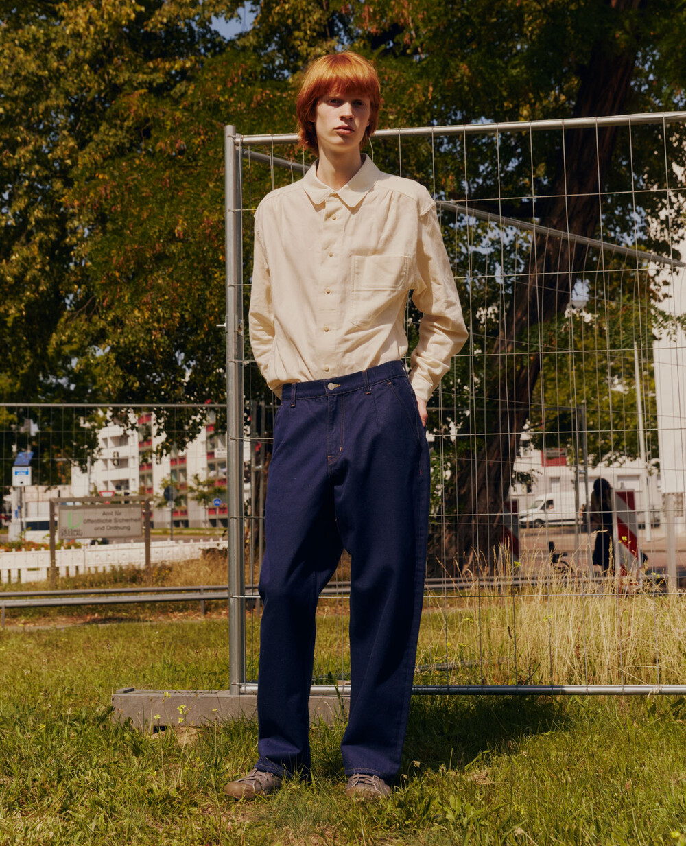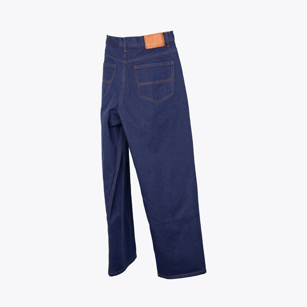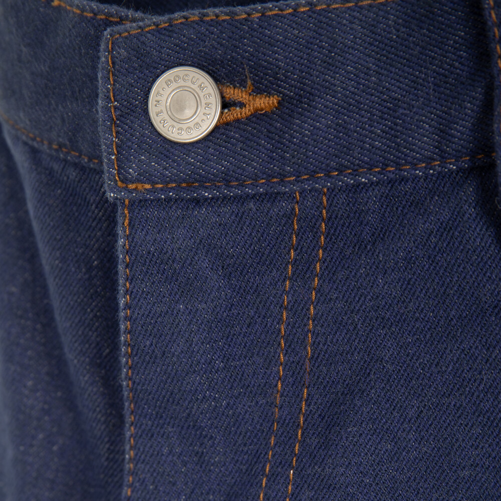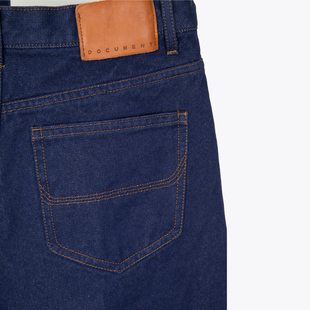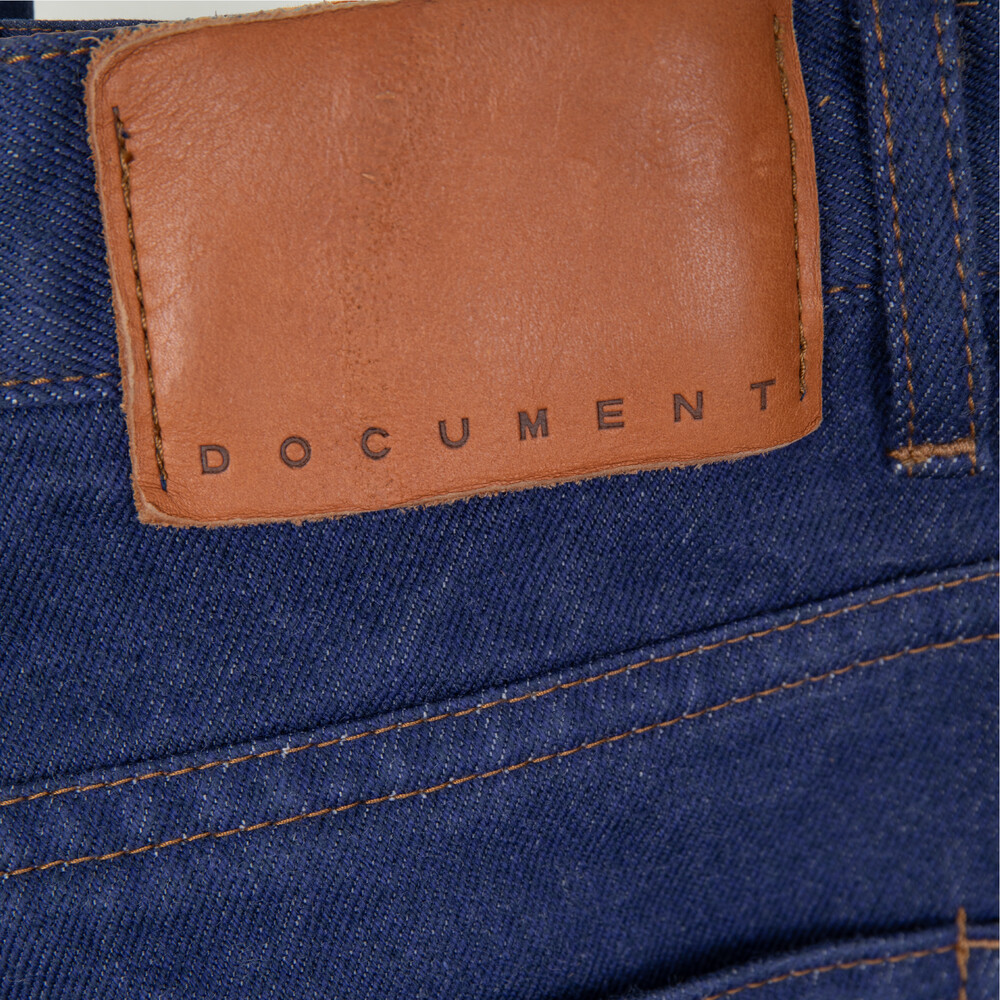 Rooted in a classic 5-pocket design, the silhouette is cut in a semi-wide tapered fit that provides ease while gradually narrowing toward the hem. The front features angled pockets, enhancing practicality while adding a dynamic line to the design. At the back, a washed leather label introduces a natural texture, while DOCUMENT-branded rivets and canton button complete the piece with understated detail.