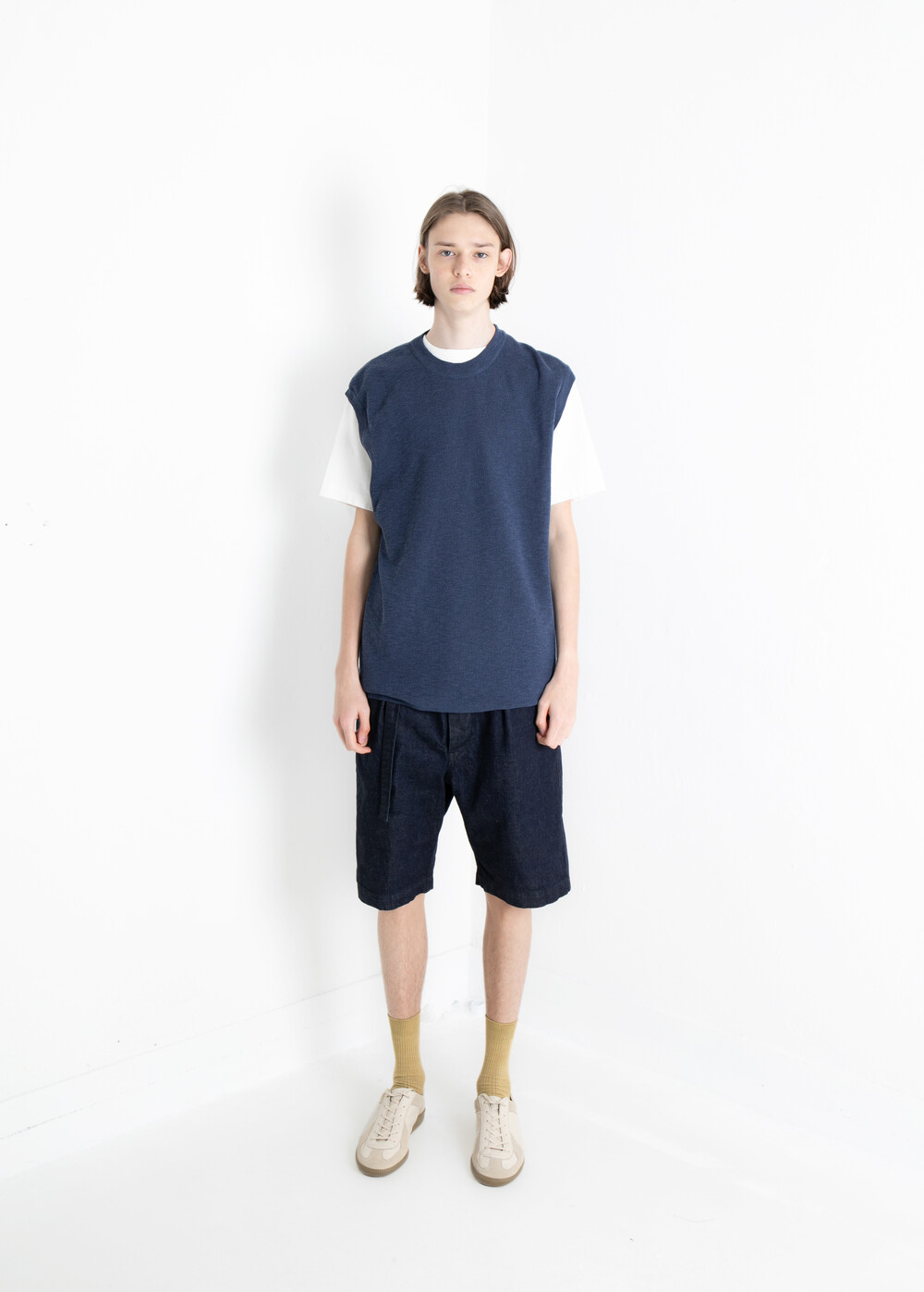 허리 앞쪽에 턱이 있는 구조이며, 도큐먼트에서 제안하는 여유로운 실루엣의 쇼츠입니다.