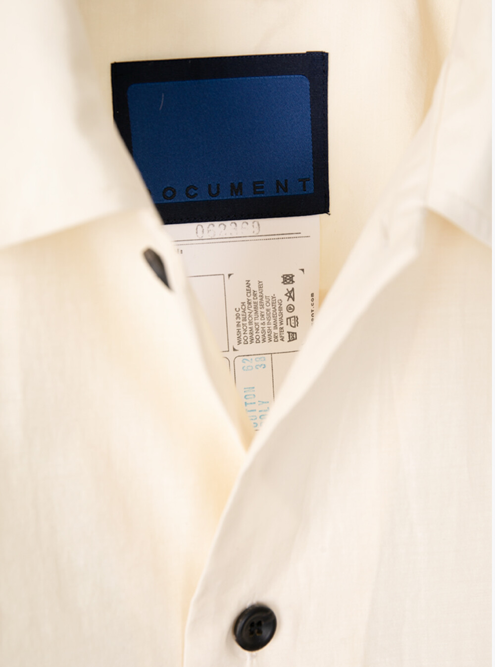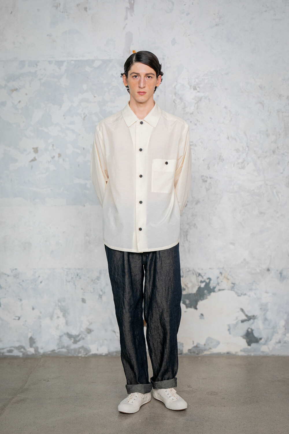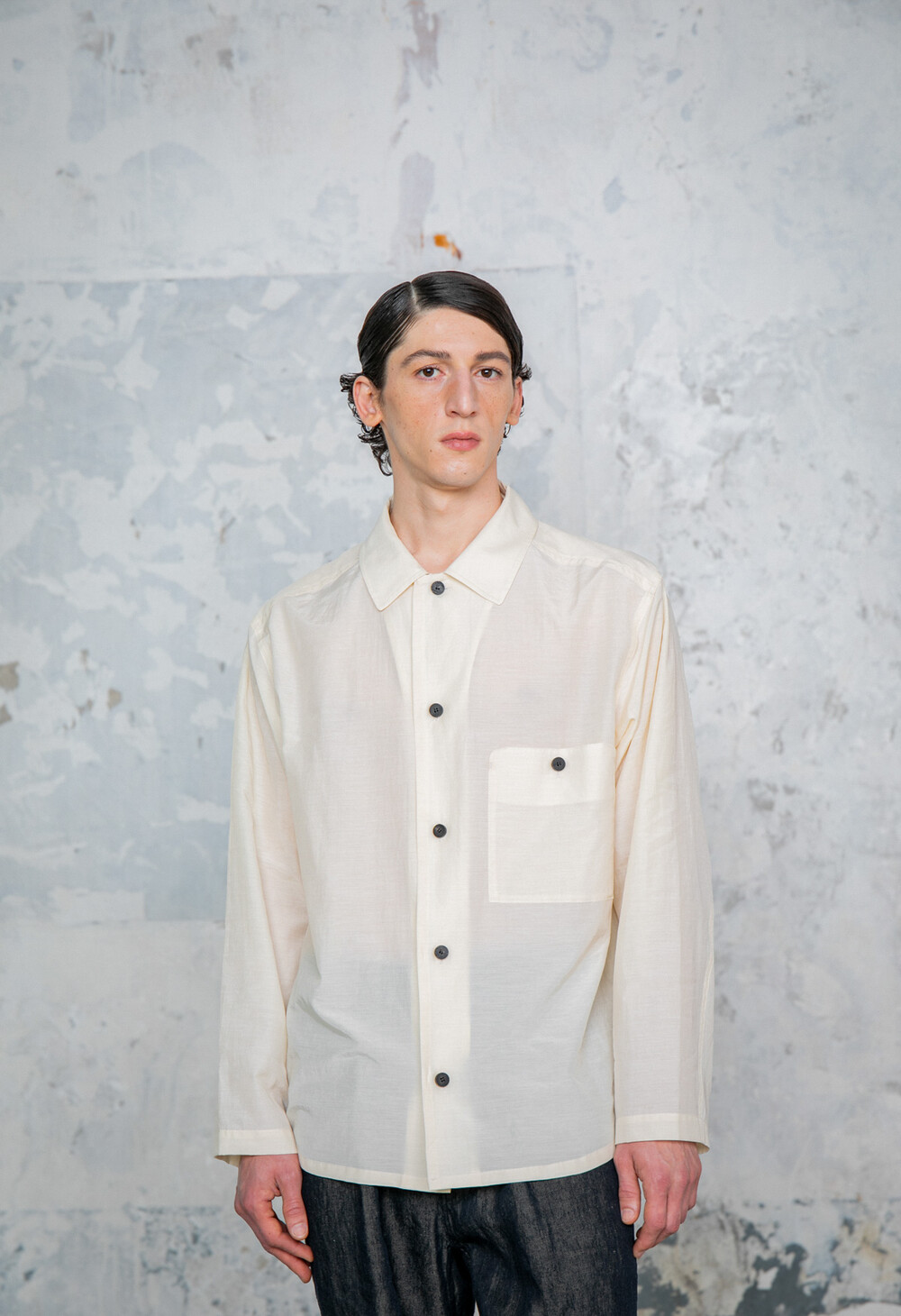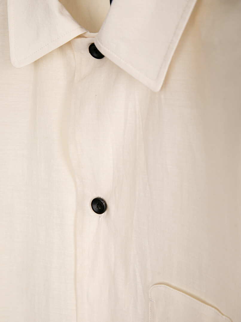 여유 있는 실루엣으로 유려한 이미지를 연출할 수 있습니다. 도큐먼트를 연상할 수 있는 곡선 모양의 가슴 주머니가 있고, 셔츠이지만 소매 활동성을 고려하여 자켓에 주로 사용하는 두 장 소매로 재단되었습니다.