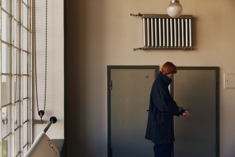 Designed in a car coat silhouette, it features a high stand collar with button fastening, flap pockets, and a clean hidden front closure.The tailored sleeve line follows the natural curve of the arm, combining structure with ease of movement.