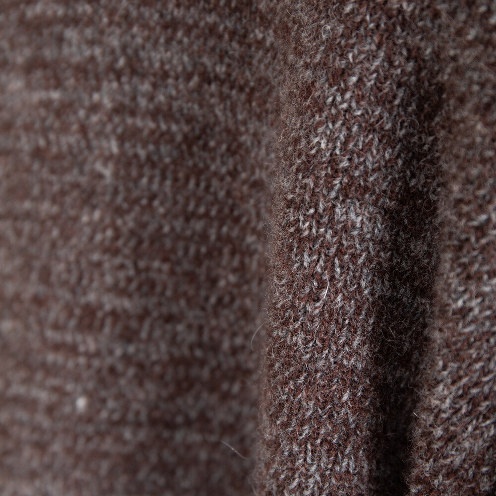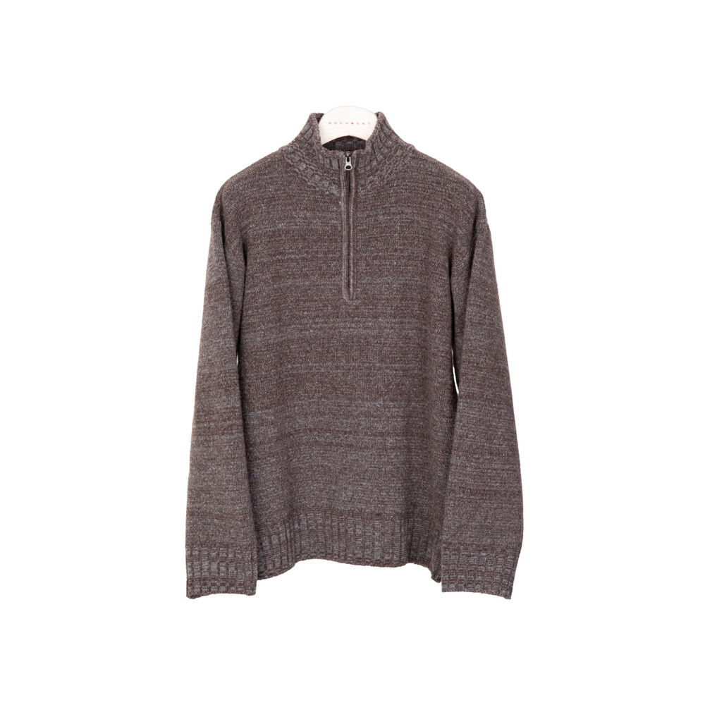This half zip-up sweater is crafted using a technique of twisting two different colors of lambswool yarns during the knitting process. The result is a deep tweed texture and a natural mélange tone, with each piece carrying its own unique character. Unlike yarns blended at the spinning stage, the crossed yarns during knitting create a more dimensional and vivid coloration.