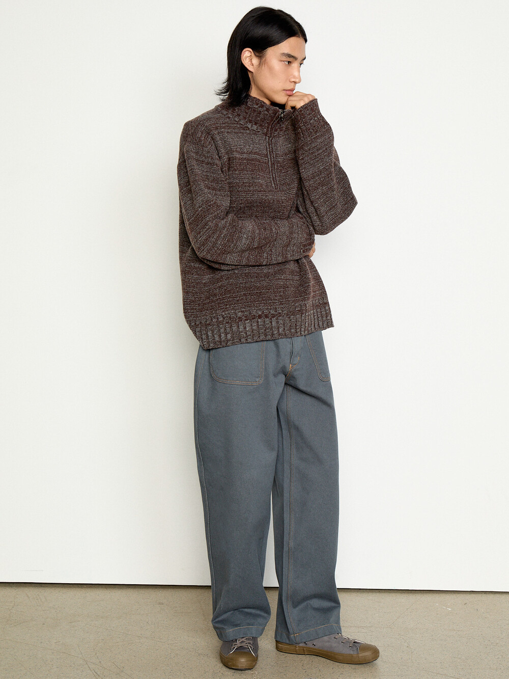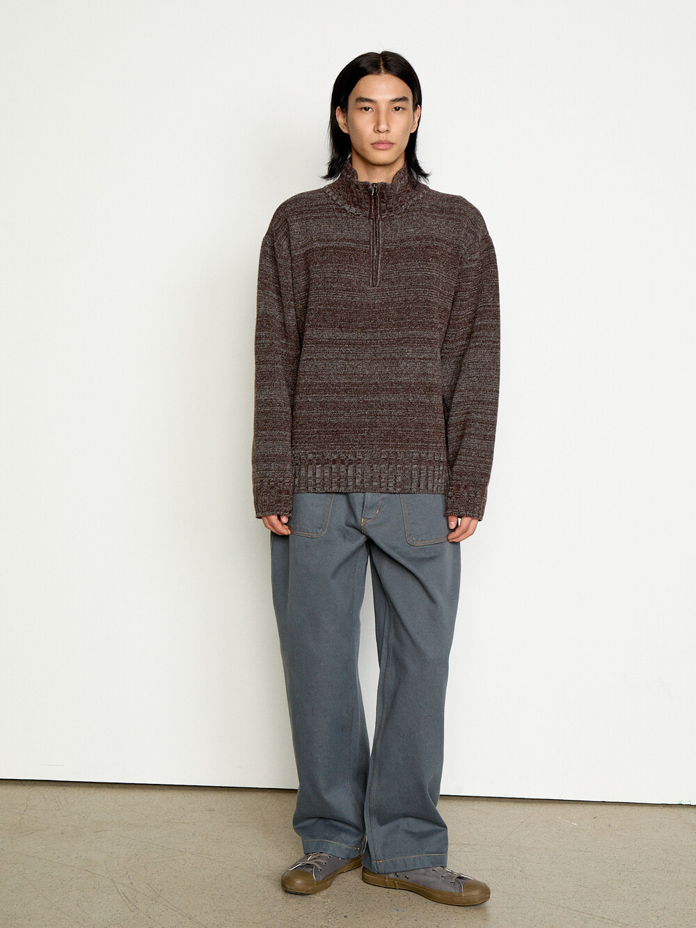: LAMBSWOOL TWEED HALF ZIP-UP SWEATER_BROWN