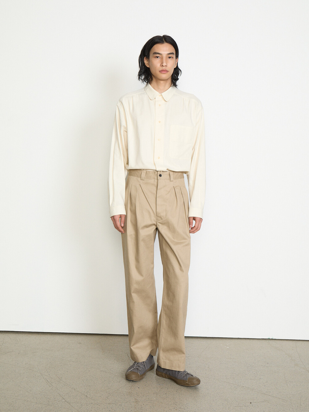 암홀라인보다 길게 내려와 형성된 요크는 양 쪽 가장자리에 주름을 잡고 있어서, 도큐먼트 셔츠의 또다른 형태를 제안합니다.