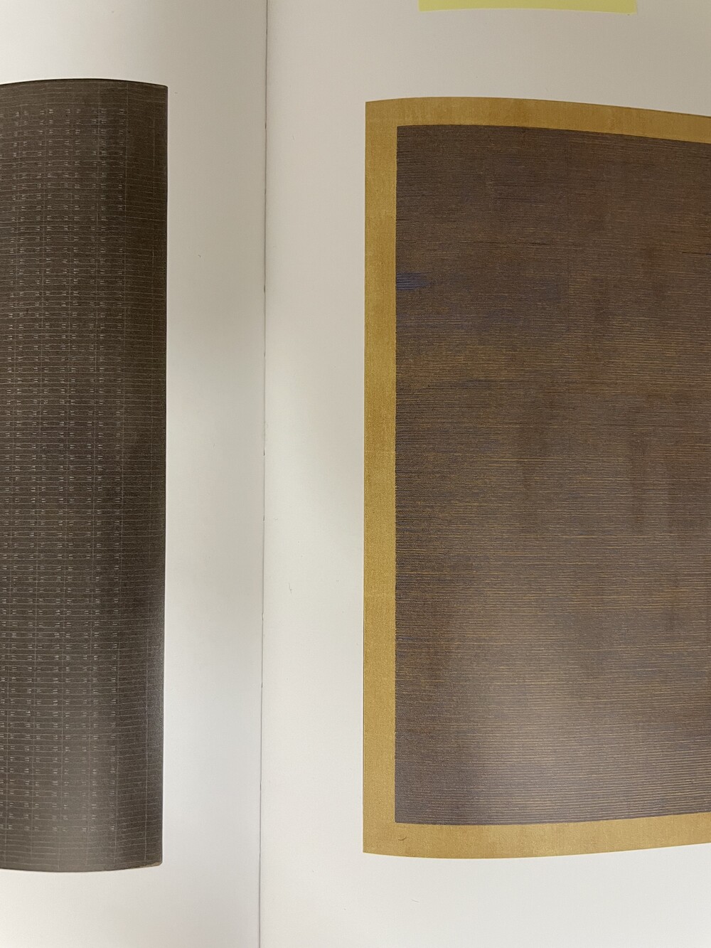 사각형, 격자무늬와 캔버스 위의 연필선, 그리고 색조의 미묘한 변주를 구사한 회화들은 마치 직물을 짜는 듯하게 보입니다