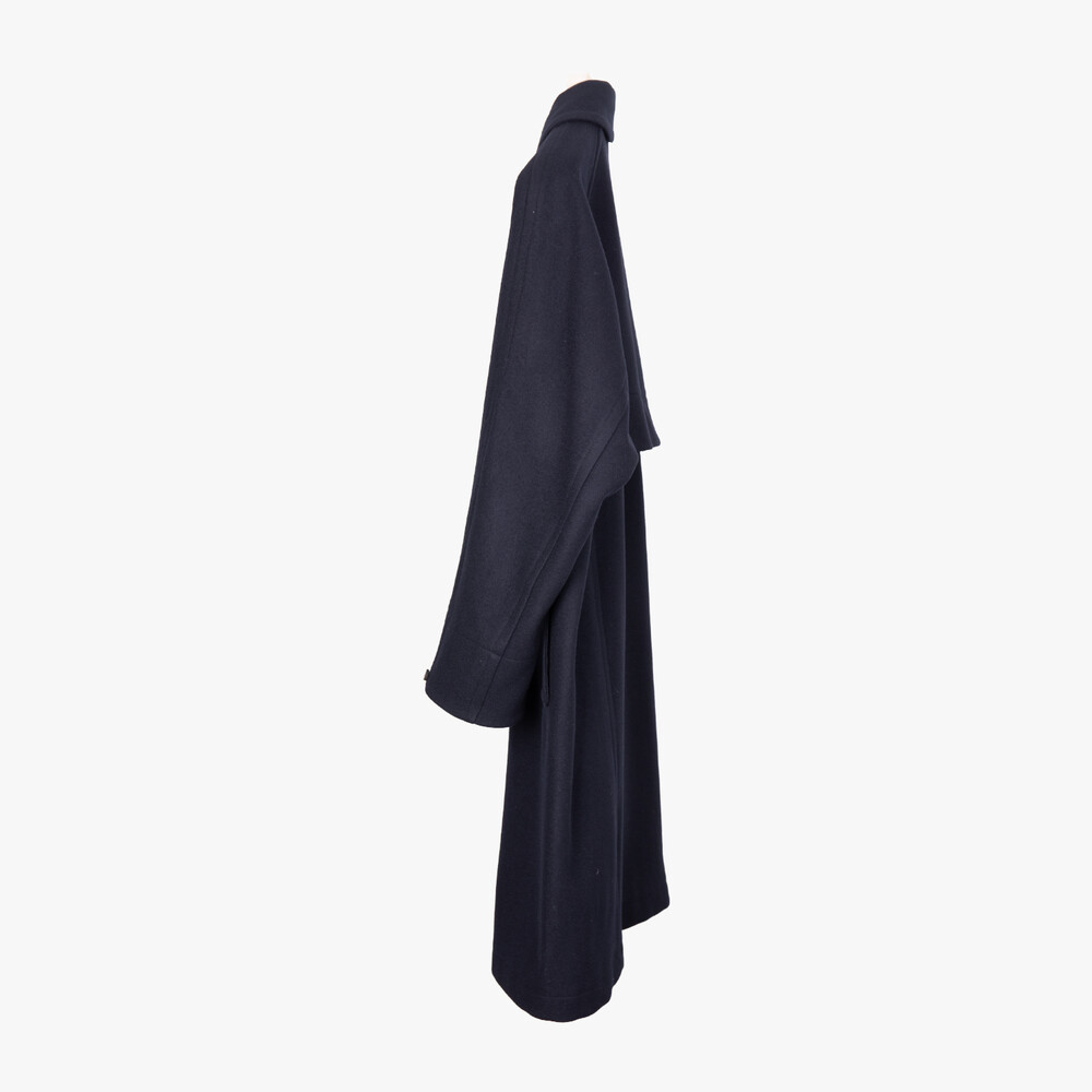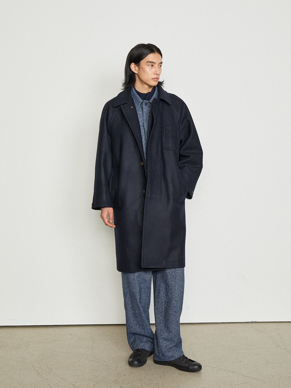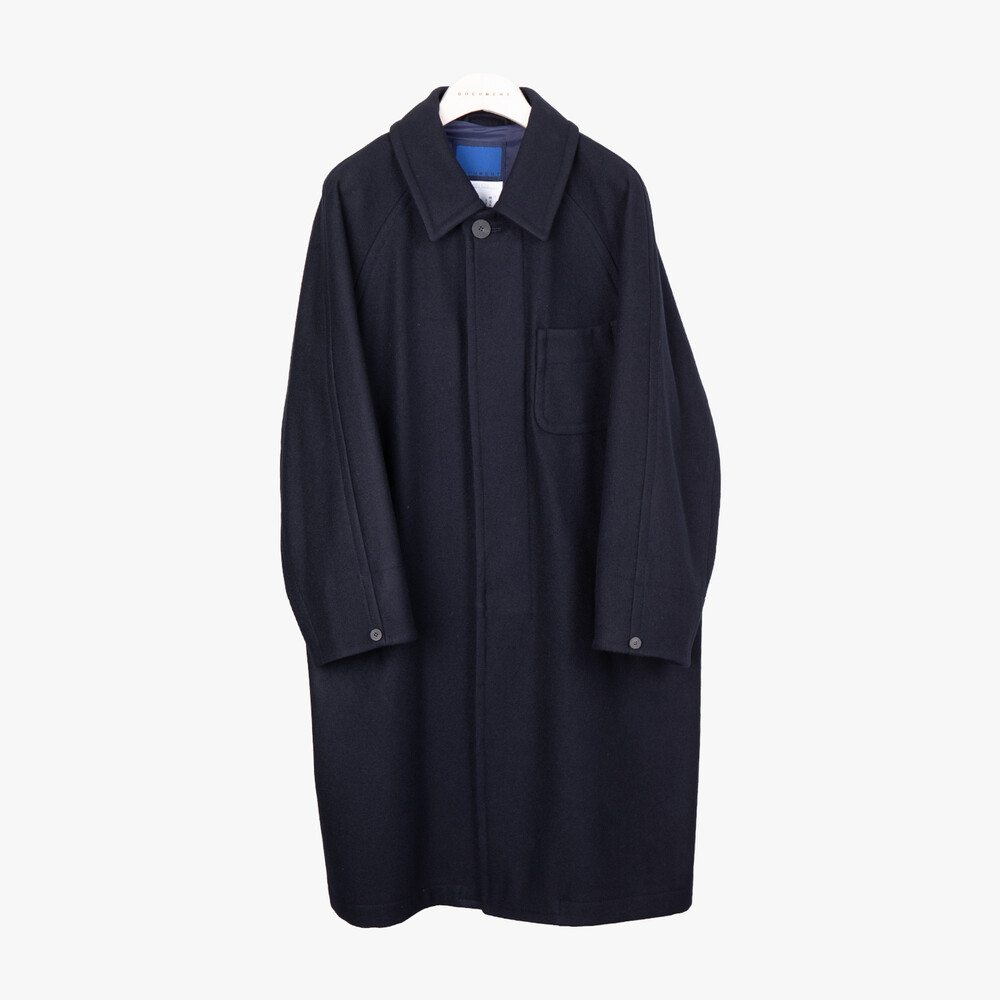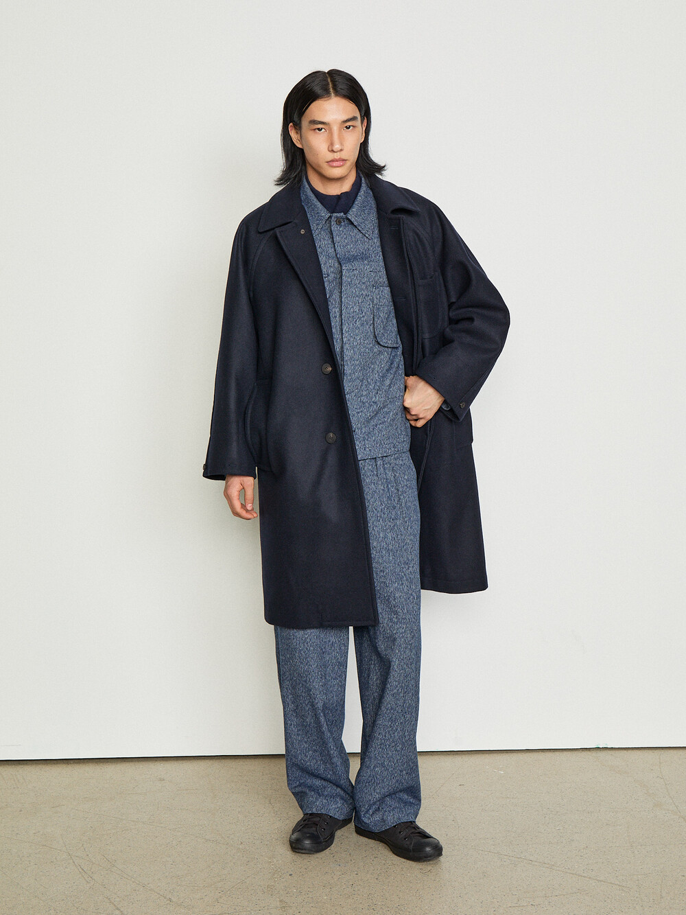 여유 있는 실루엣과 네이비 컬러의 진중함이 조화를 이루는 코트입니다.밀도 높은 22oz 원단으로 제작되어 두께감이 느껴지지만,헤비 멜톤보다 가볍고 유연한 착용감을 제공합니다.
