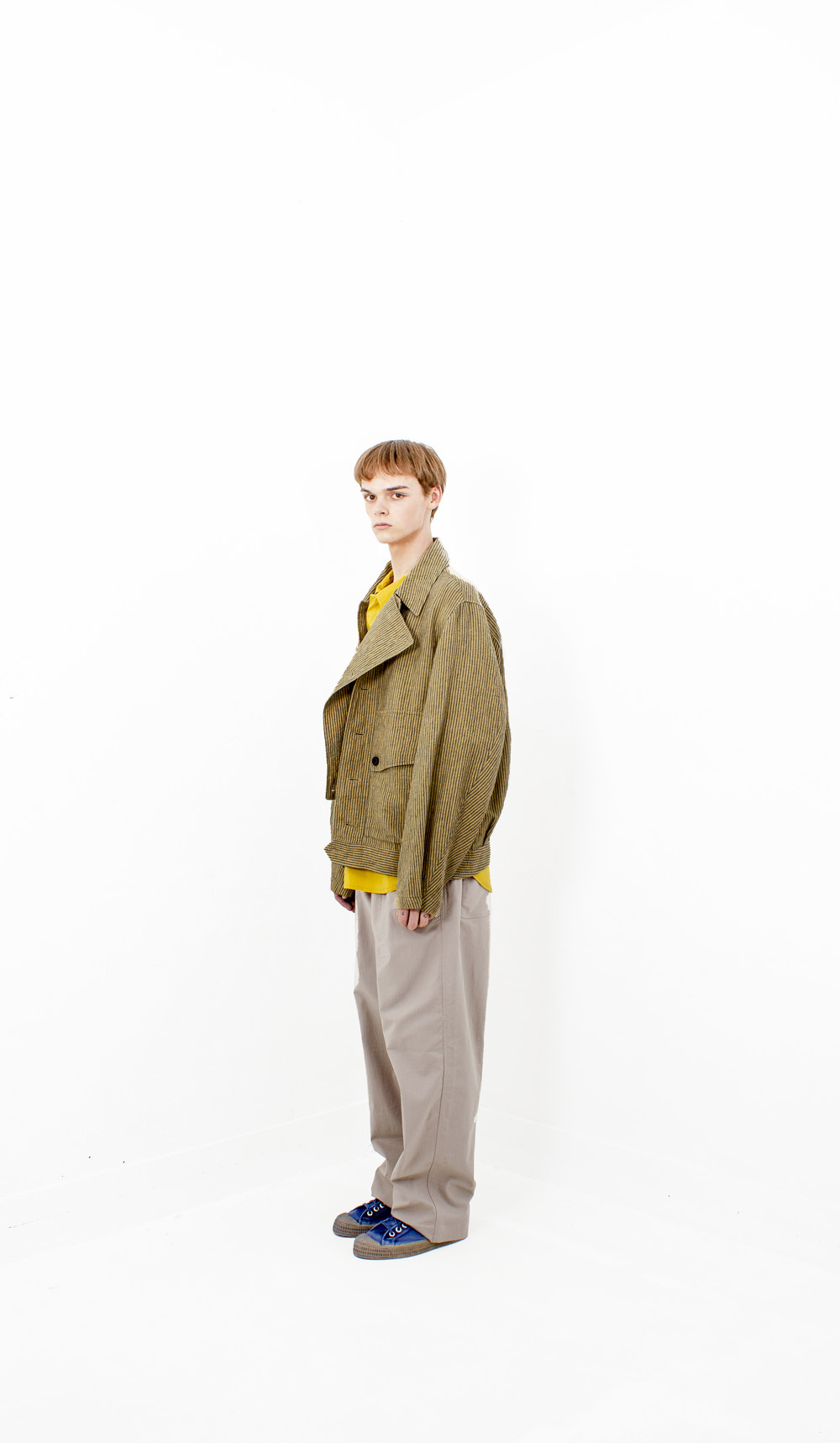 지난 겨울에는 무게감이 있는 울 멜톤이었다면, 현 제품은 가벼운 린넨 소재로,