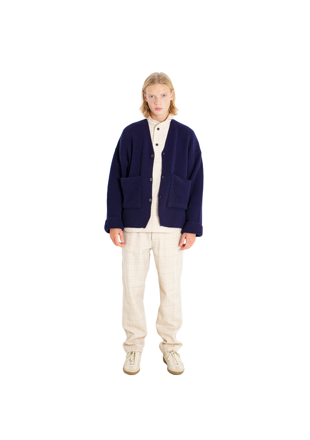 클래식한 V - NECK 가디건을 도큐먼트스럽게 재해석한 디자인으로 루즈한 실루엣을 가지고 있지만, 묵직한 중량감과 큰 포켓 디자인으로 착장시 유니크함을 선사합니다. 리얼 소뿔 단추와 원사의 조합이 돋보이며, 뒤에 수작업으로 단 메인라벨은 아우터로 입었을때, 그 존재감을 드러냅니다.