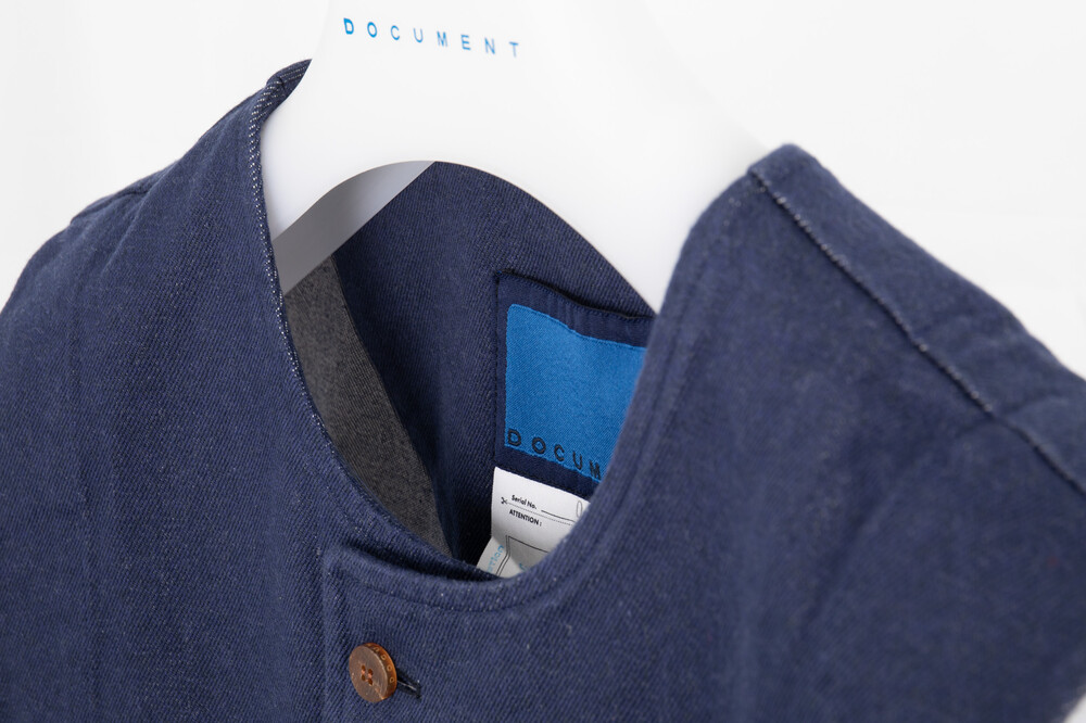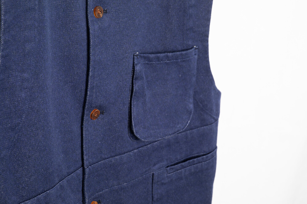 ORGANIC ENGLISH COTTON PAINTER PANTS 와 같은 원단으로 제작된 vest 이며, 워싱 처리가 되어 자연스러운 질감을 표현하고 있습니다.