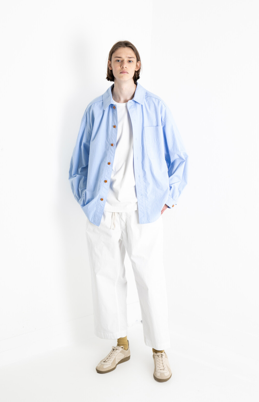 루즈한 핏이 아우터처럼 걸쳐 입기 좋으며, 끝이 부드러운 카라와 루즈함을 살짝 드러내는 옆트임이 있으며, 소매를 걷어 있을 수 있도록 여유있는 사이즈와 독특한 소매 디자인이 특징입니다.
