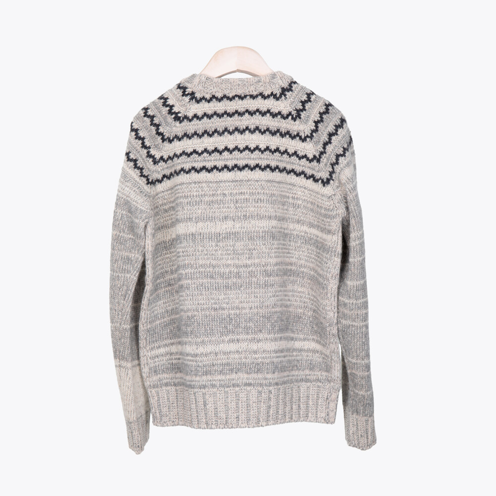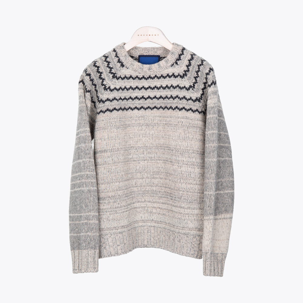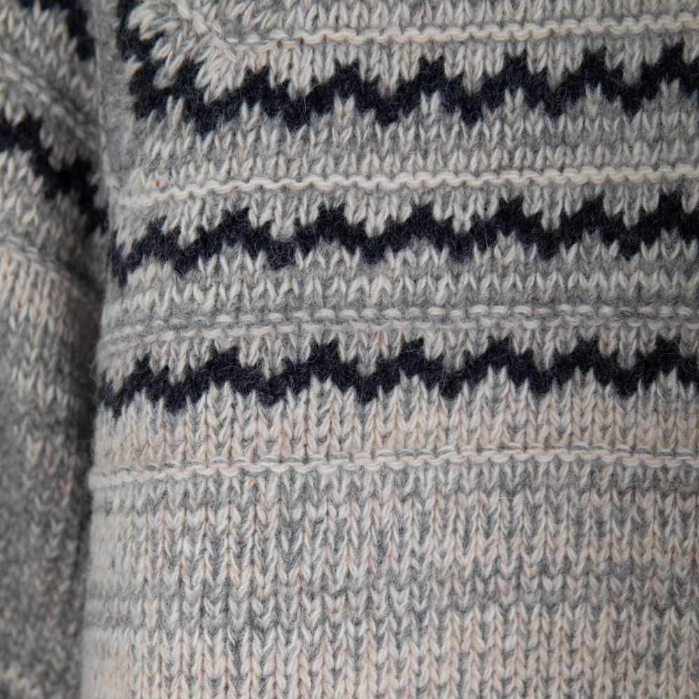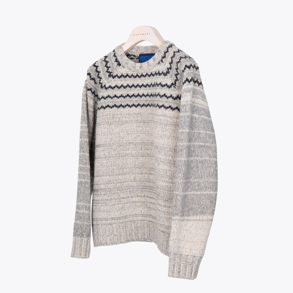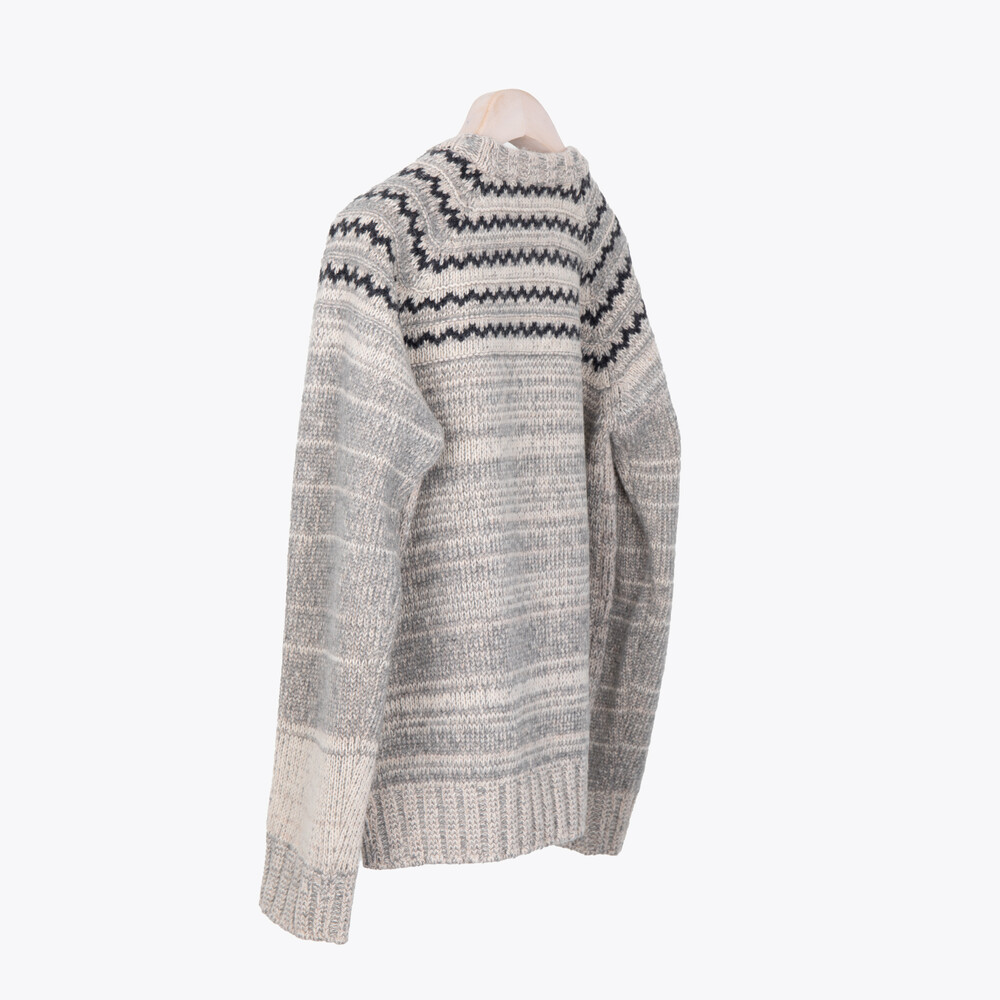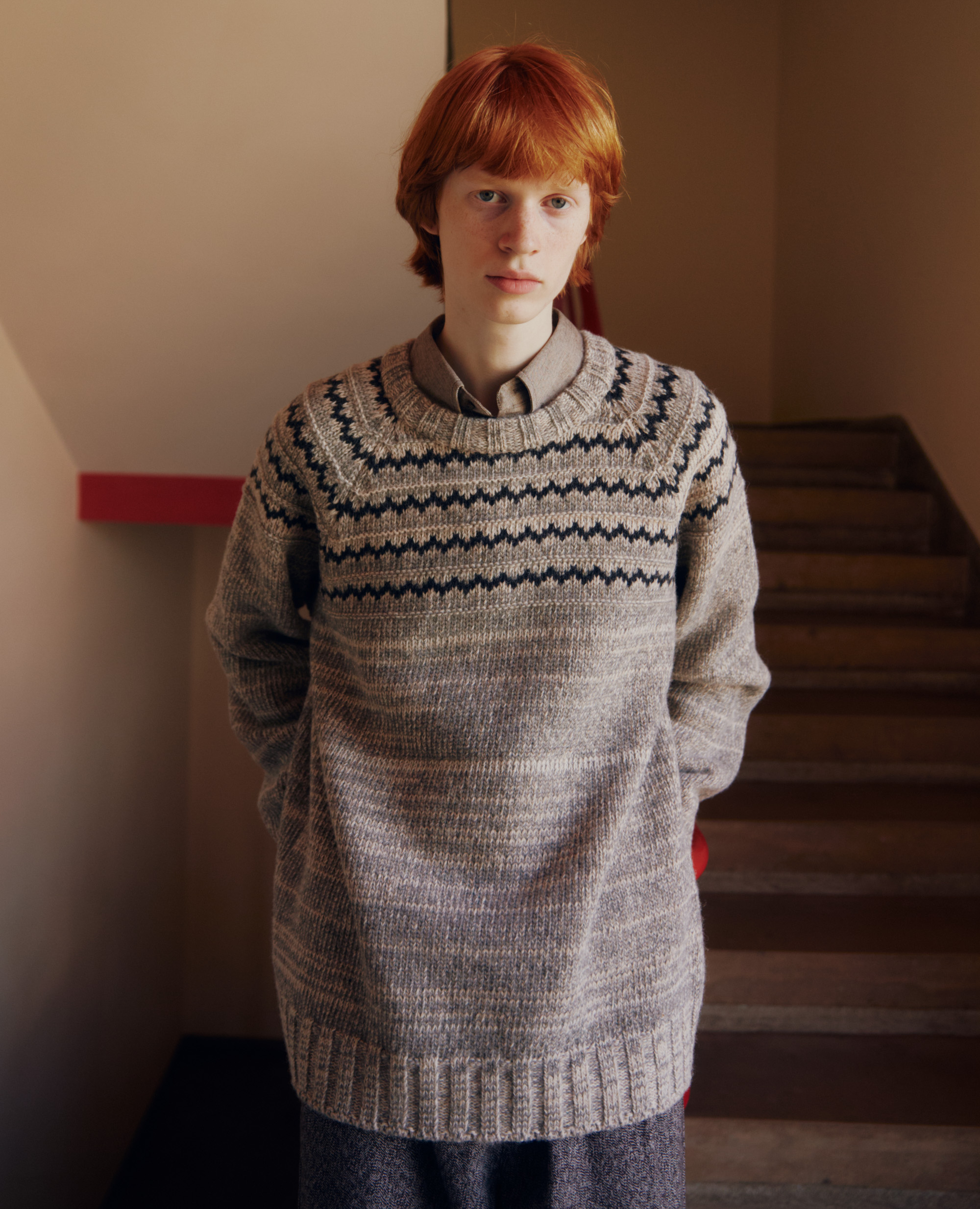 셔틀랜드 울로 짜여진 트위드 스웨터로, 핀란드와 북유럽 전통의 노르딕 패턴에서 영감을 받아 디자인되었습니다.